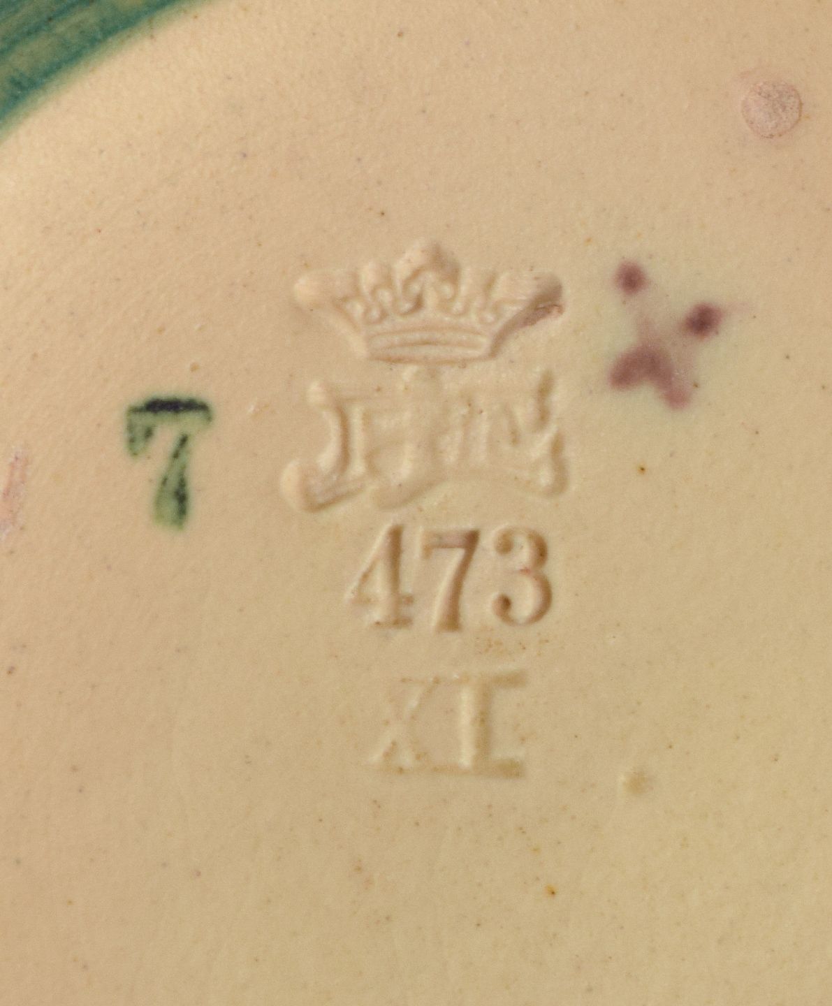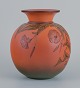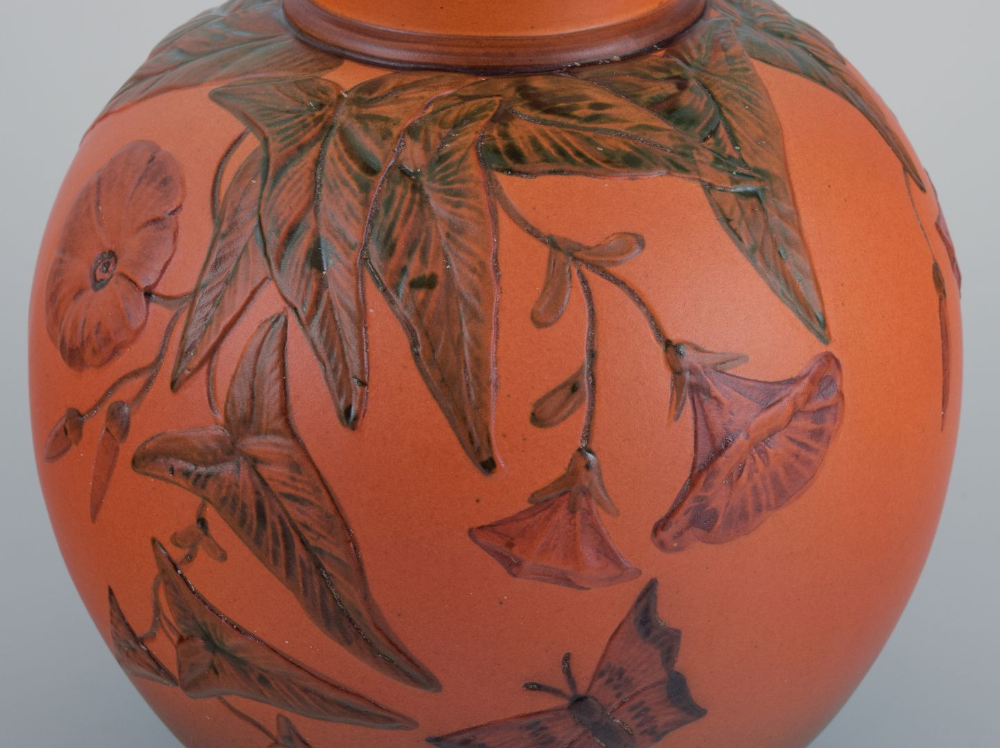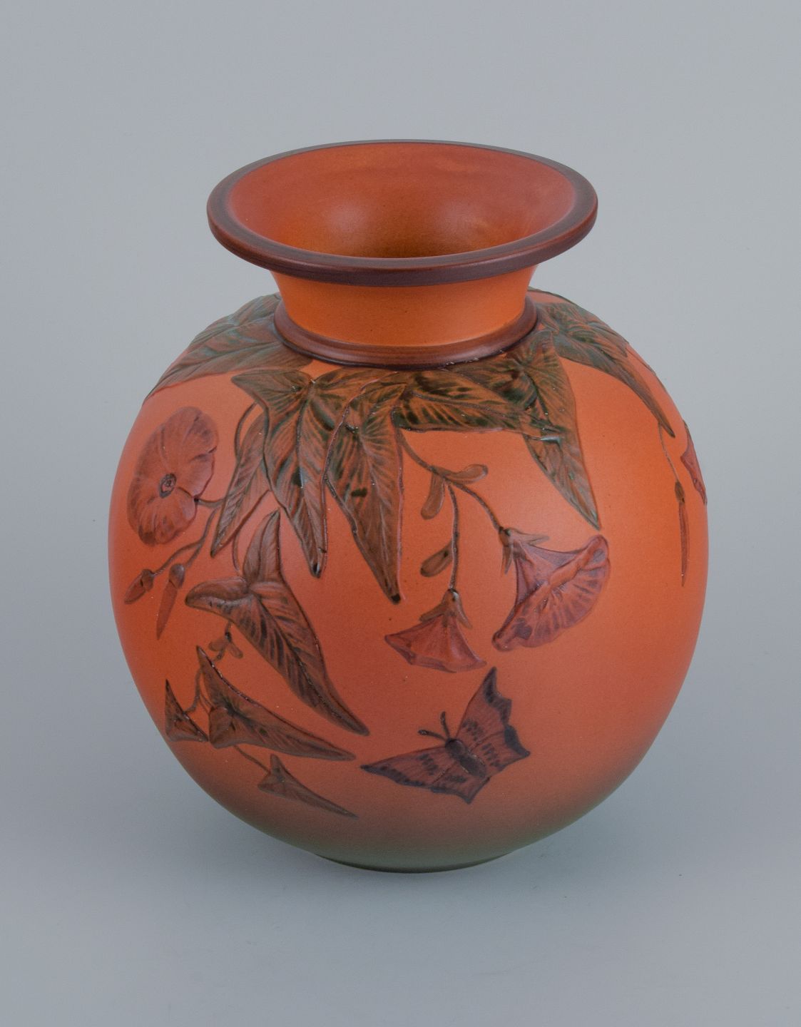 Ipsens Enke, vase med blomster og sommerfugl. Glasur i orange og grønne toner. 1920/30'erne. Modelnummer 473. Stemplet. I perfekt stand. Mål: D 18,0 x H 20,0 cm.
