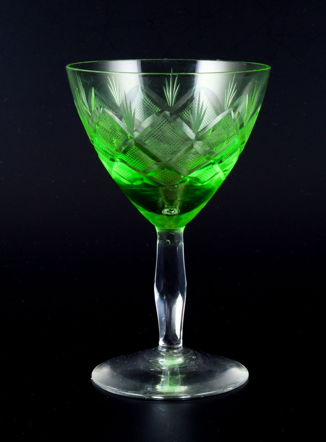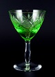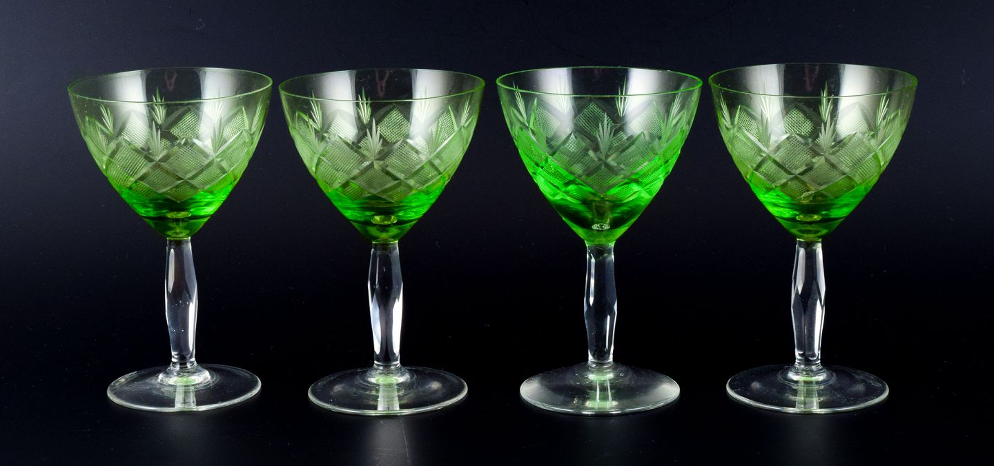 Wien Antik, Lyngby Glas, fire grønne hvidvinglas. Facetslebet stilk og krydsslebet kumme. 30/40’erne. I perfekt stand. Mål: D 7,5 x H 11,5 cm.