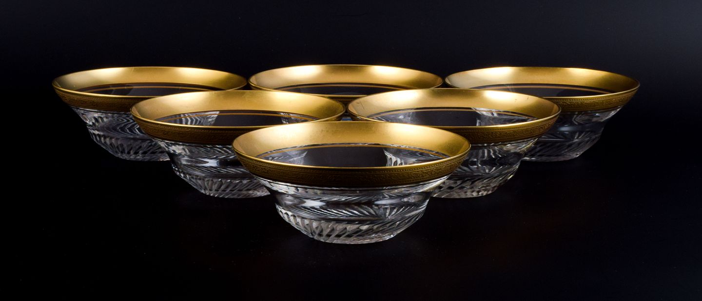 Rimpler Kristall, Zwiesel, Germany, six hand-blown crystal fingerbowls with gold rim decorated with grapes and vine leaves. 1960s. In perfect condition. Dimensions: D 12.5 x H 5.0 cm.