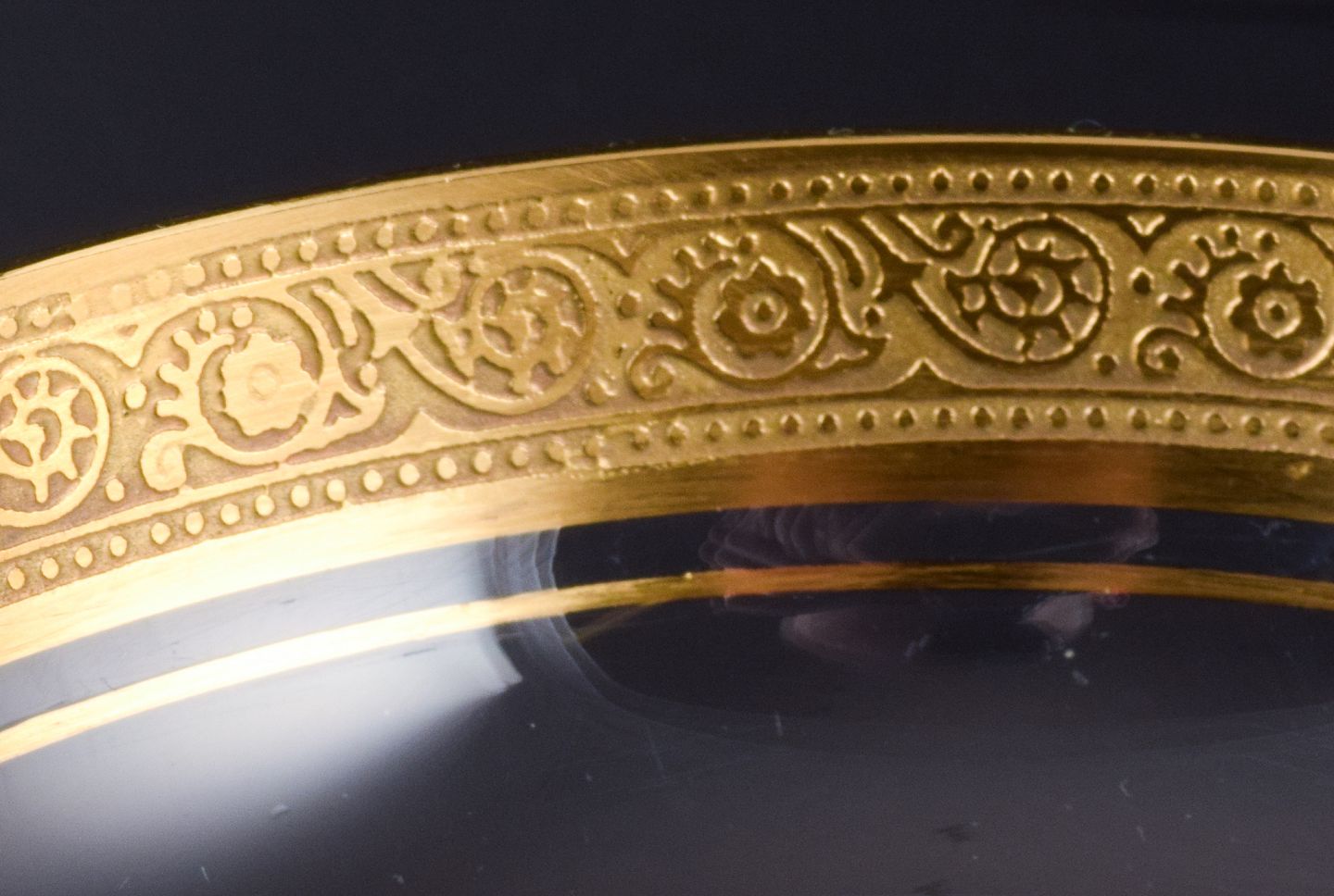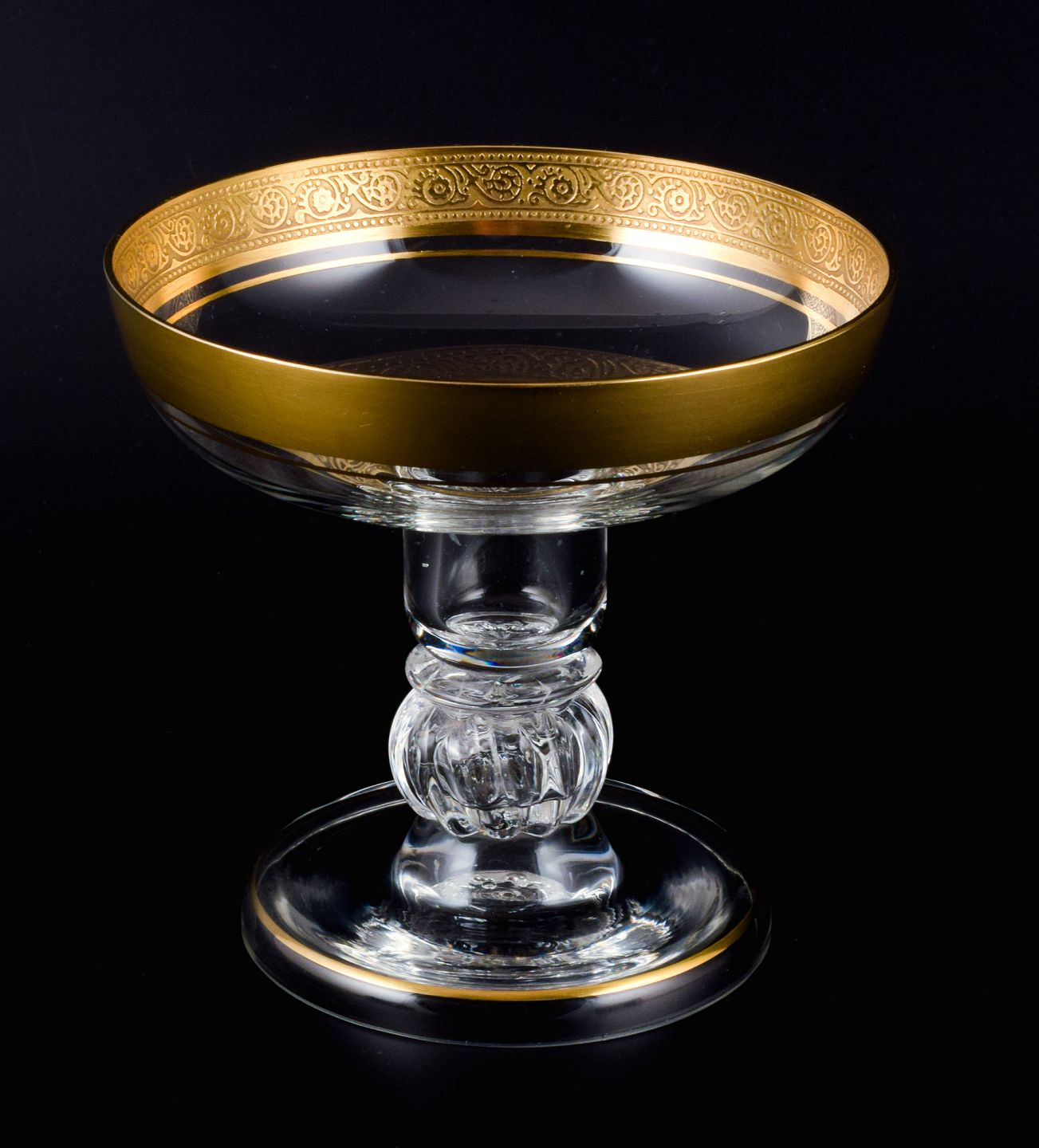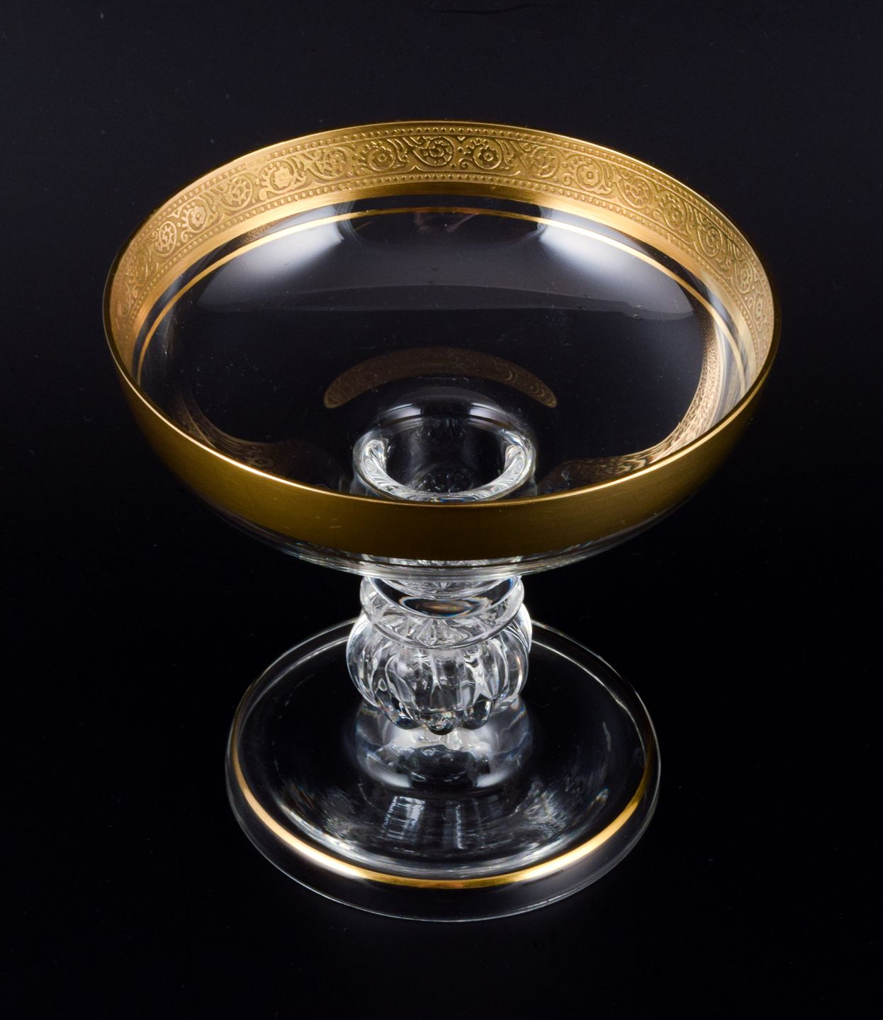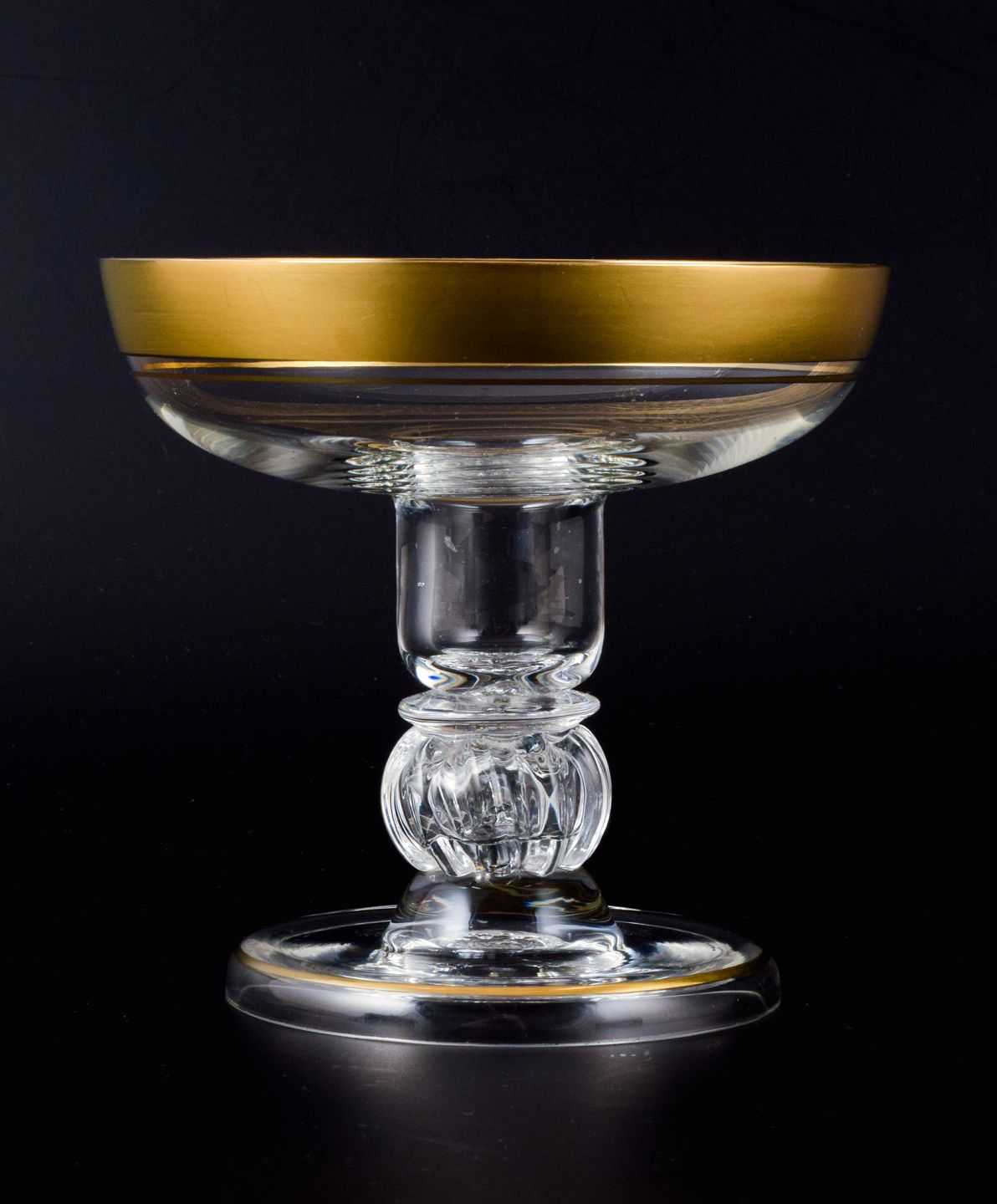 Rimpler Kristall, Zwiesel, Tyskland, mundblæst krystal champagneskål med guldkant dekoreret med vindruer og vinblade.