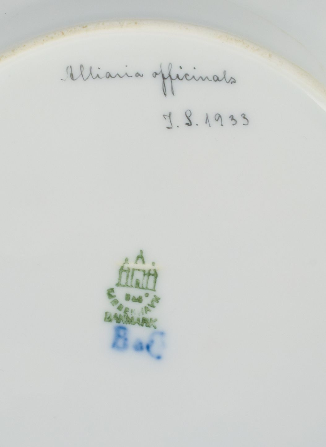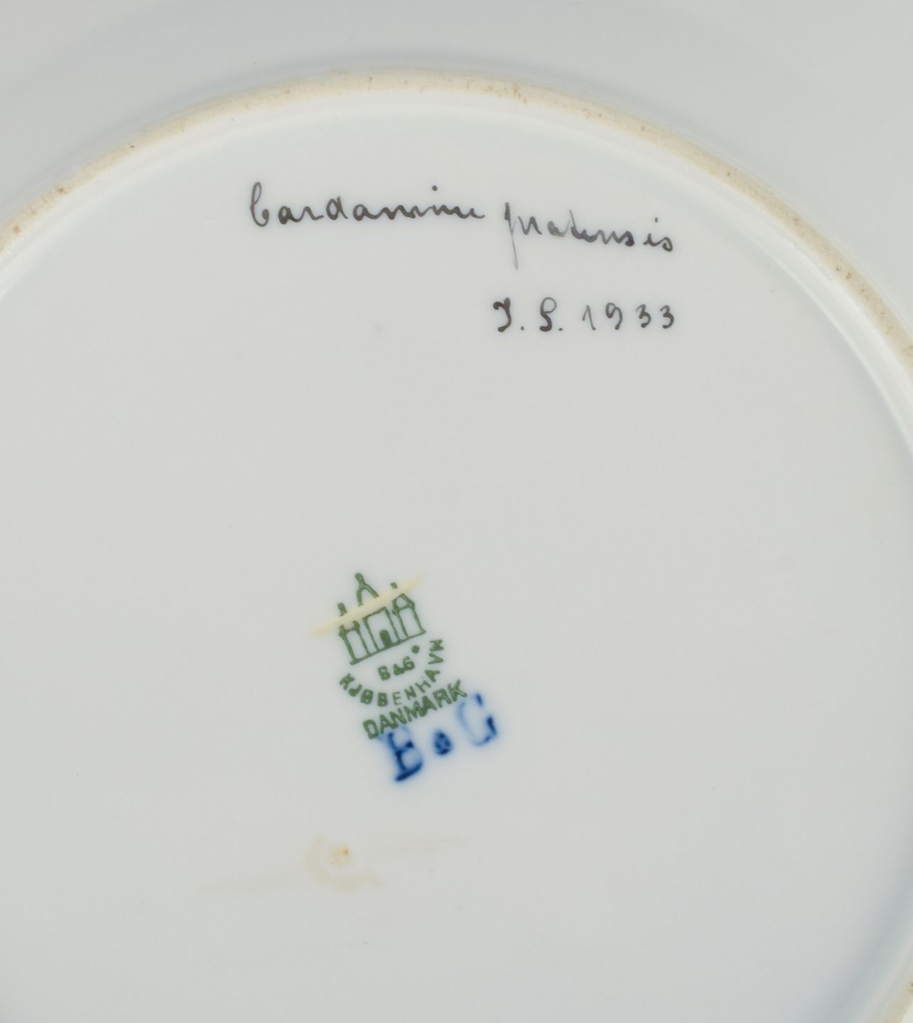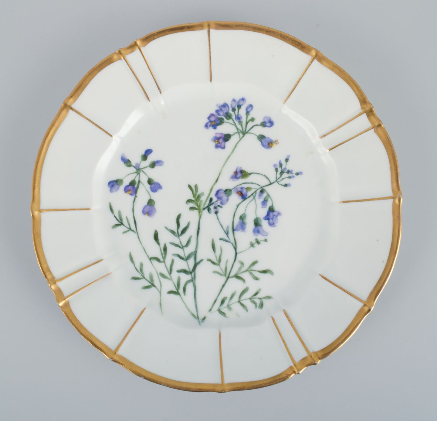 Bing og Grøndahl, fire porcelænstallerkner i Flora Danica stil med gulddekoration. Håndmalet med Flora Danica motiver. 1930’erne I flot stand. Stemplet. Anden sortering. Mål: D 21,5 cm.