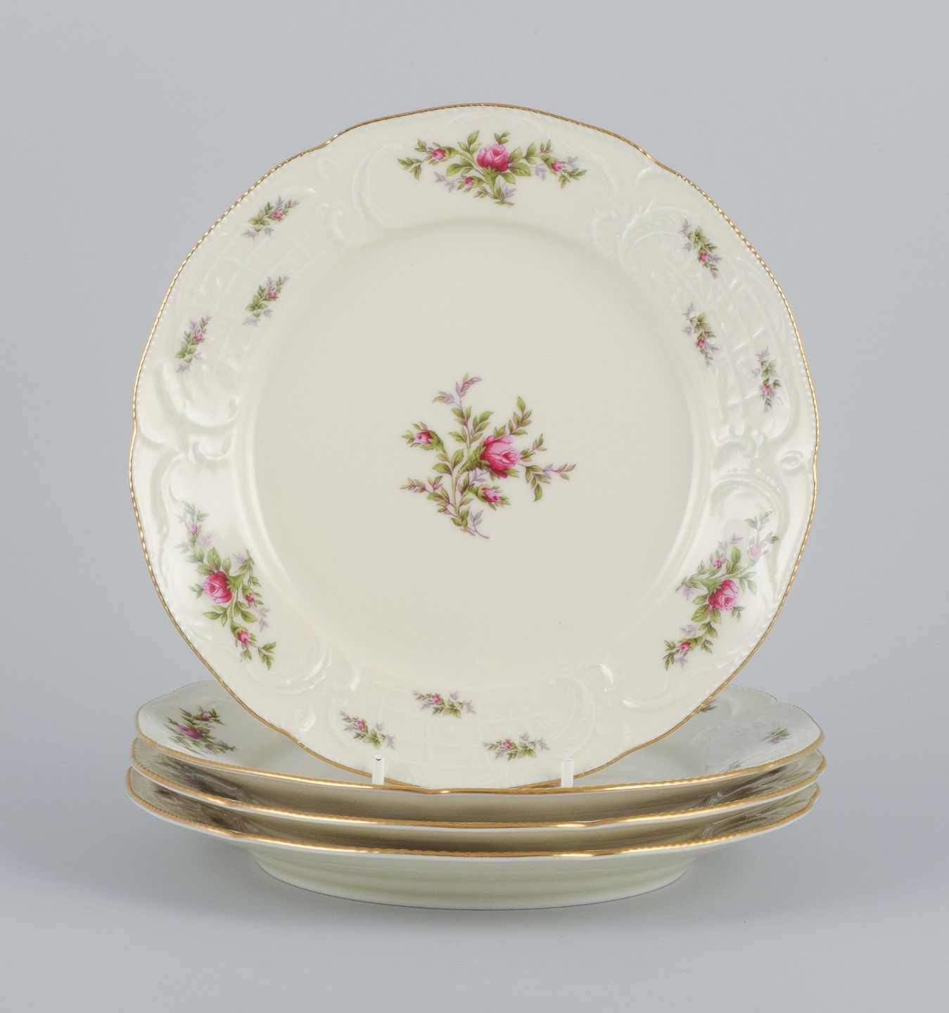 Rosenthal, Tyskland. "Sanssouci", fire cremefarvede tallerkner dekoreret med blomster og gulddekoration.