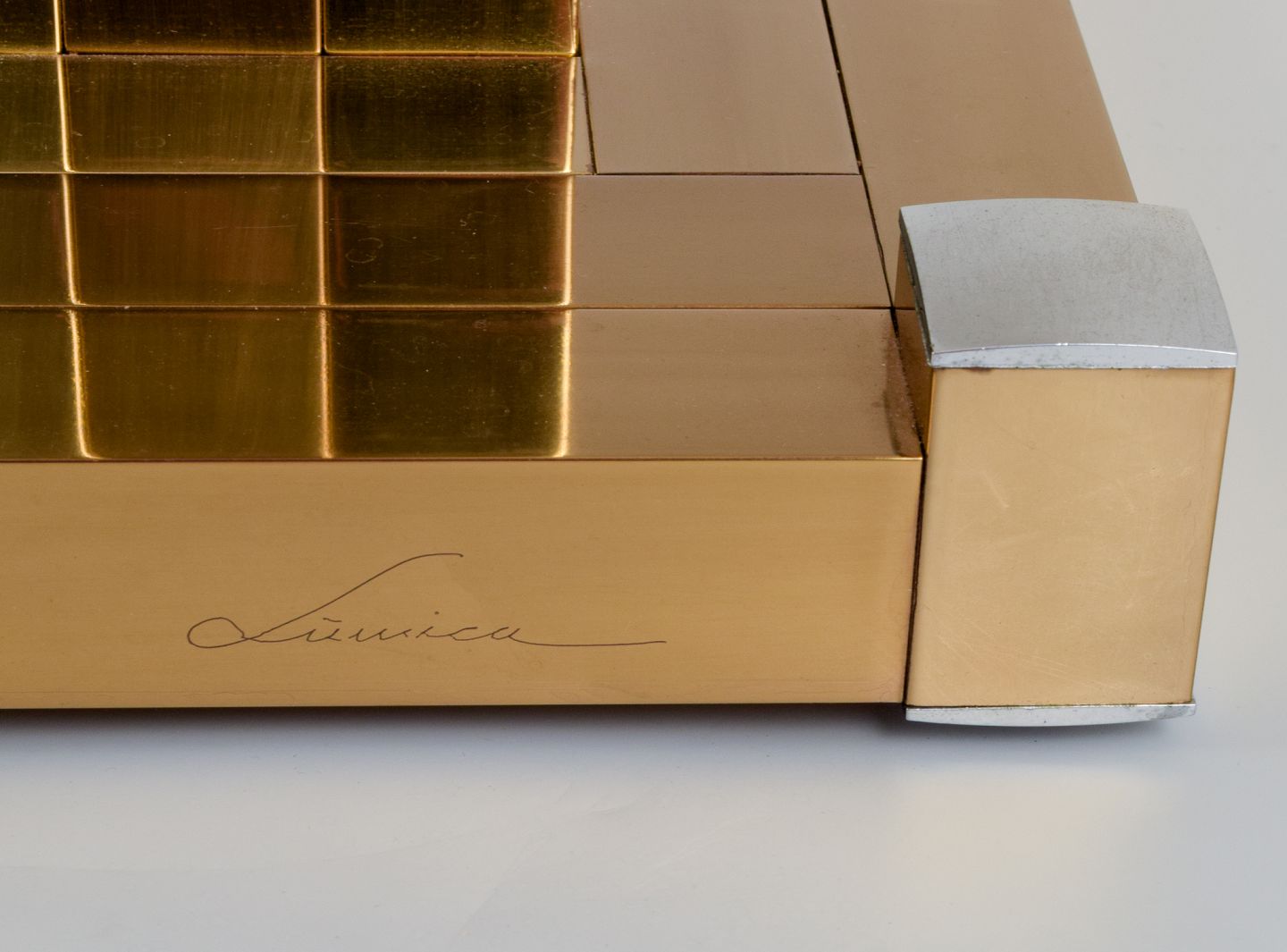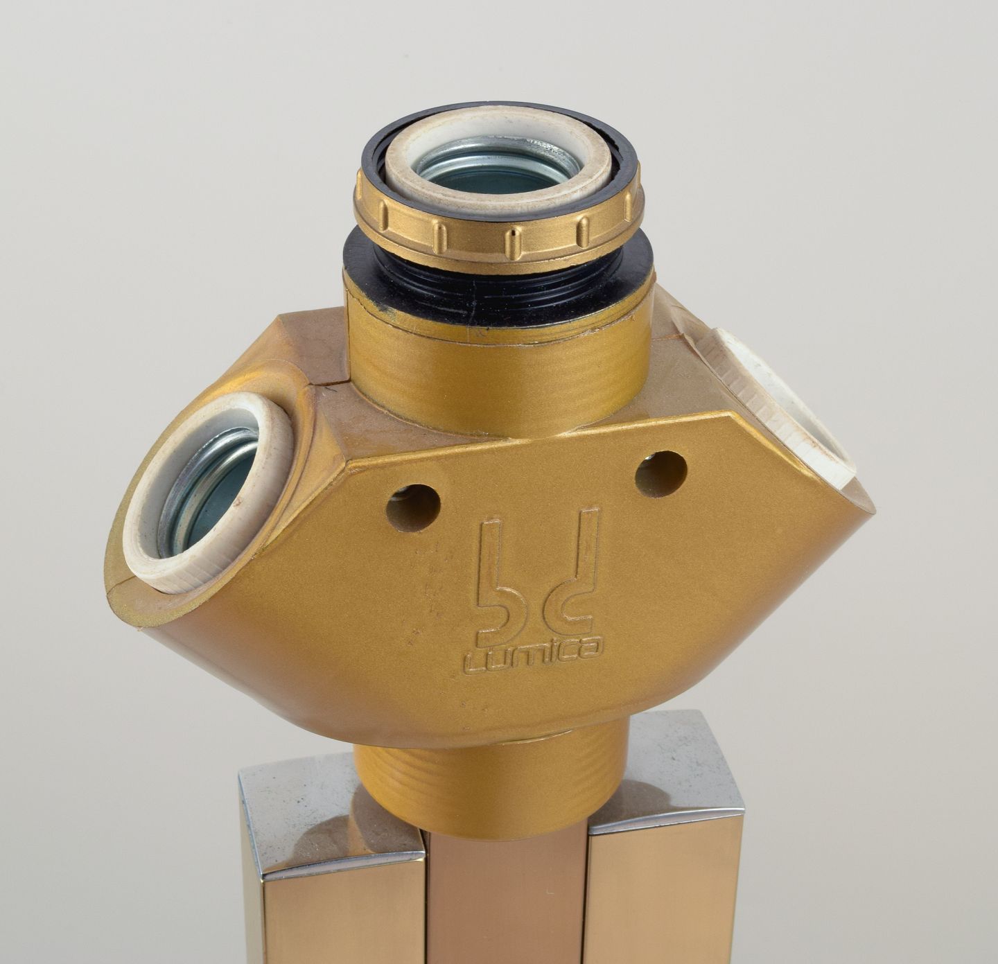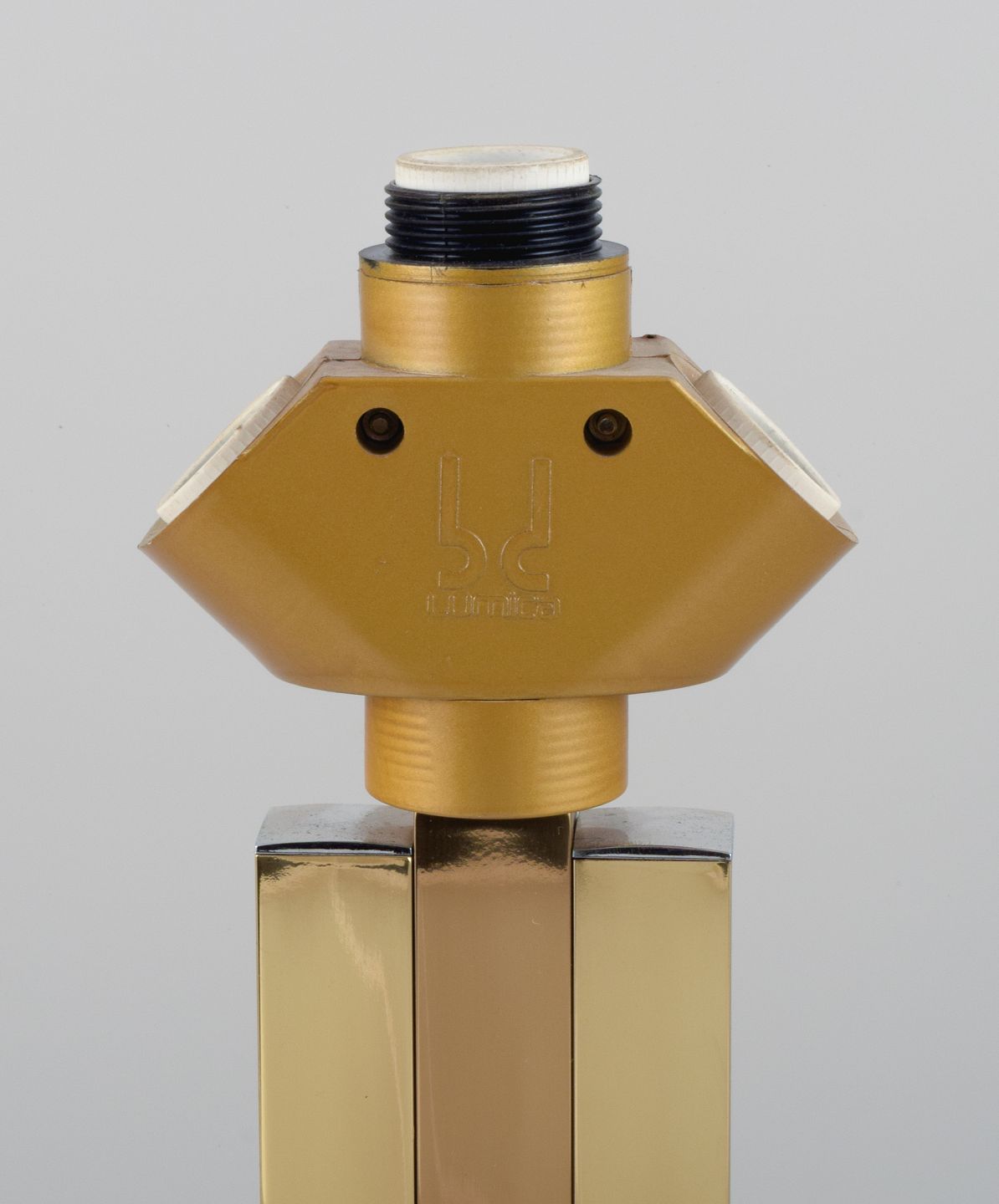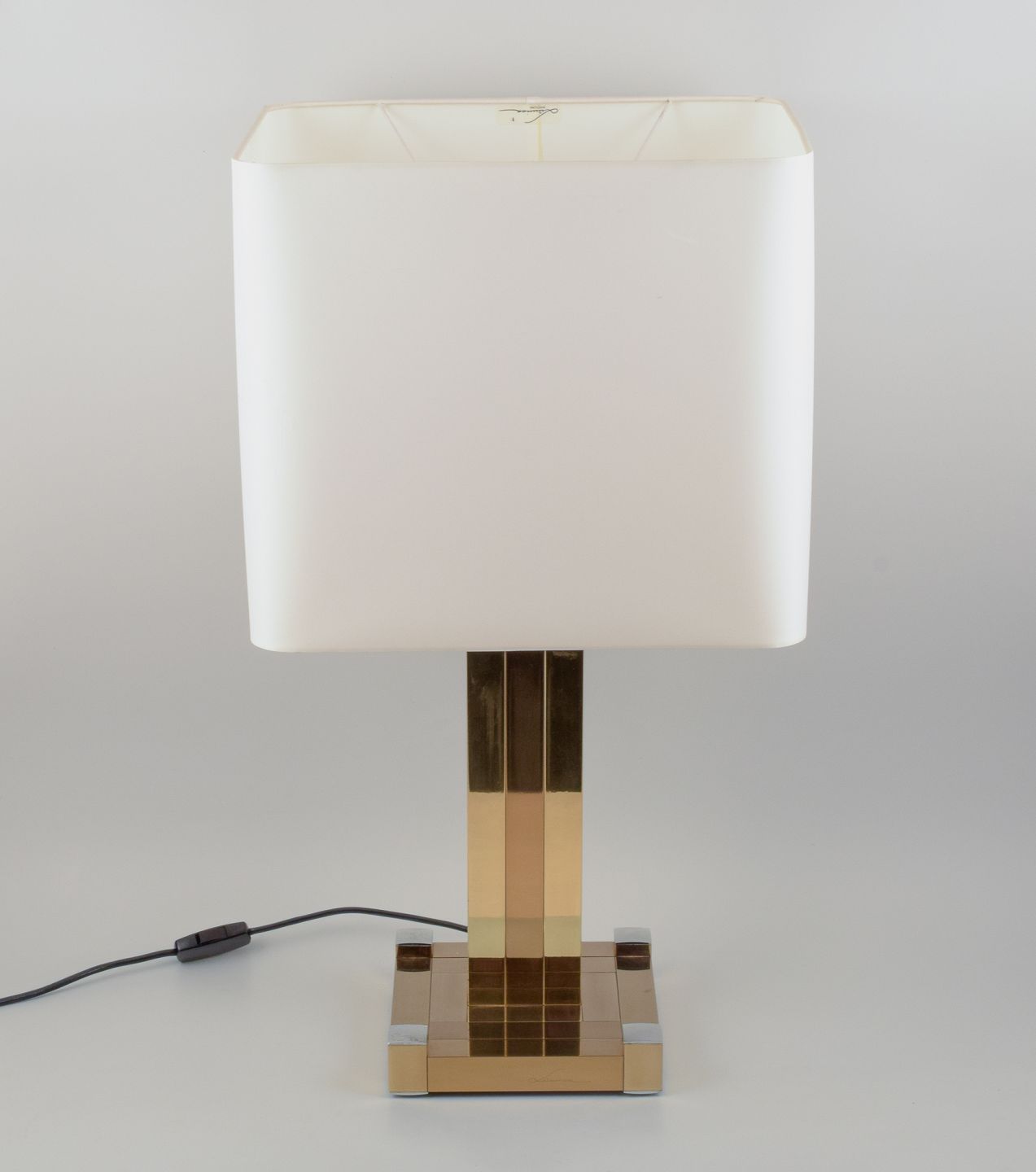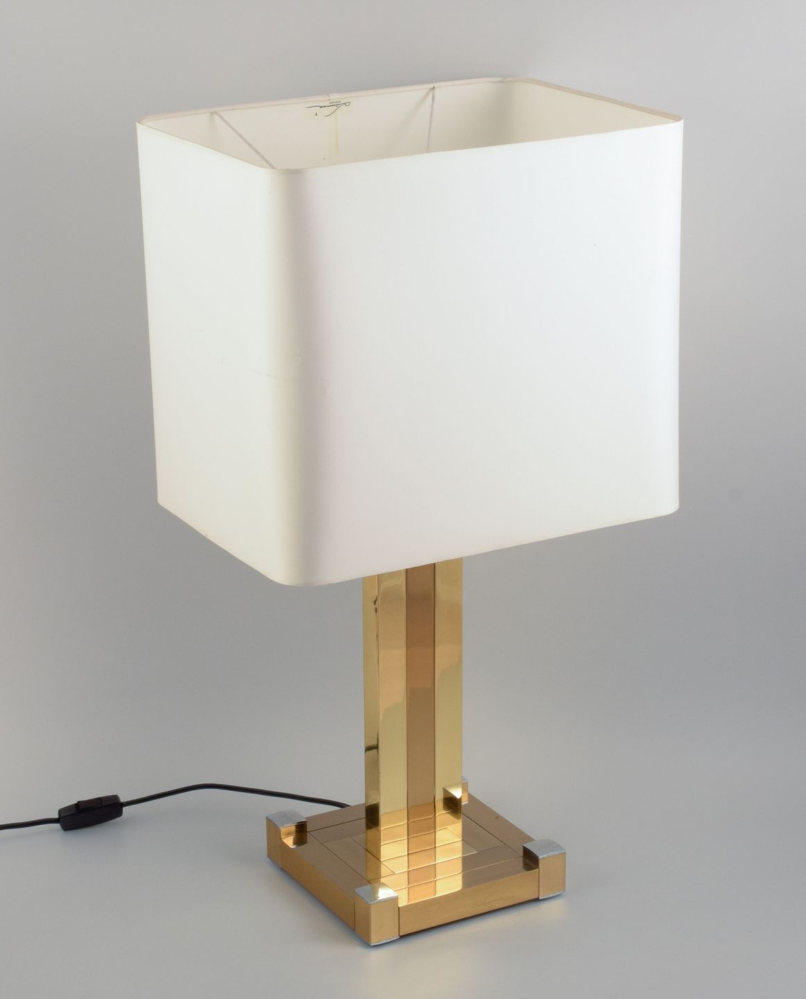 Lumica, Spanien. Stor art deco bordlampe. Stamme og fod i forgyldt metal med forkromede detaljer. Skærm i lyst stof. Tre udtag.