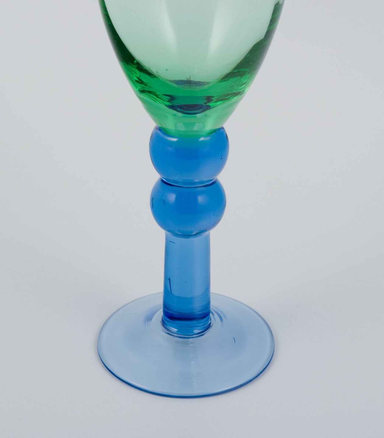 Skandinavisk glaskunstner, et sæt på seks mundblæste champagneglas i grønt og blåt glas. Sent 1900-tallet. I perfekt stand. Mål: H 22,0 x D 6,0 cm.