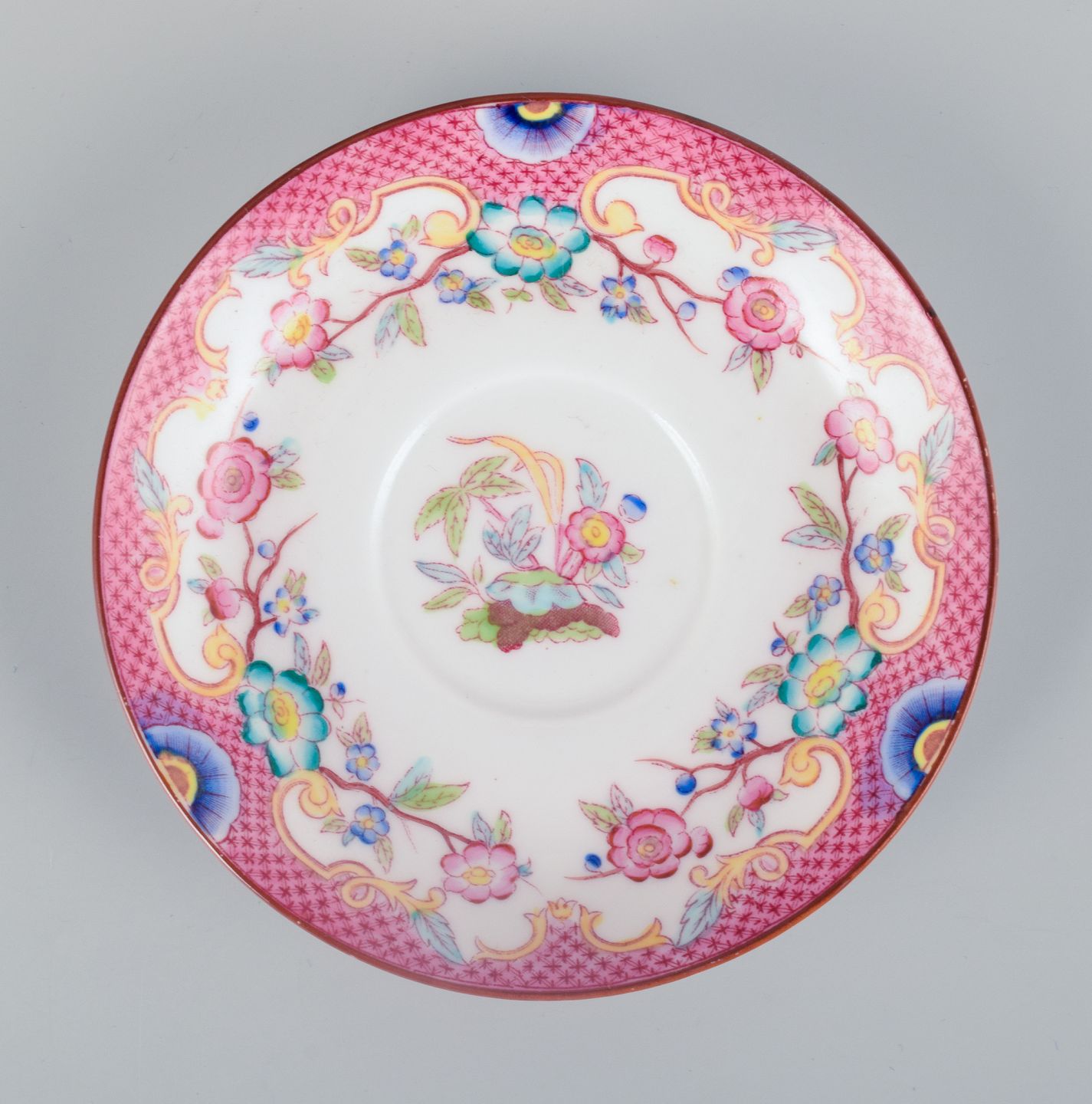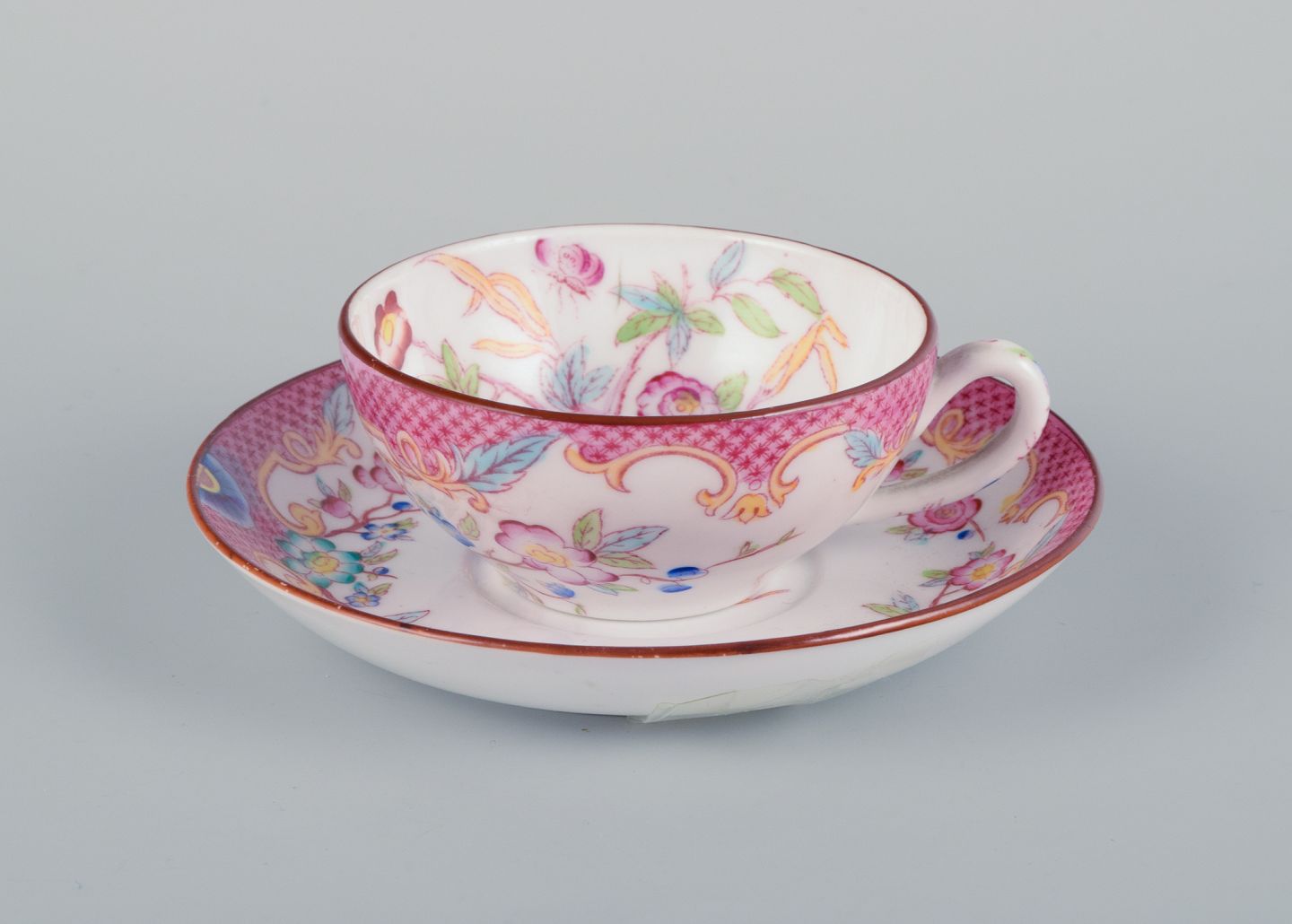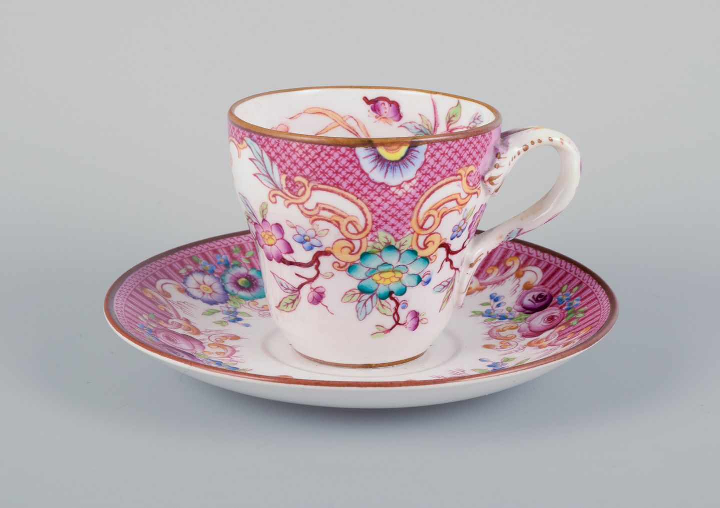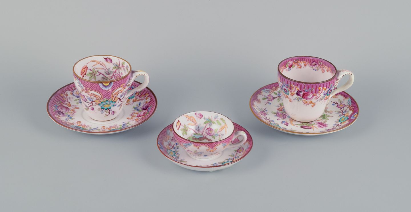 Saargemund, Frankrig, to par kaffekopper og en tekop i porcelæn, håndmalet med blomstermotiver.