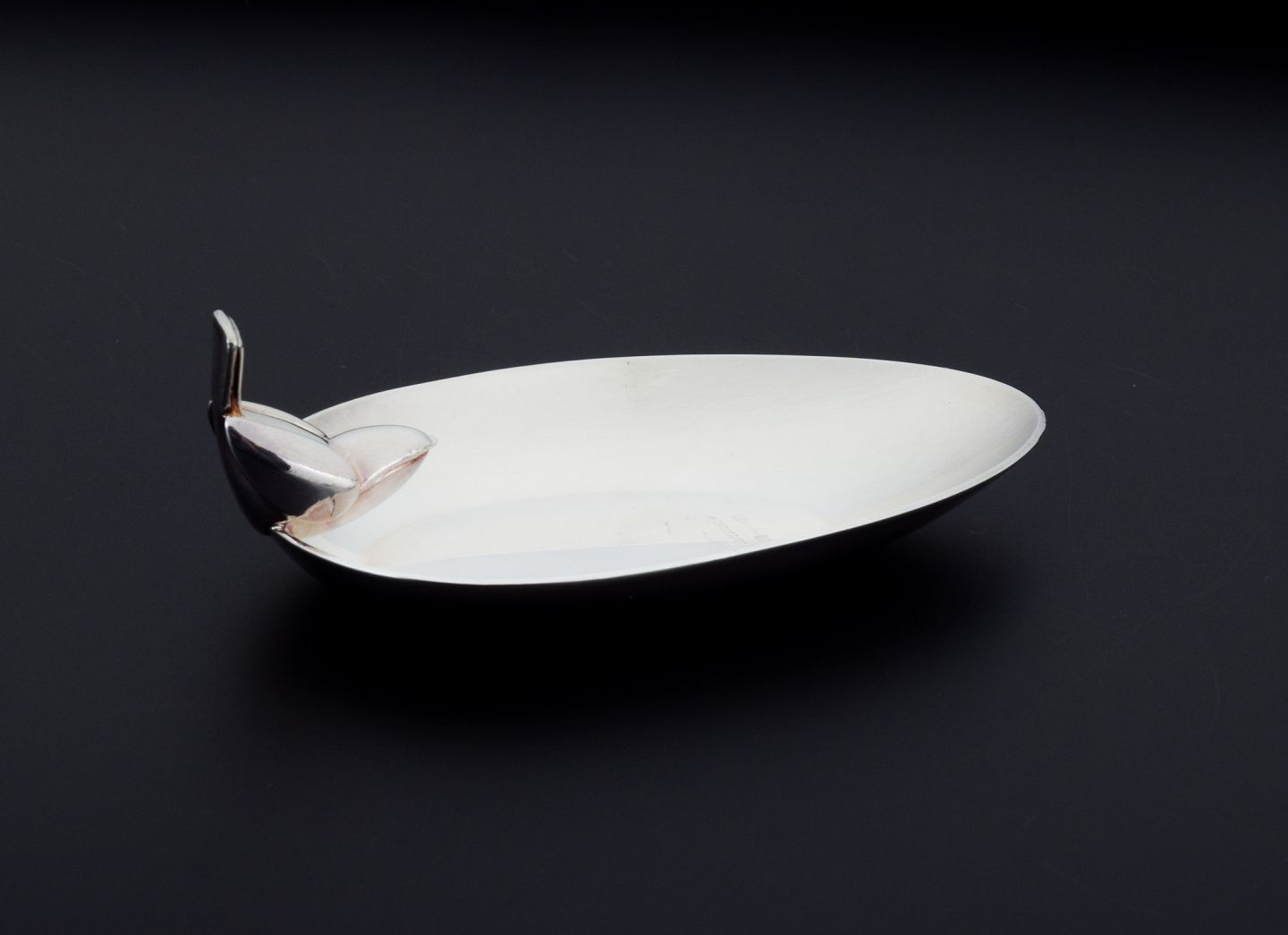 Christofle, Paris, Frankrig, lille modernistisk skål med fugl på toppen. Nysølv. Midt 1900-tallet. Stemplet. Perfekt stand. Mål: L 12,5 x D 6,8 x H 2,0 cm.