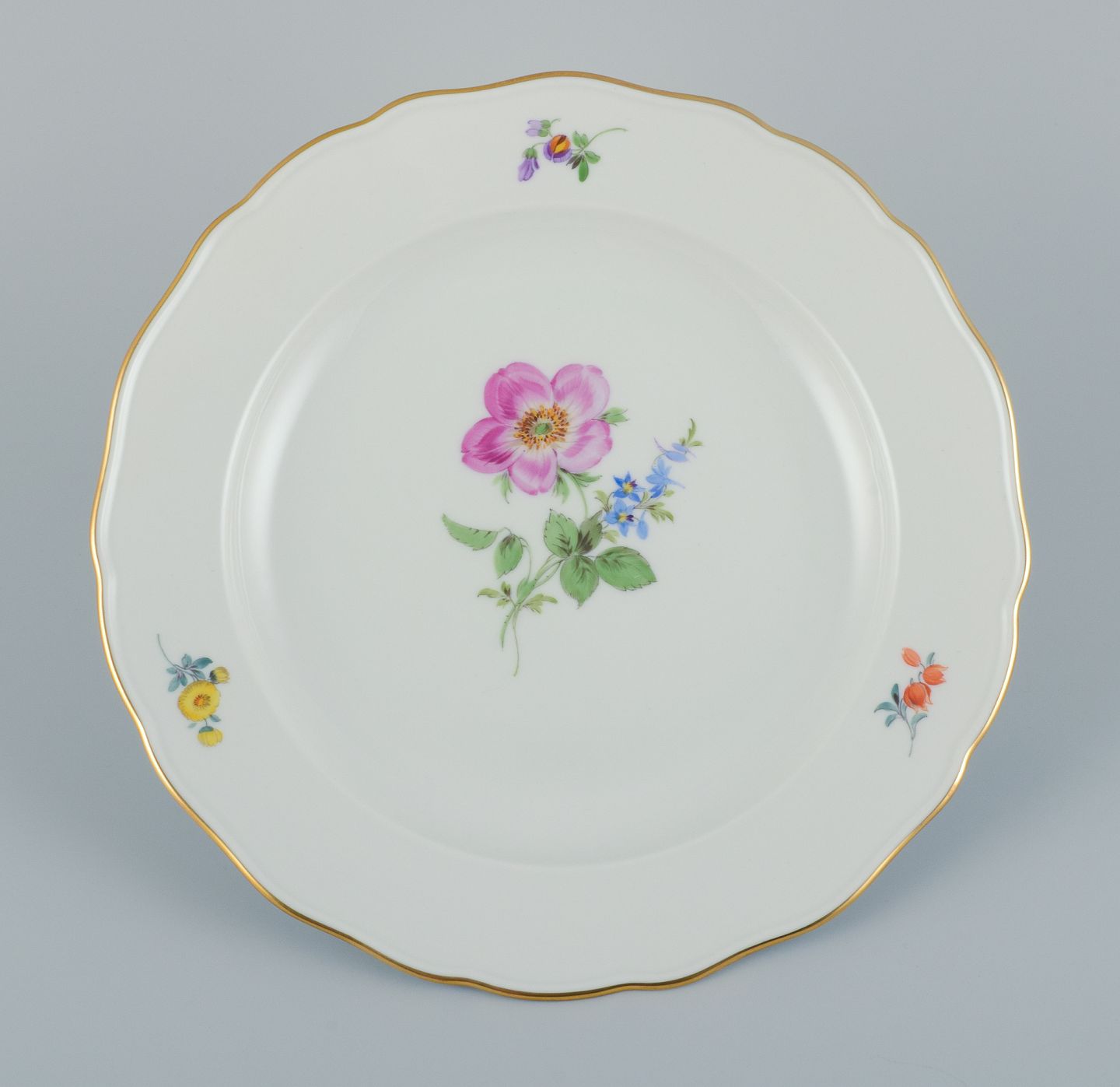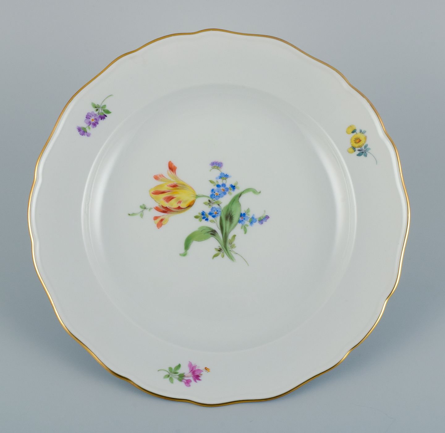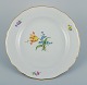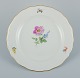 Meissen, Tyskland. Tre store middagstallerkner i porcelæn håndmalet med forskellige blomstermotiver og guldkant.