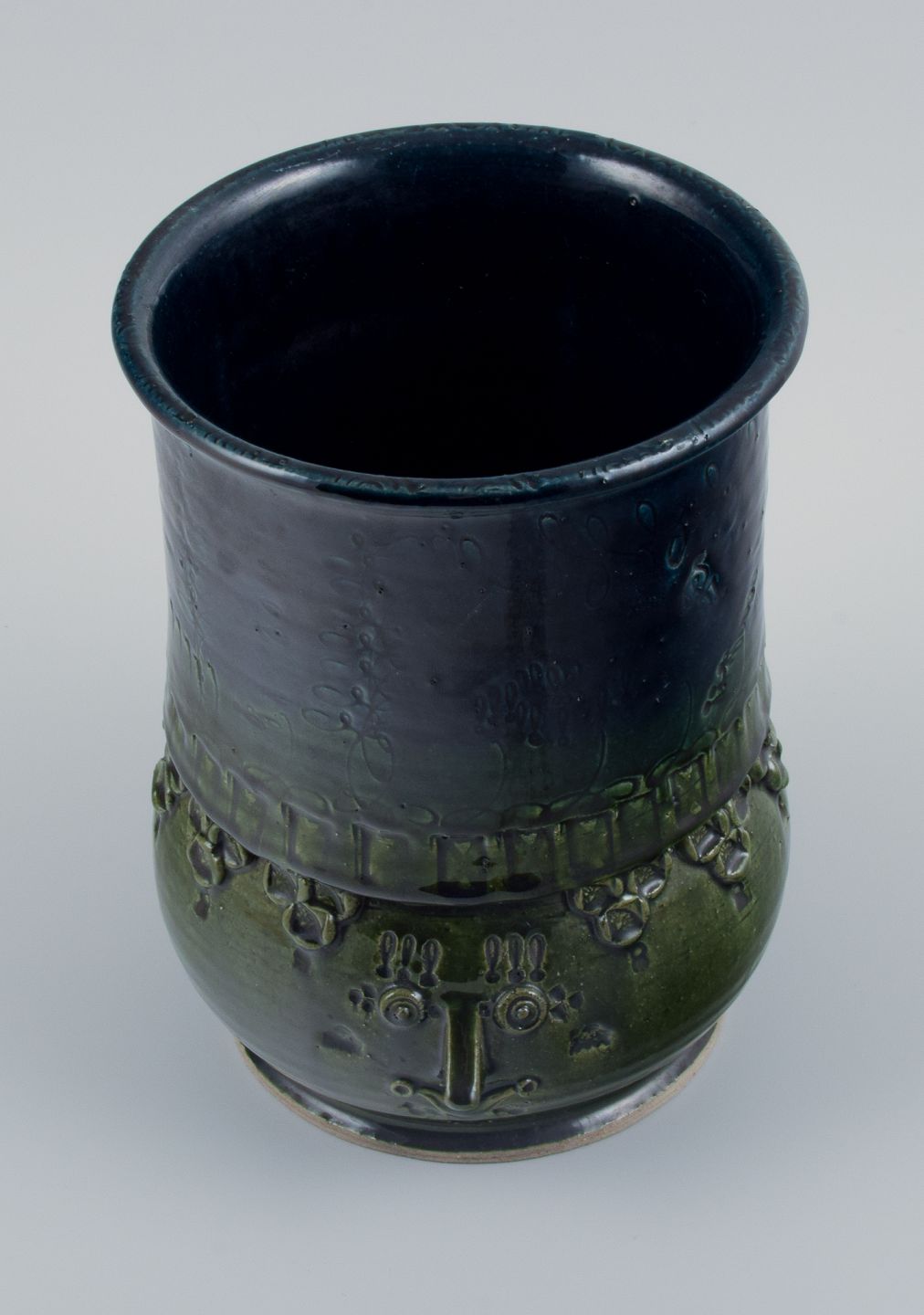 Bjørn Wiinblad (1918-2006), Det Blå Hus, stor keramikvase i grøn og blå glasur med ansigt og hank.