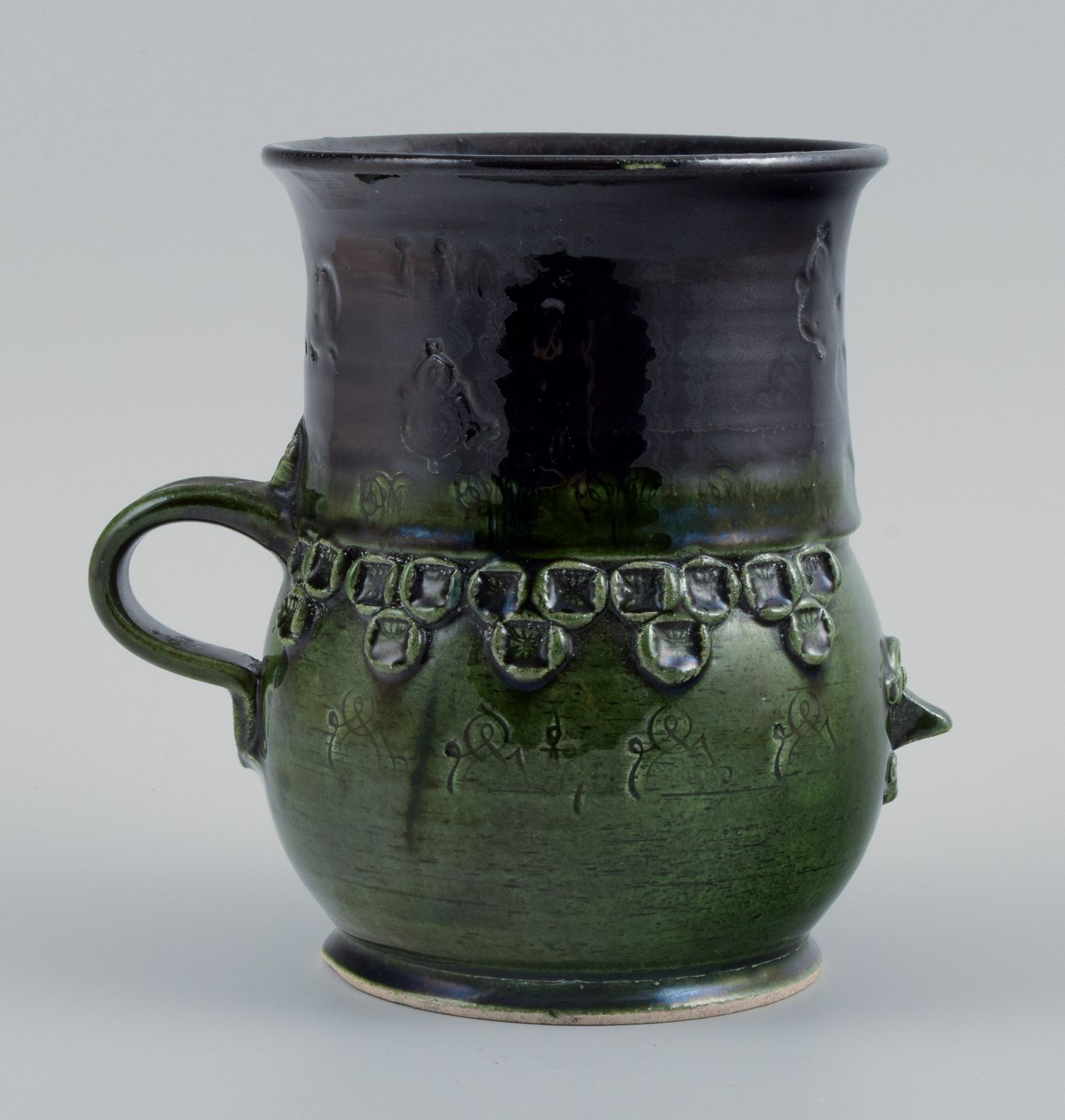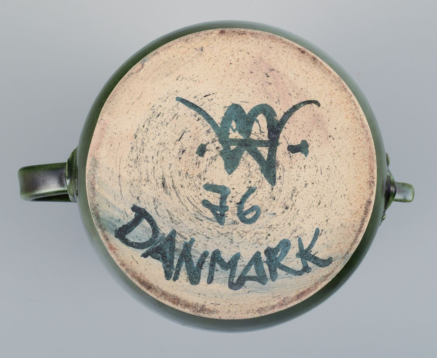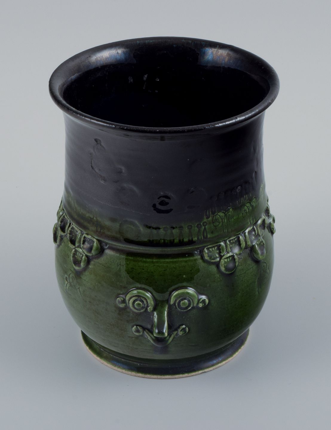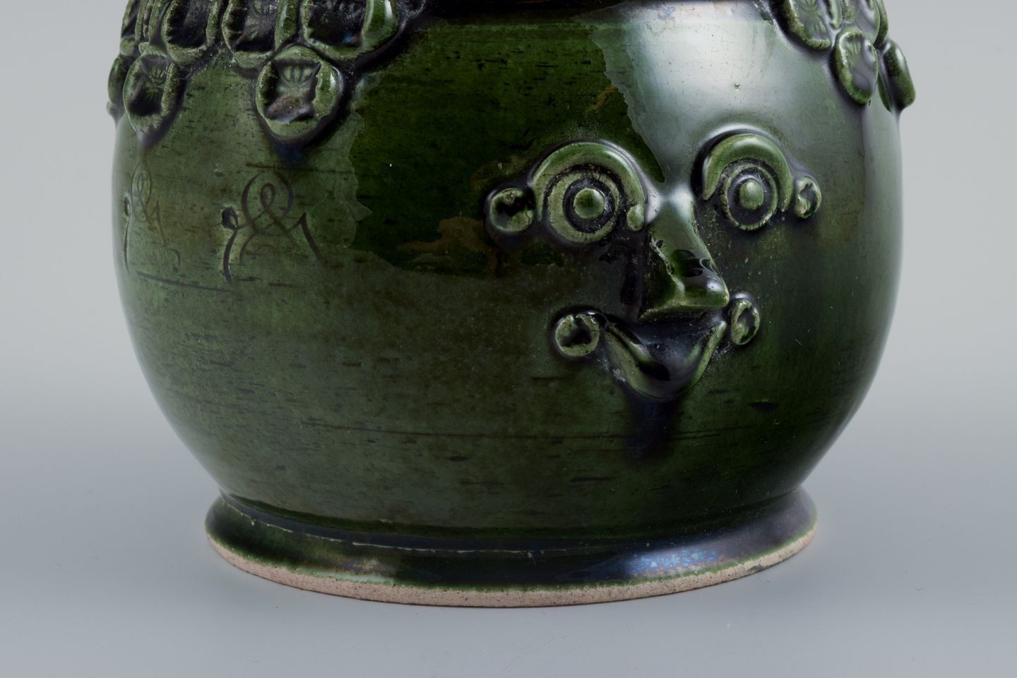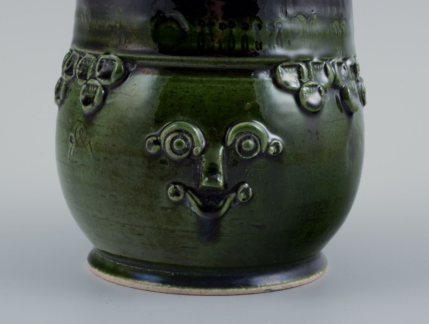 Bjørn Wiinblad (1918-2006), Det Blå Hus, stor keramikvase i grøn og blå glasur med ansigt og hank. 1976. I perfekt stand. Stemplet. Mål: H 16,5 x D 12,5 cm.