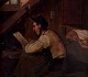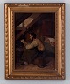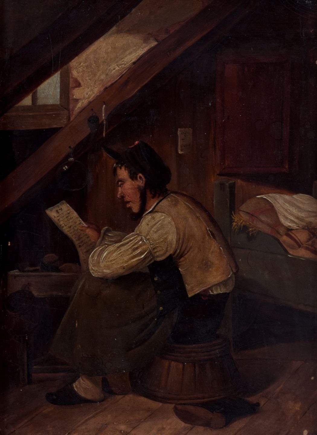Oliemaleri på plade, nordeuropæisk maler. 1800-tallet. Eksteriør fra loftskammer med læsende mand. Antageligt usigneret. I god stand. Mål plade: B 14,0 x H 19,0 cm. Totalmål: 20,0 x 25,5 cm.