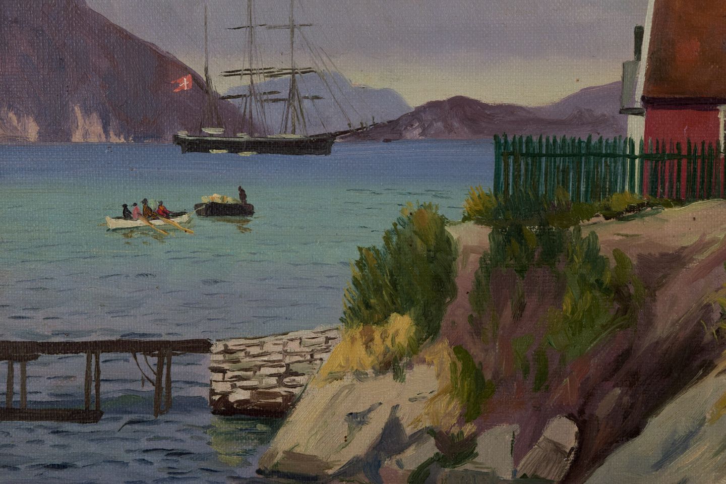 Emanuel Aage Petersen (1894-1948), Oliemaleri på lærred. Grønlandsk bygd. I baggrunden Kongeskibet. 1923. I perfekt stand. Lysmål: 42,0 x 29,5 cm. Totalmål: 51,5 x 39,0 cm.