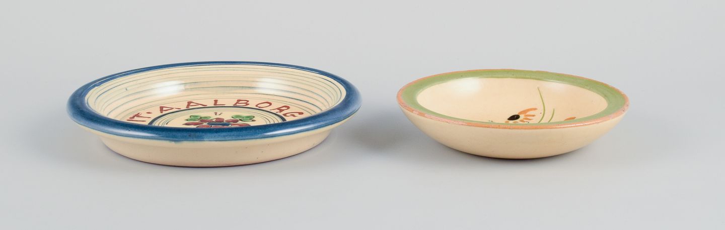 Kähler, to lave skåle. Aalborg Taffel Akvavit. 1940’erne. I flot stand, den lille skål med glasurafslag i kanten. Stemplet. Stor skål: D 17,3 cm. x H 2,7 cm.