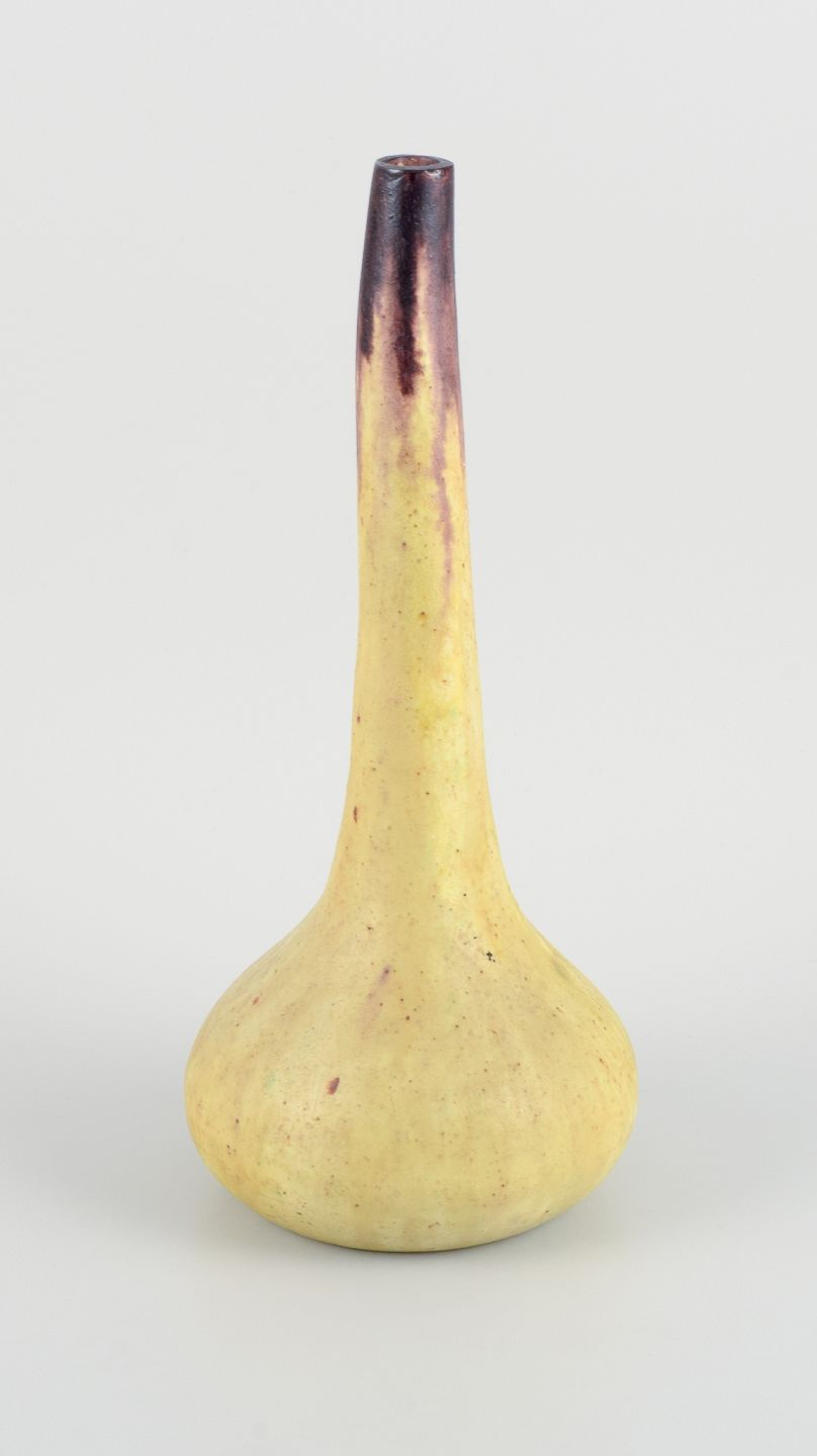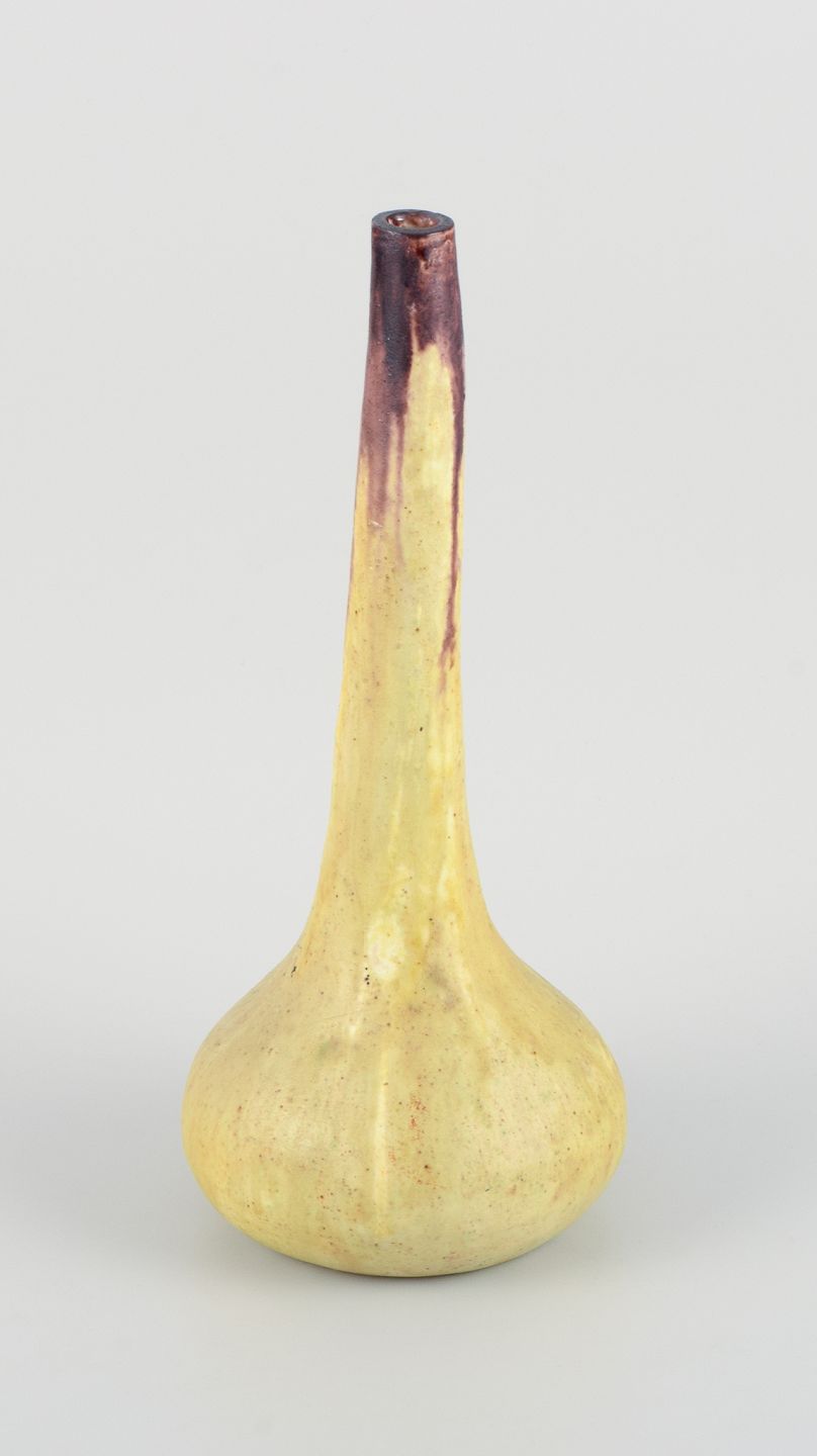 Europæisk studiokeramiker, høj smalhalset unika keramikvase i gul og brun dekoration. 1960’erne. Utydeligt signeret. I perfekt stand. Mål: H 32,0 cm. x D 14,0 cm.