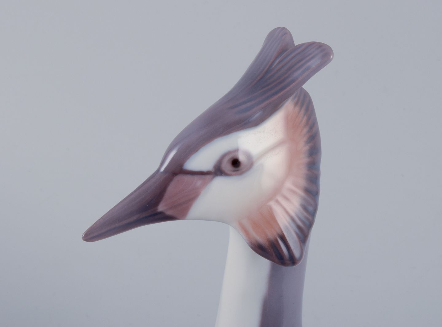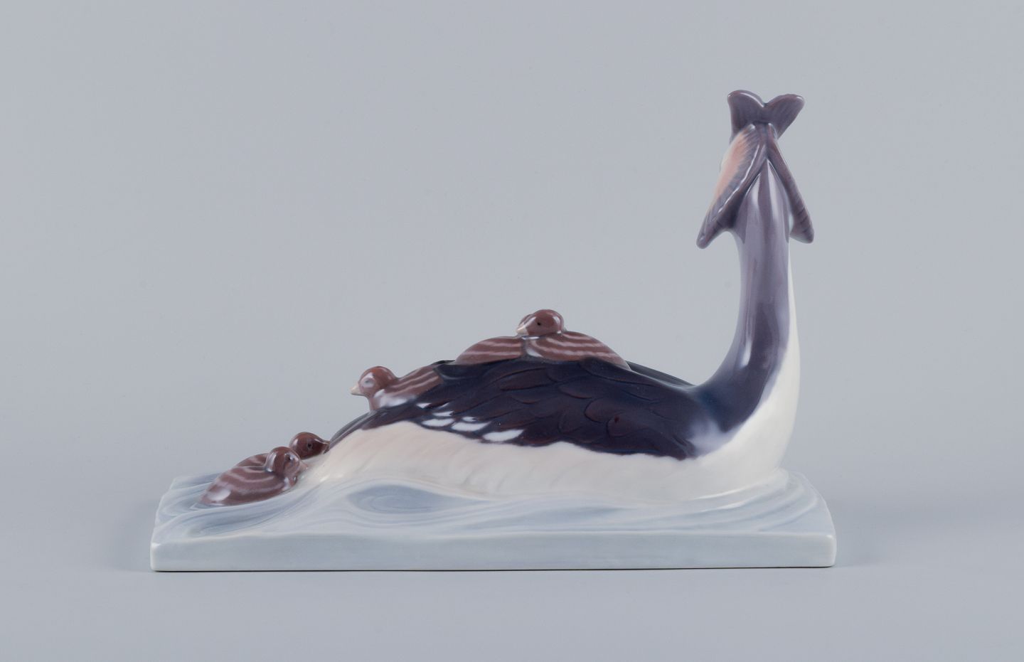Bing og Grøndahl. Toppet lappedykker med ællinger. Nr. 2439. Første sortering. Perfekt stand. Stemplet. Mål: Længde 28,0 cm. Højde 19 cm.