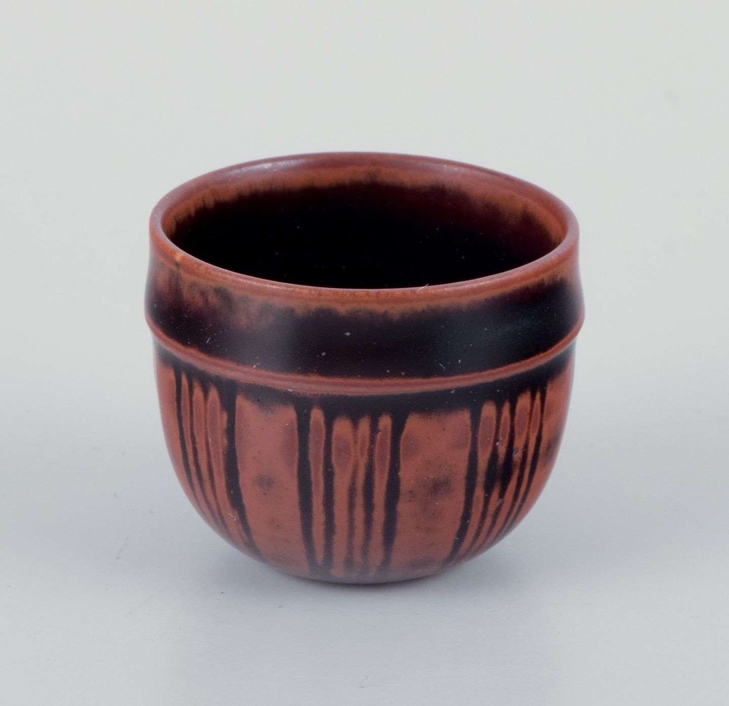 Stig Lindberg (1916-82) for Gustavsberg, Studio Hand miniature skål med glasur i brune nuancer. 1960’erne. Signeret. Perfekt stand. Mål: H 30 mm. X D 33 mm.