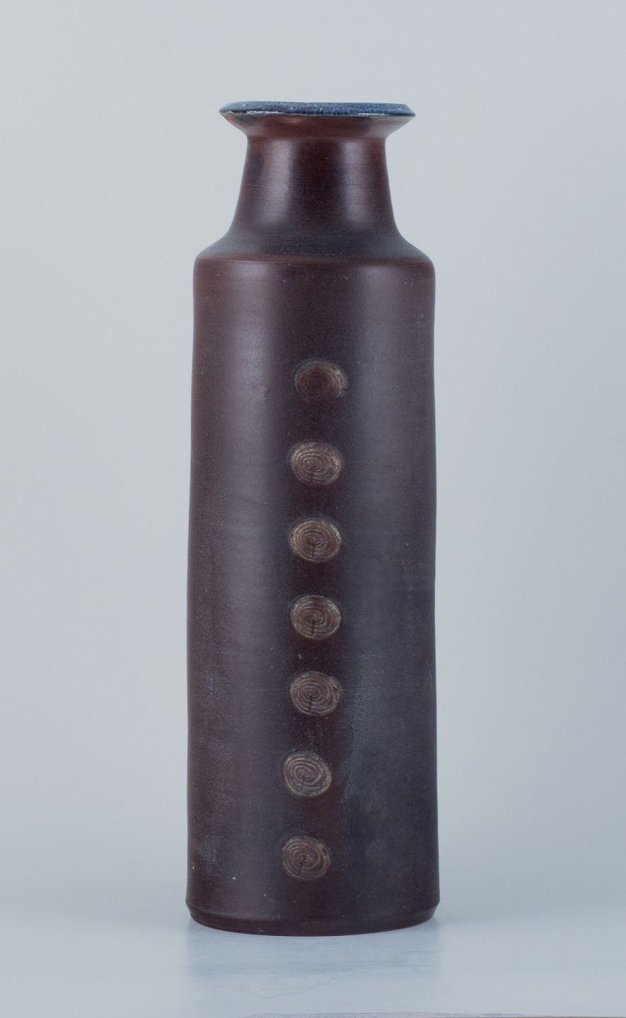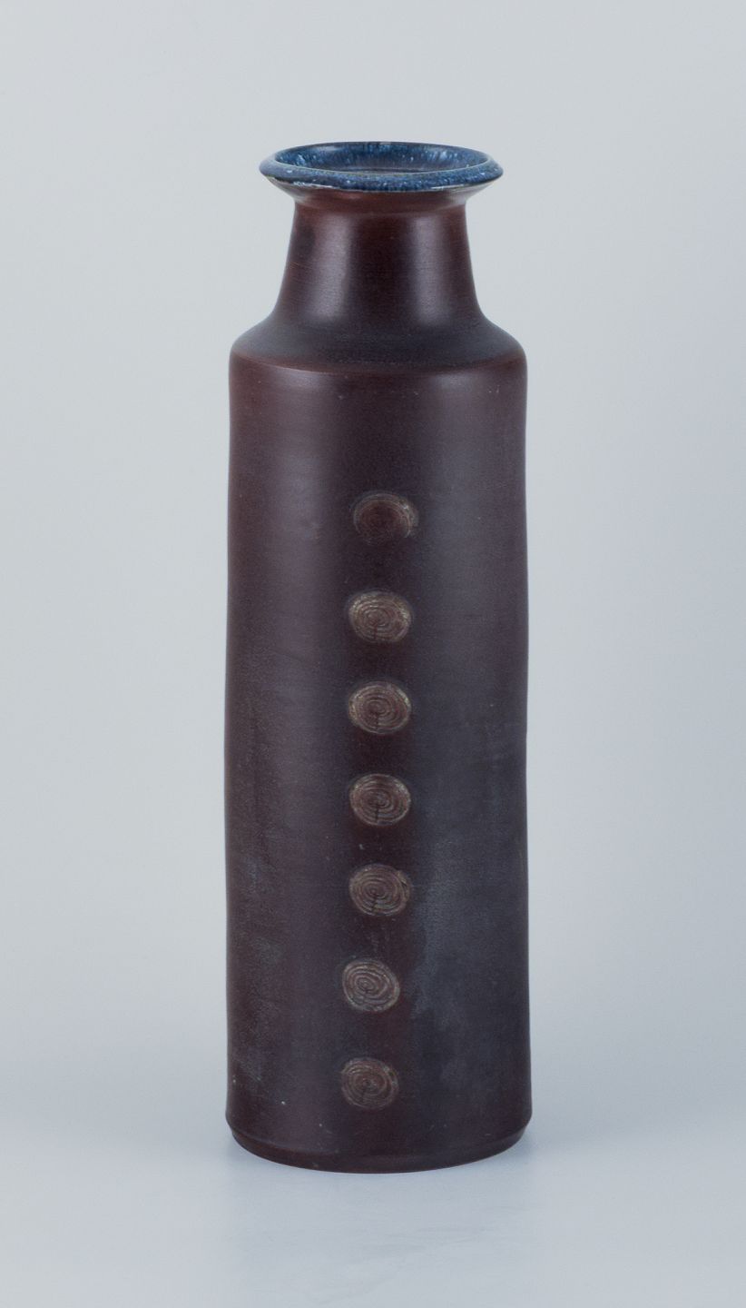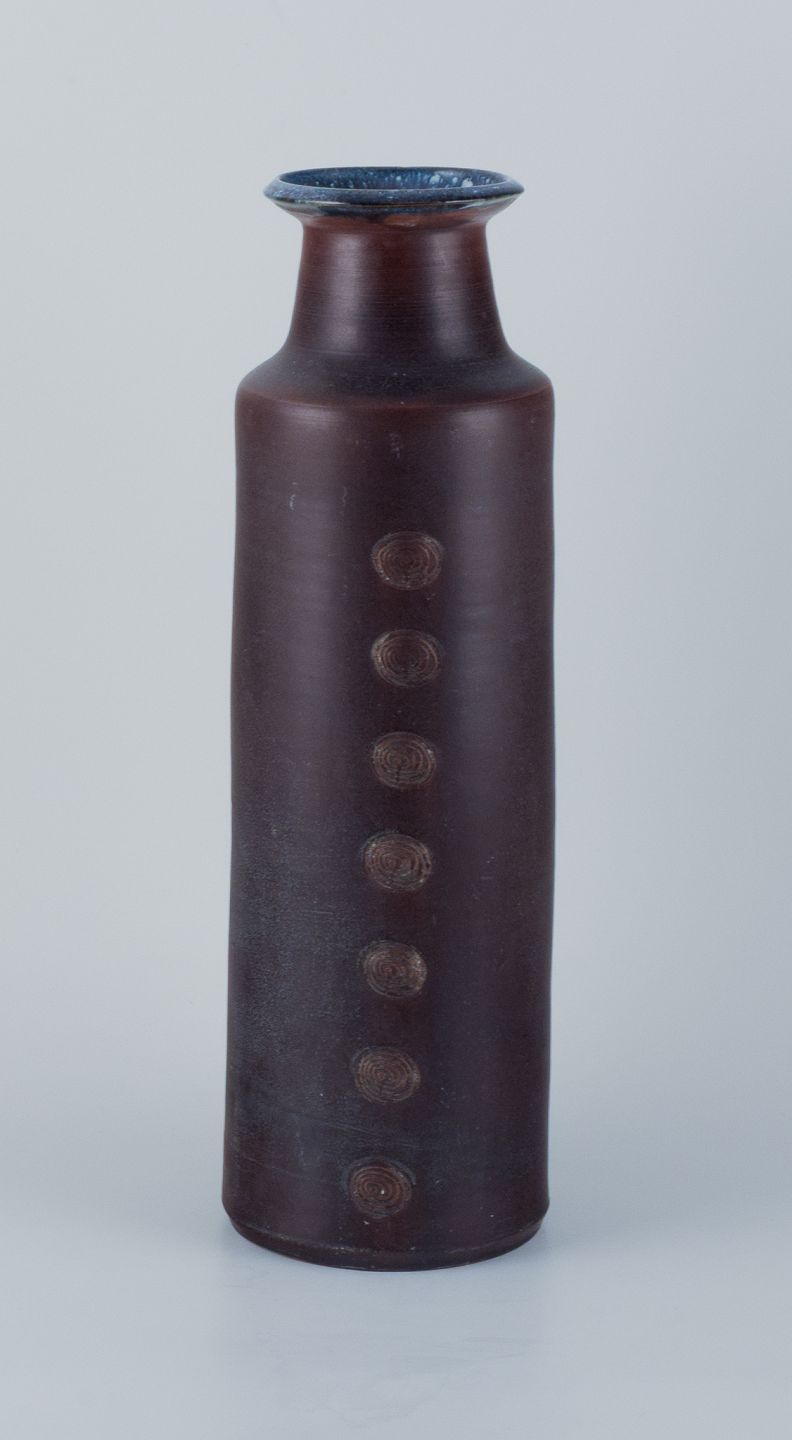 Stor keramik gulvvase i modernistisk stil med indridset ornamentik. Glasur i blåbrune toner.