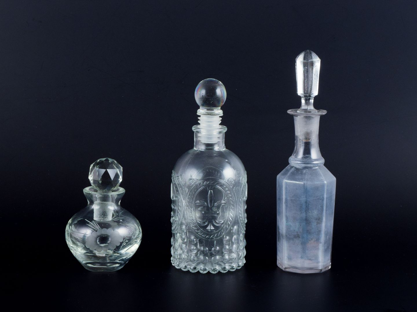 Danish glassworks, three oil/vinegar jugs in different designs. Clear glass. 1930/40s. In excellent condition. Tallest: H 19.0 x D 5.0 cm.