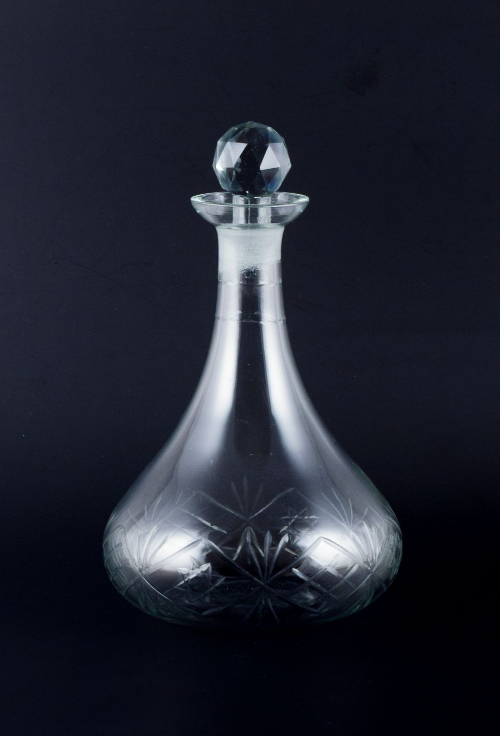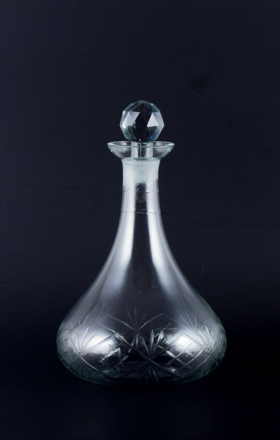 Dansk glasværk, vinkaraffel i klart glas. Kugleformet facetslebet prop. 1930/40’erne. I flot stand. Mål: H 25,0 x D 14,0 cm.