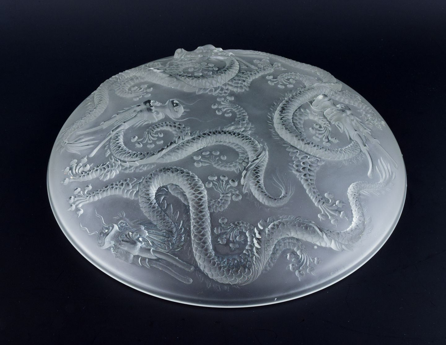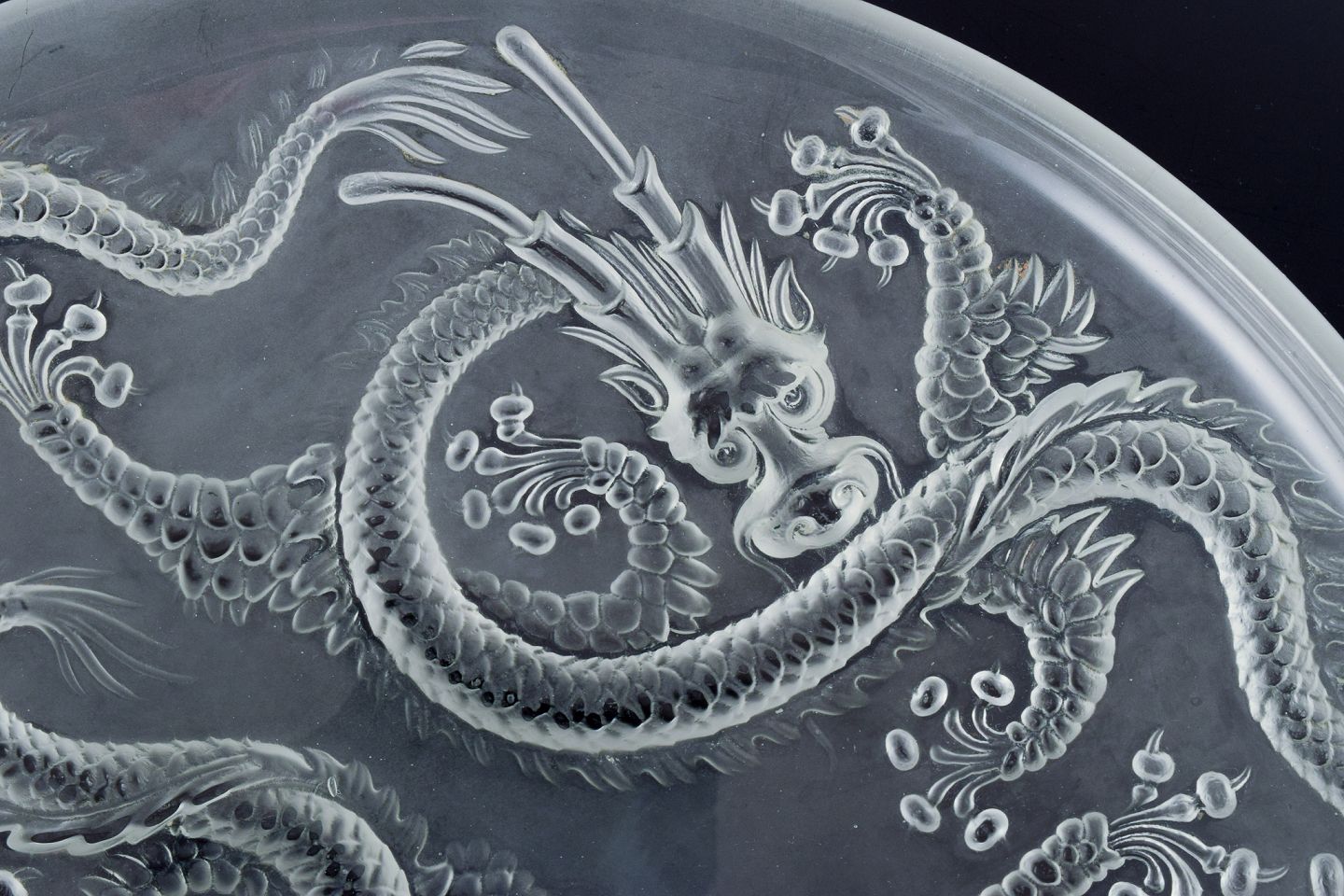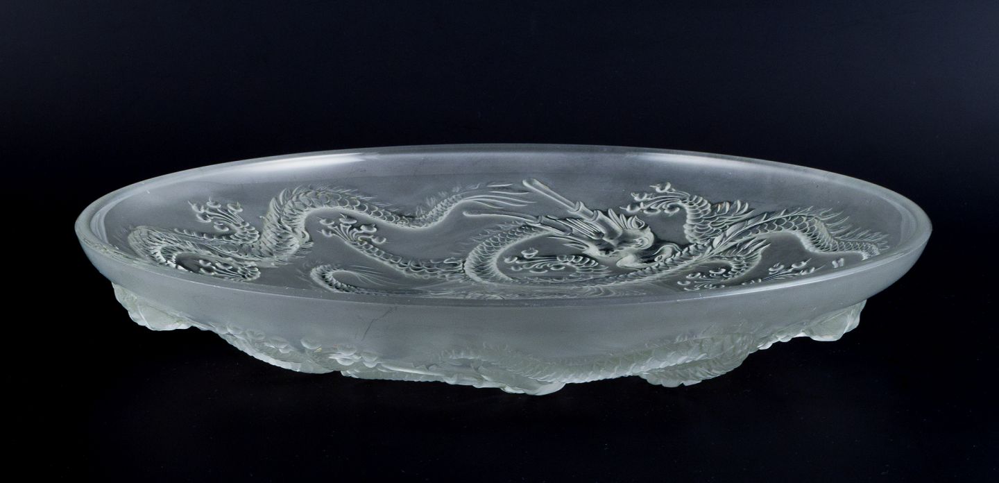 Josef Inwald, stor kunstglasskål i Barolac glas, designet med drager i orientalsk stil. Ca. 1940’erne. I perfekt stand. Mål: D 35,5 x H 5,0 cm.