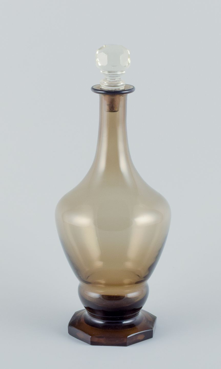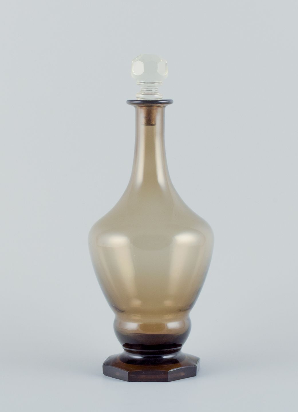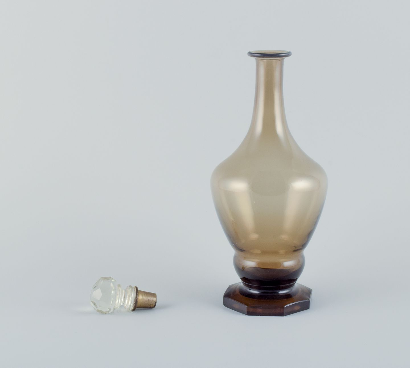 Dansk glasværk, mundblæst Art Deco vinkaraffel i røgfarvet glas med facetslebet bund.