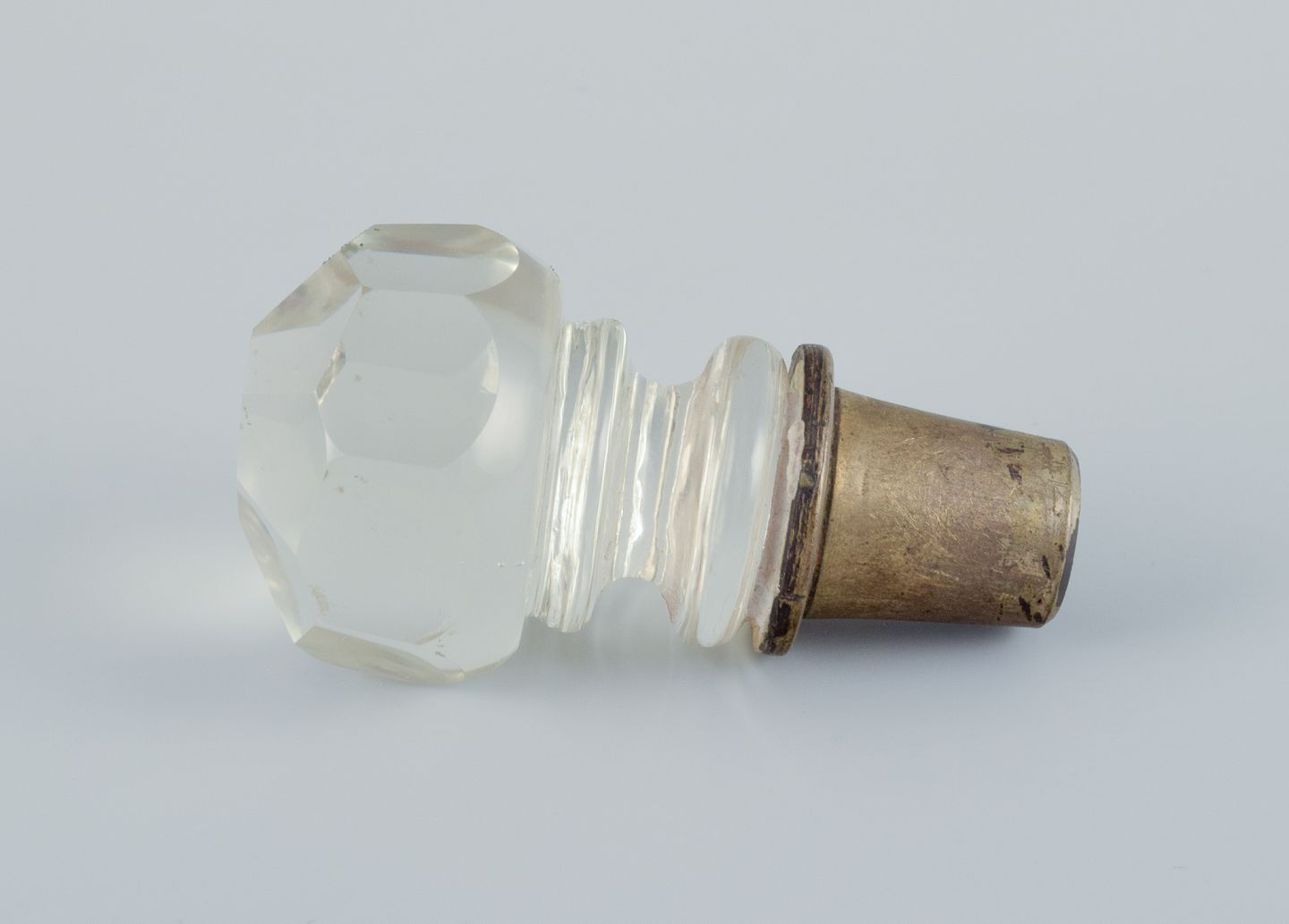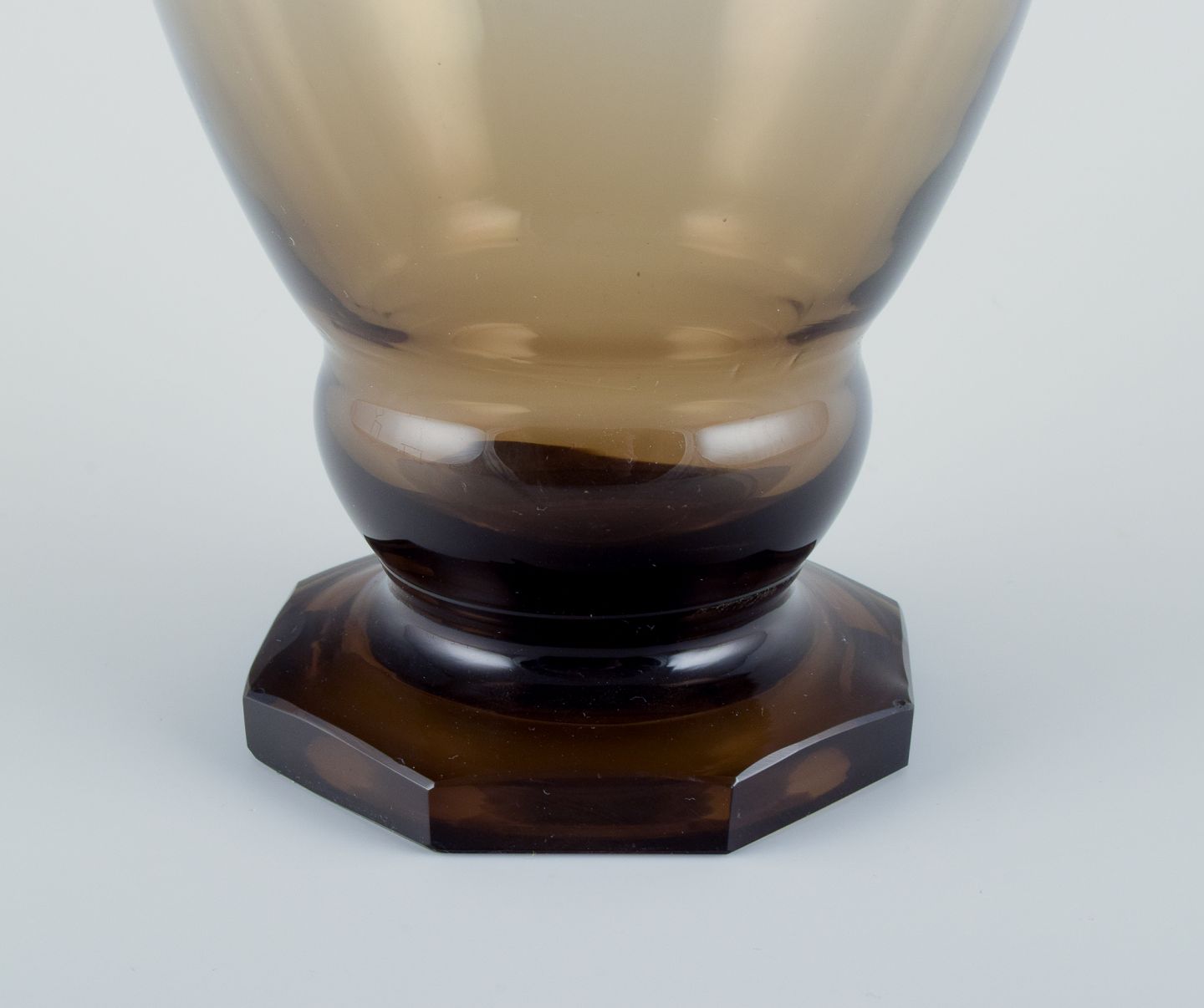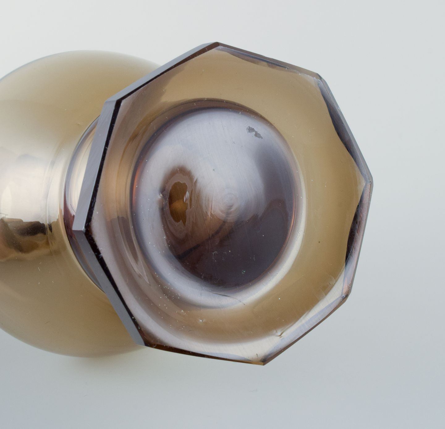 Dansk glasværk, mundblæst Art Deco vinkaraffel i røgfarvet glas med facetslebet bund.