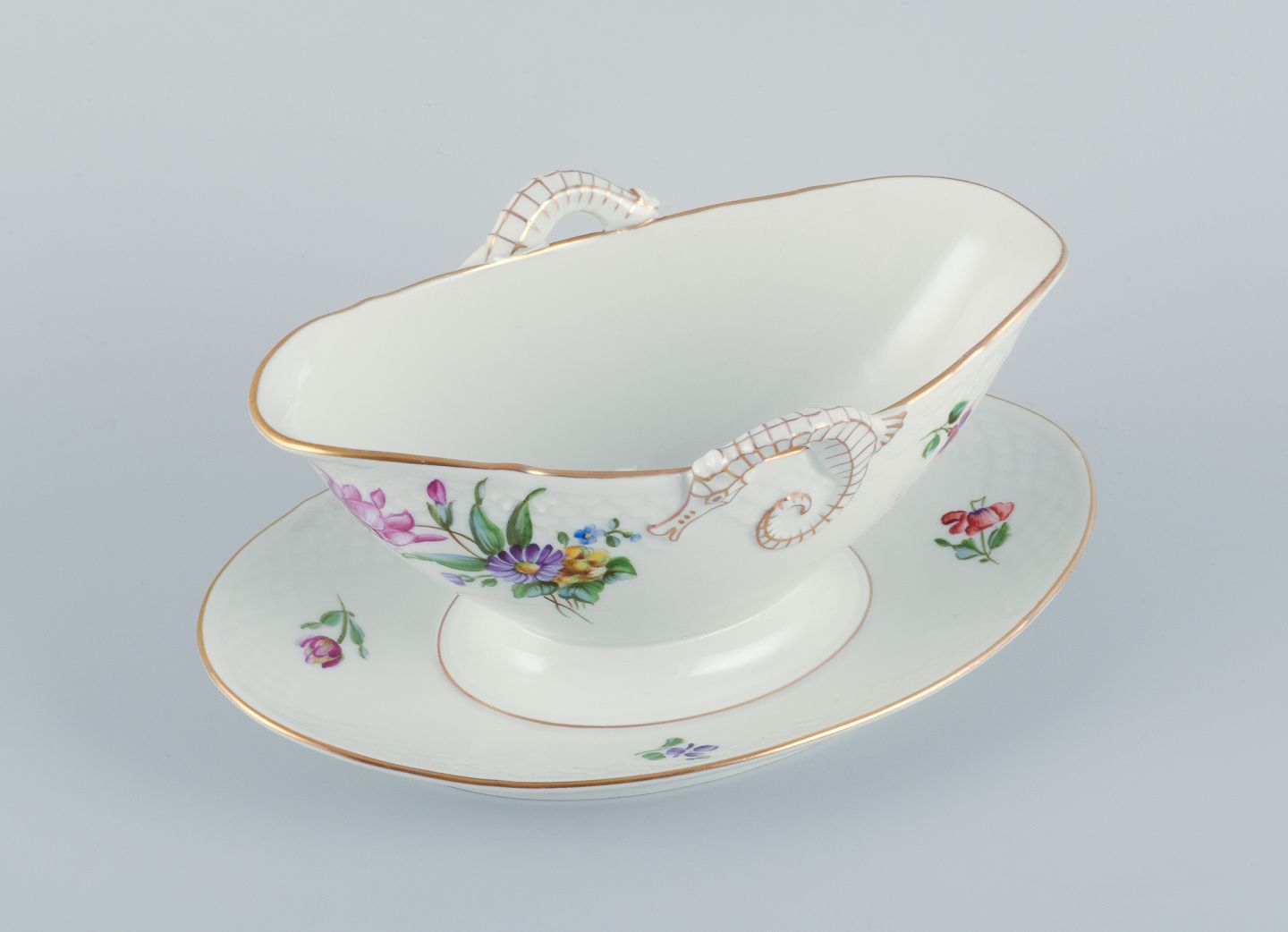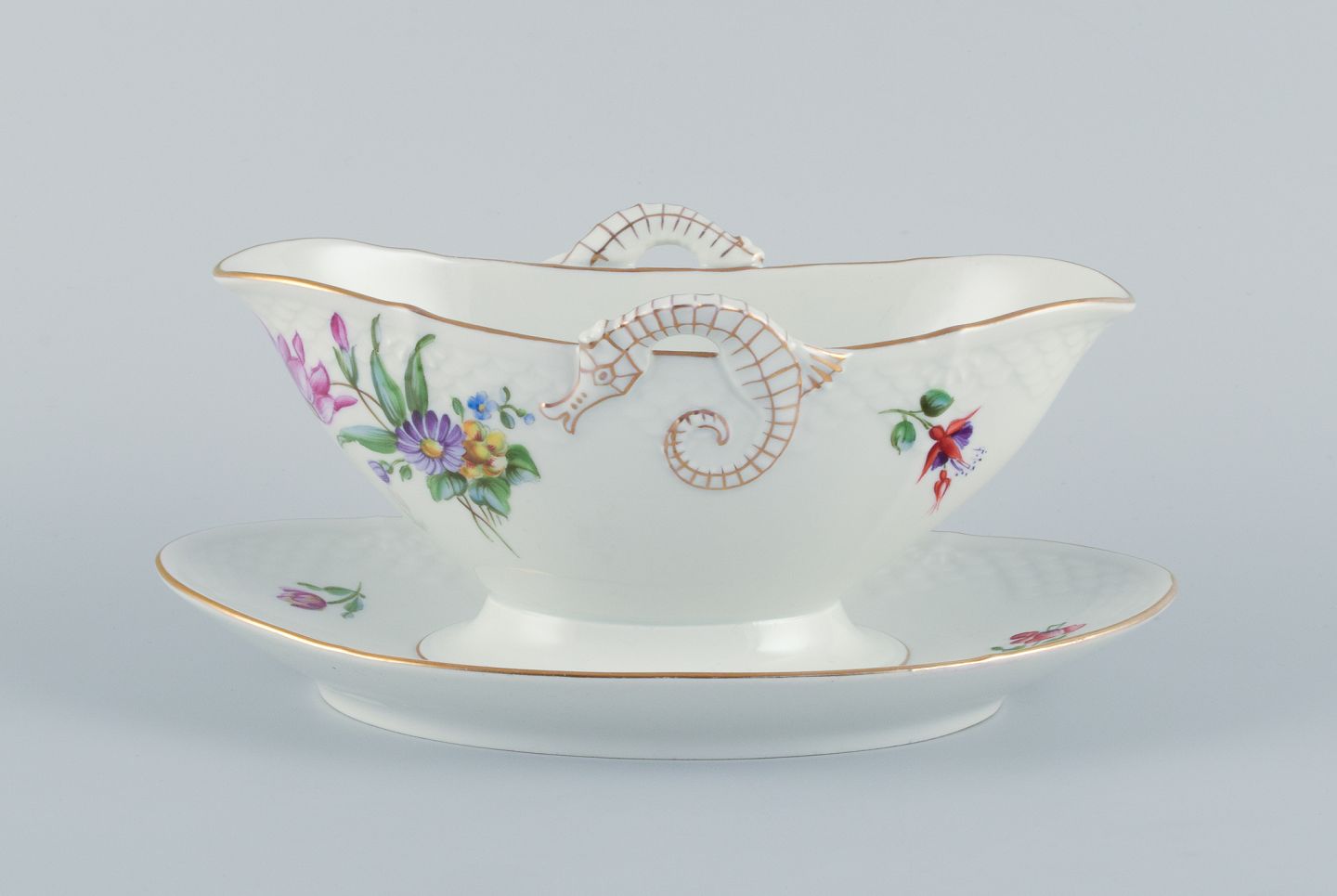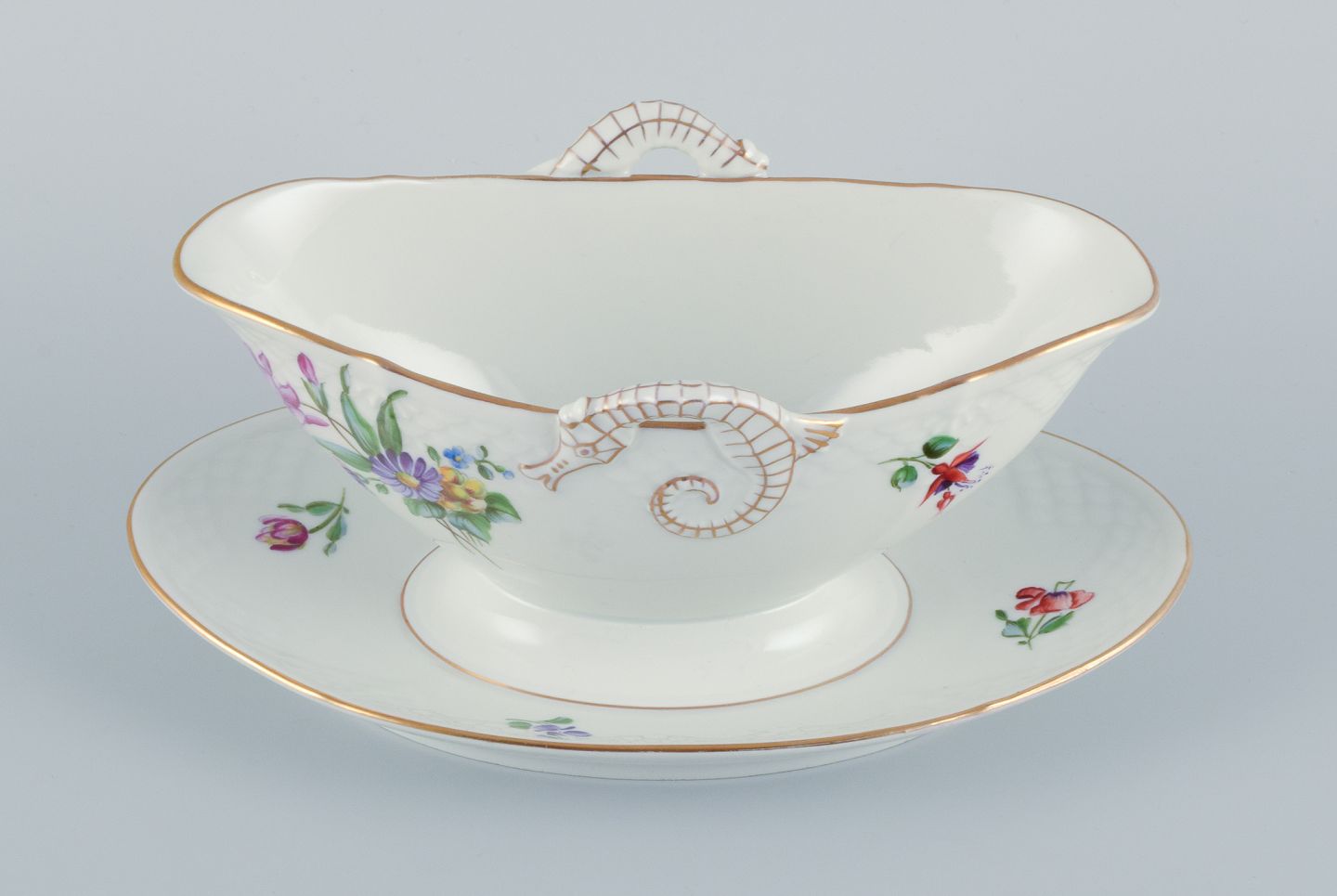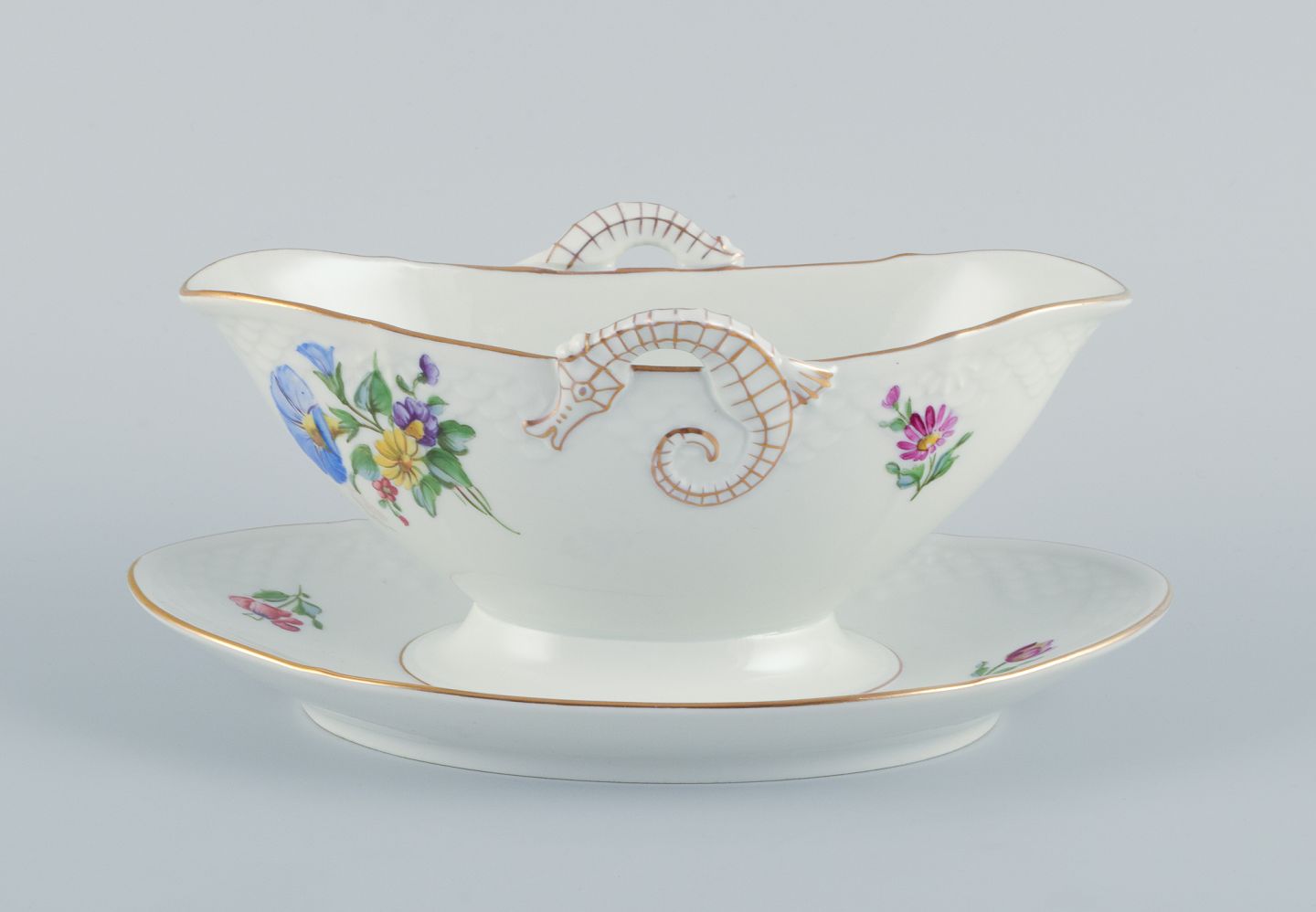 Bing & Grøndahl Saksisk Blomst, en håndmalet sauceskål med hanke i form af søheste. Ca. 1920/30’erne. Modelnummer 8 Stemplet. Første sortering. Perfekt stand. Mål: L 24,5 cm. x H 10,0 cm.