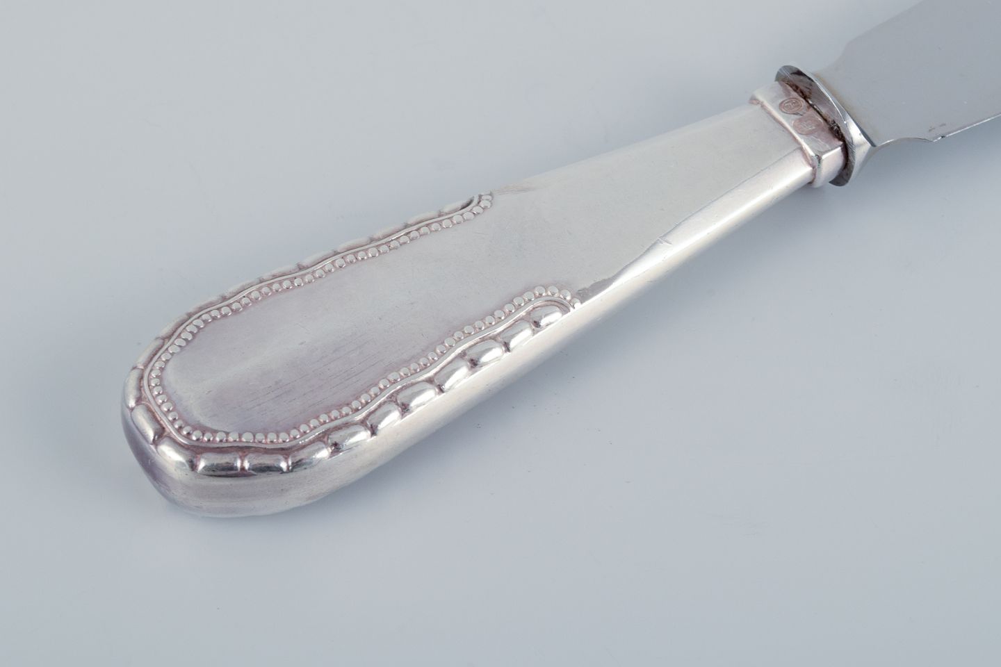 Georg Jensen, Nordisk, lagkagekniv i tretårnet sølv. Blad i rustfrit stål. 1915-1932 stempel. I flot stand. Mål: L 21,9 cm.