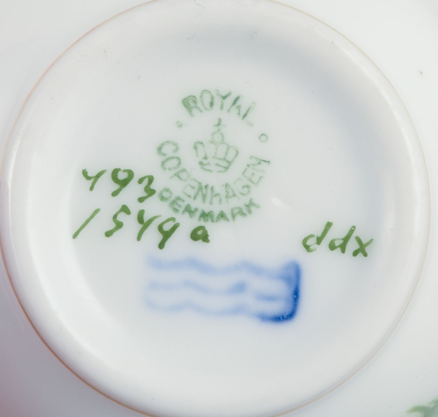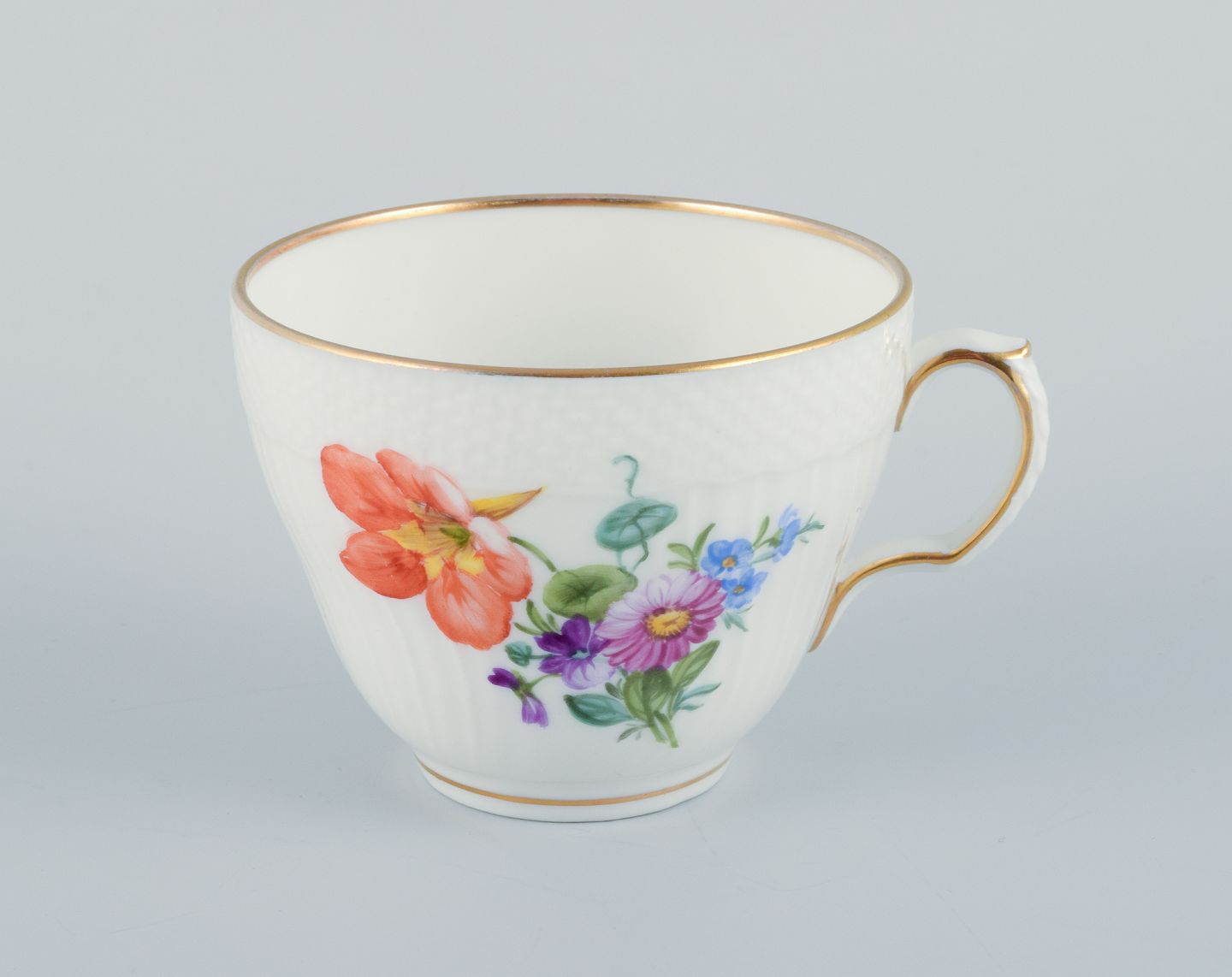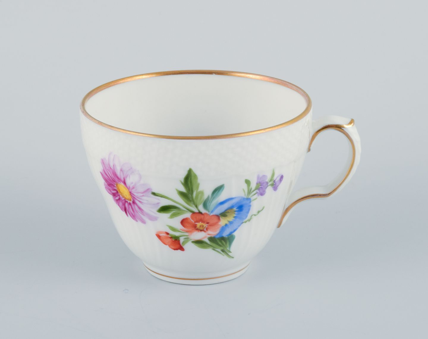 Royal Copenhagen, Saksisk Blomst, et sæt på fire kaffekopper med tilhørende underkopper, hånddekoreret med polykrome blomster og guldkant.