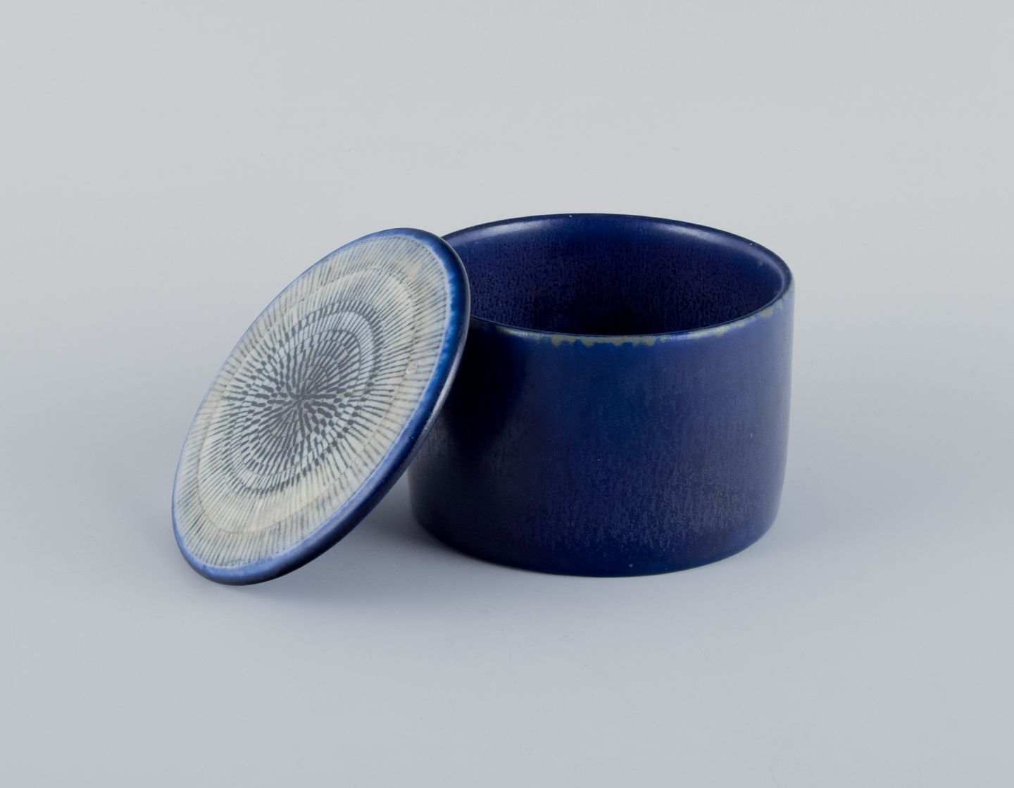 Herta Bengtsson? for Rörstrand, sjælden lågkrukke i keramik med glasur i blå toner. Mønster på lågets top.