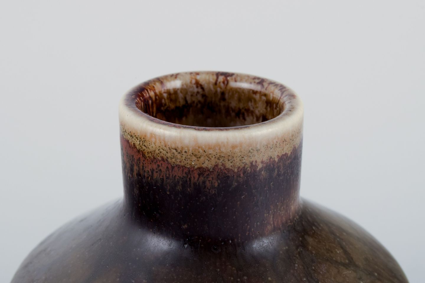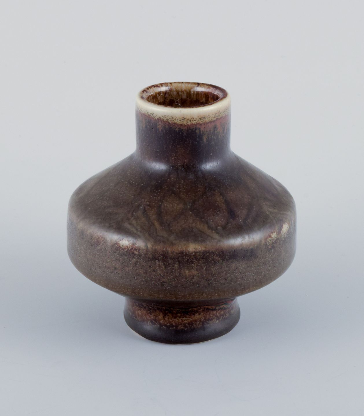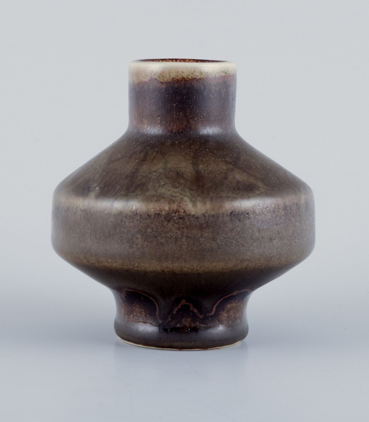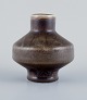 Carl Harry Stålhane for Rörstrand Atelje. Keramikvase i sjælden form med brungrønne toner. 1960’erne. Stemplet. I flot stand. Anden sortering. Mål: H 8,5 cm. x D 7,5 cm.