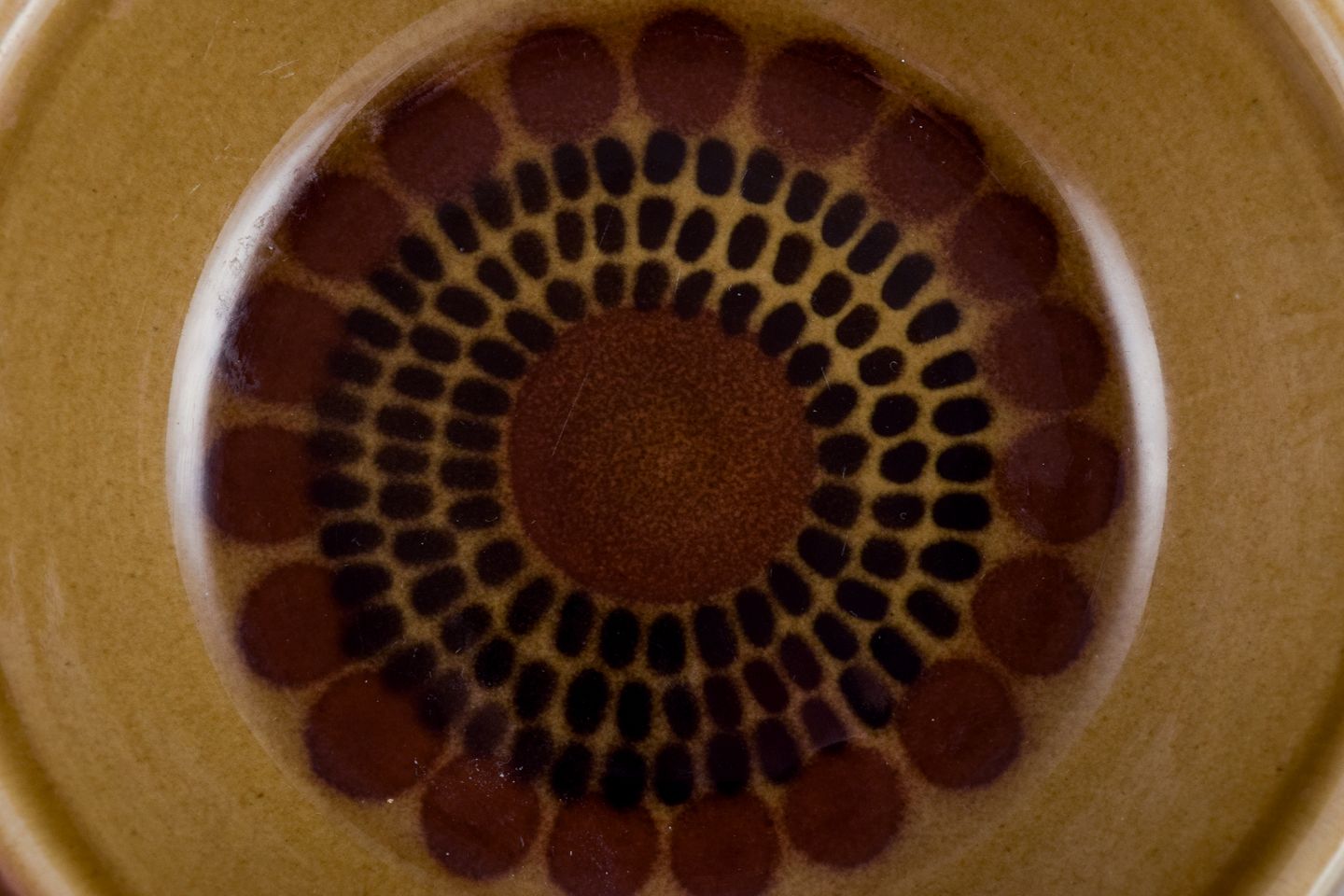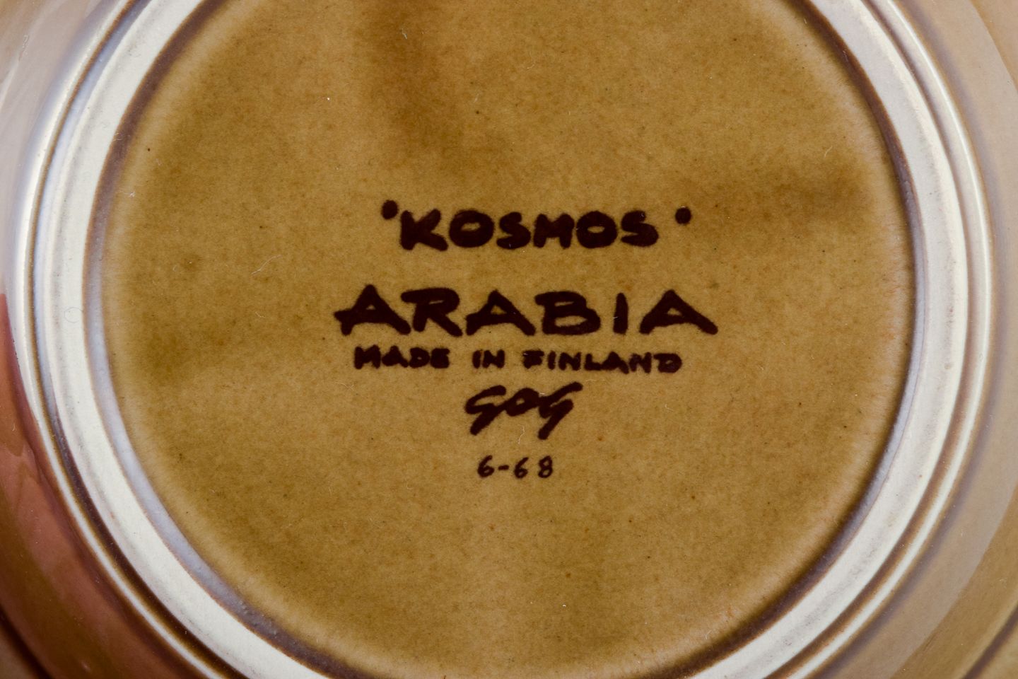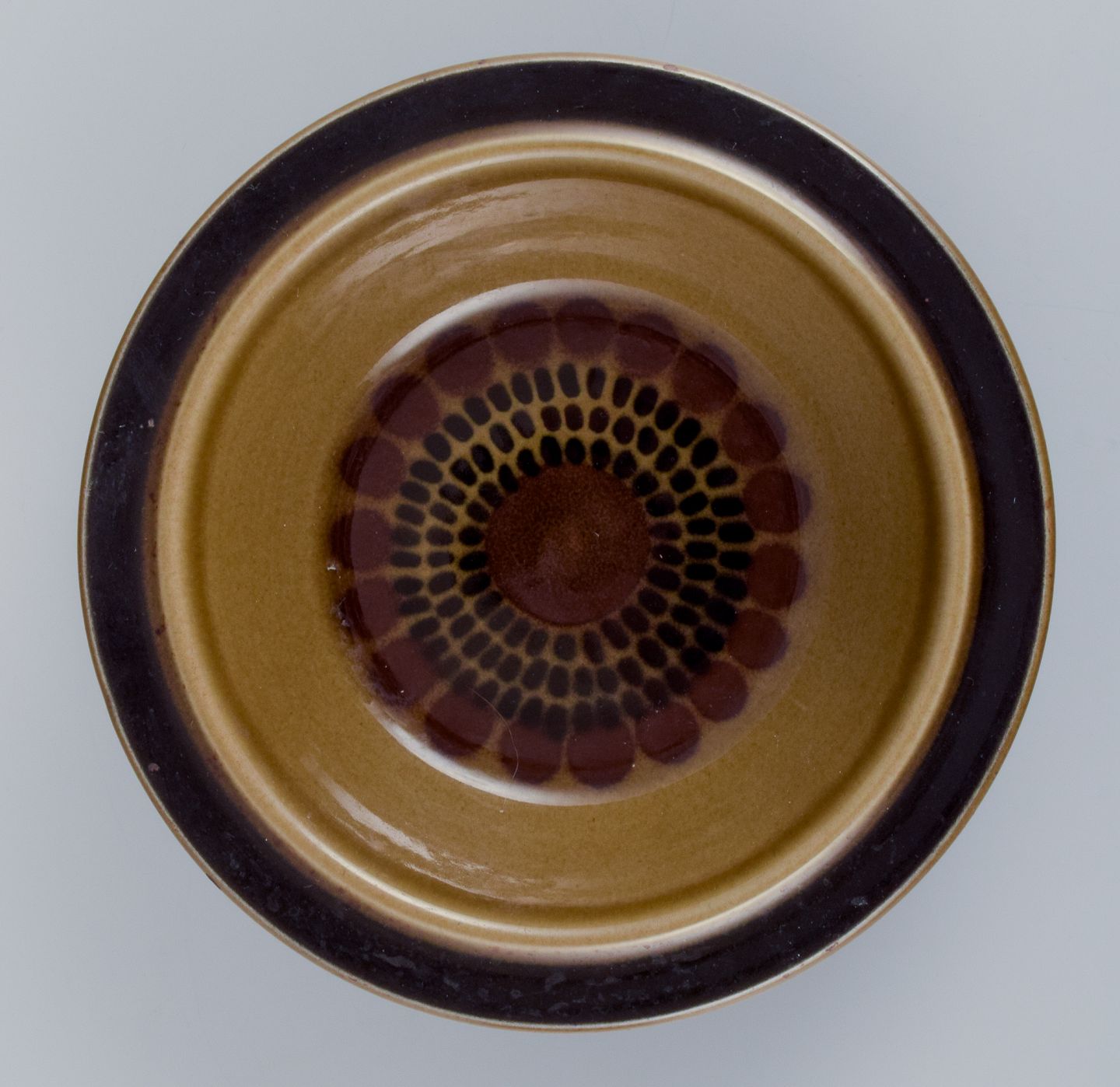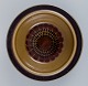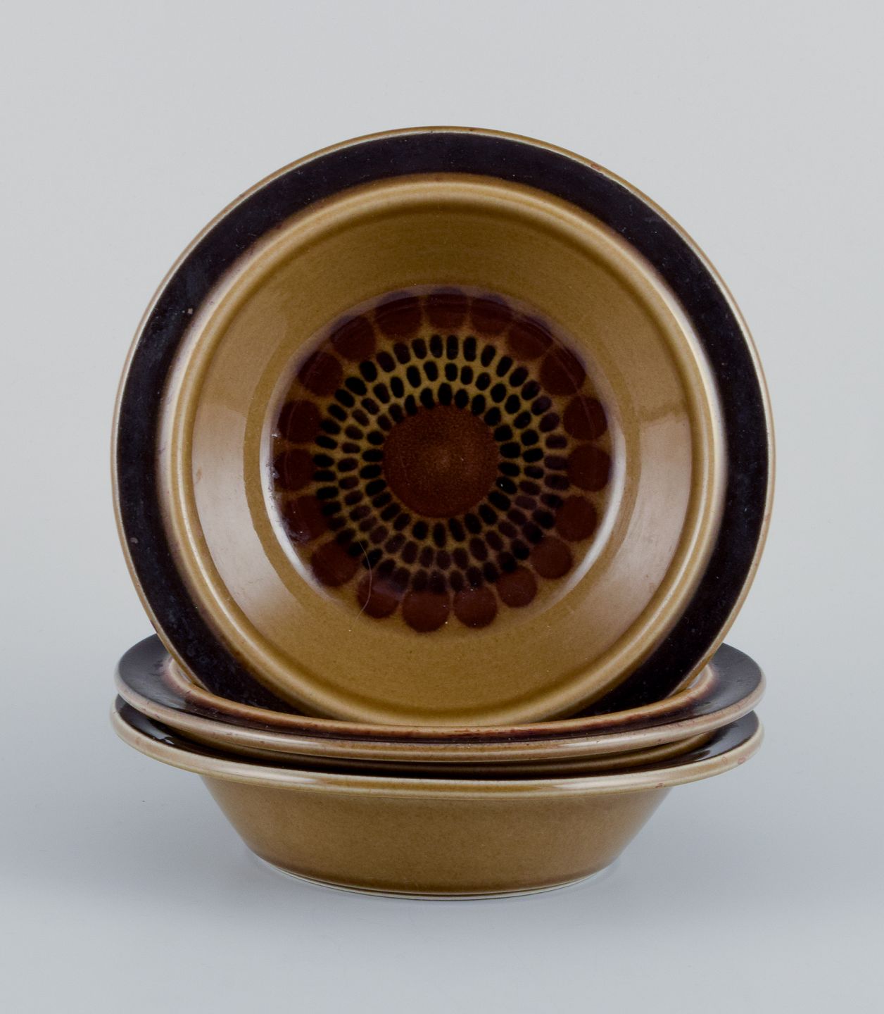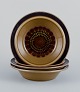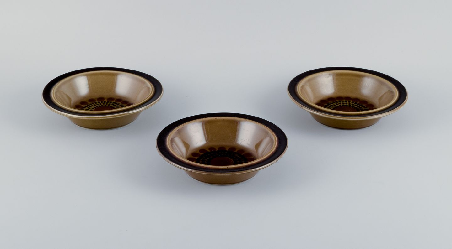 Gunvor Olin-Grönqvist for Arabia. ”Cosmos”, tre dybe tallerkner. Stentøj i retrostil. Glasur i grønbrune toner. 1970’erne. Stemplet. I perfekt stand. Første sortering. Mål: D 13,7 cm. x H 4,0 cm.