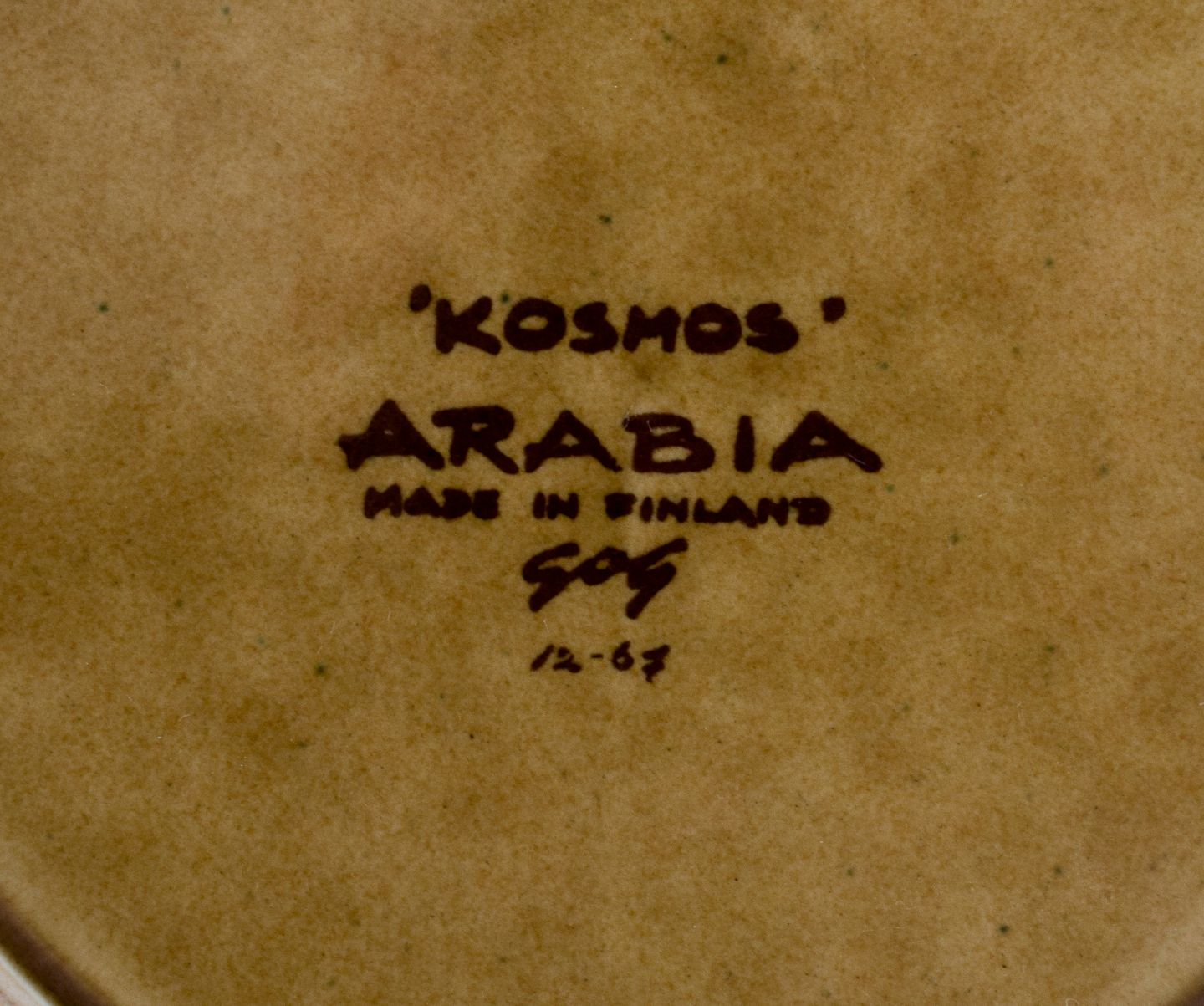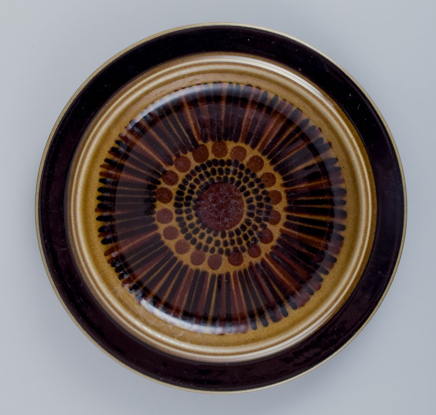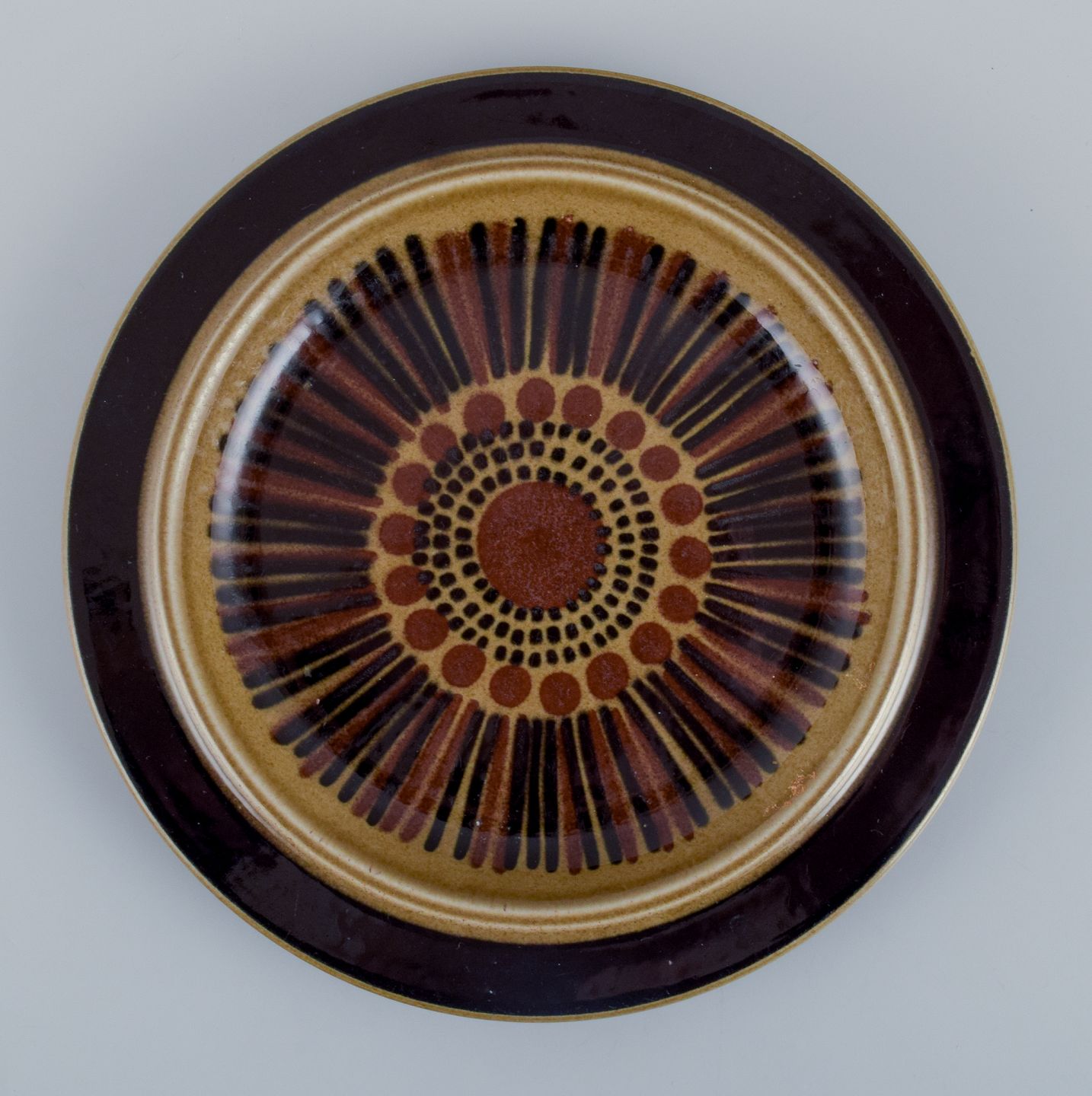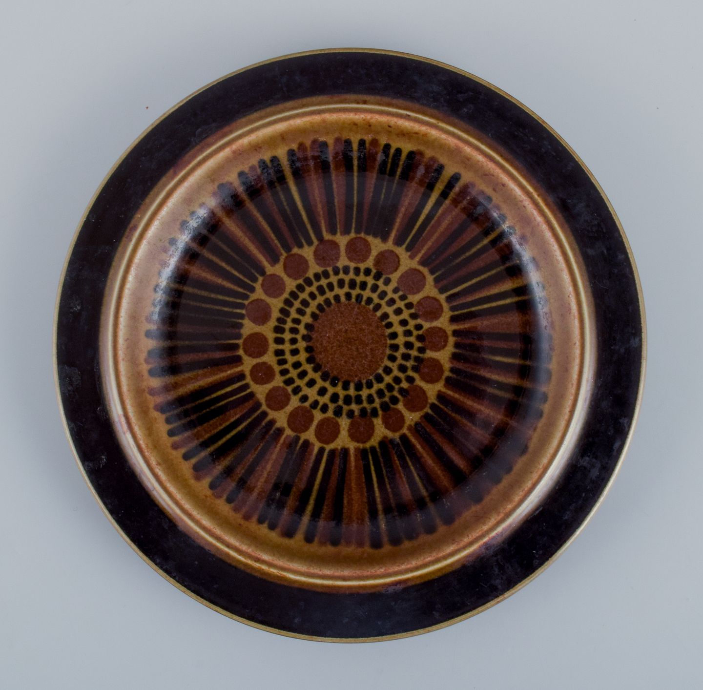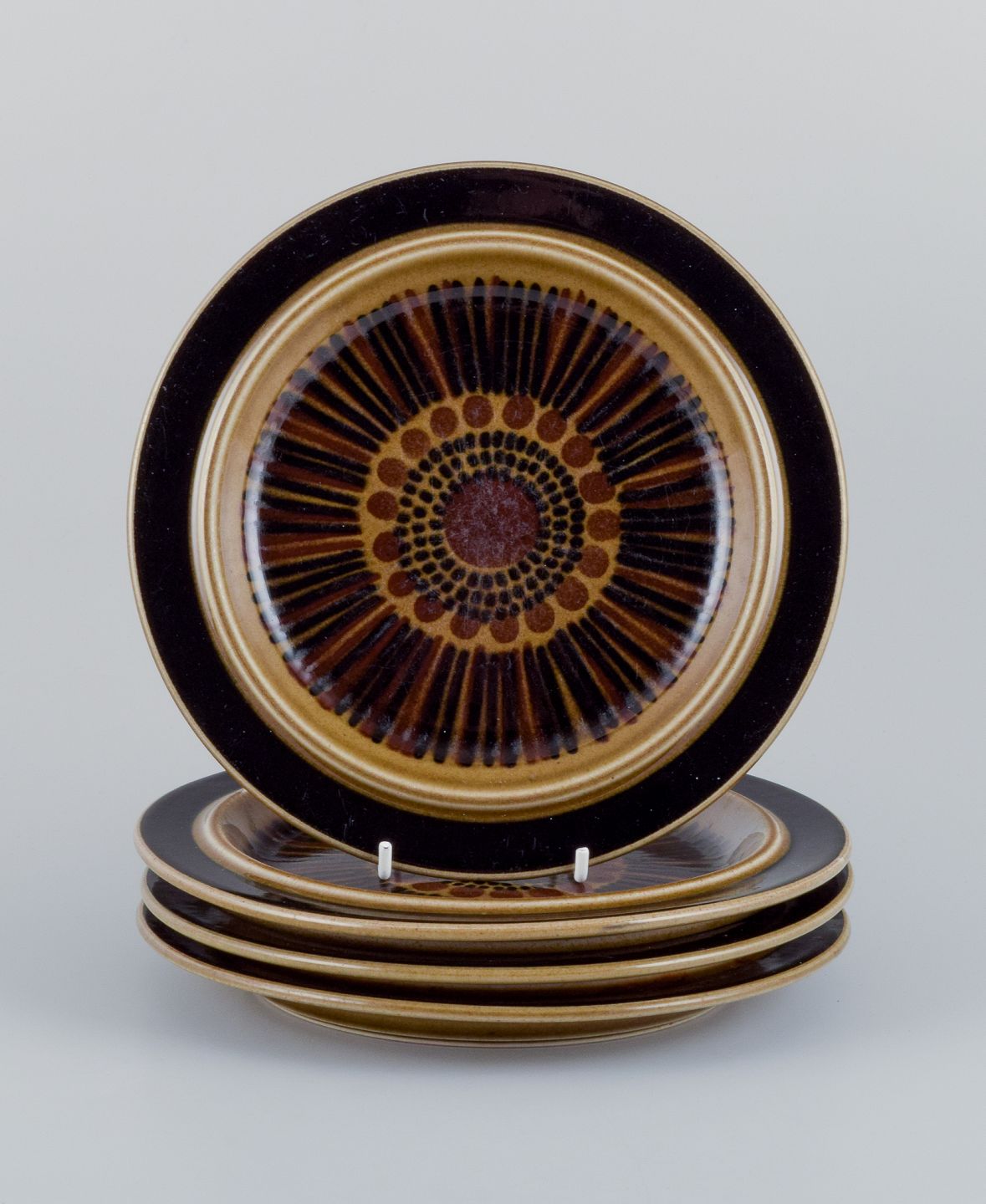Gunvor Olin-Grönqvist for Arabia. ”Cosmos”, et sæt på fire frokosttallerkner i stentøj. Stentøj i retrostil. Glasur i grønbrune toner.