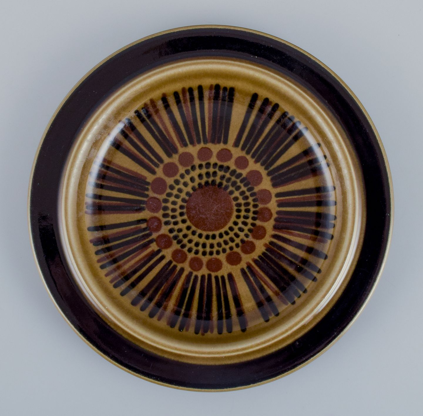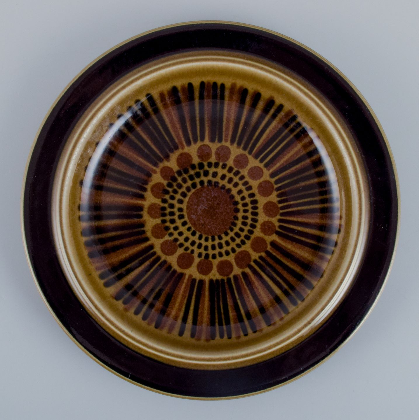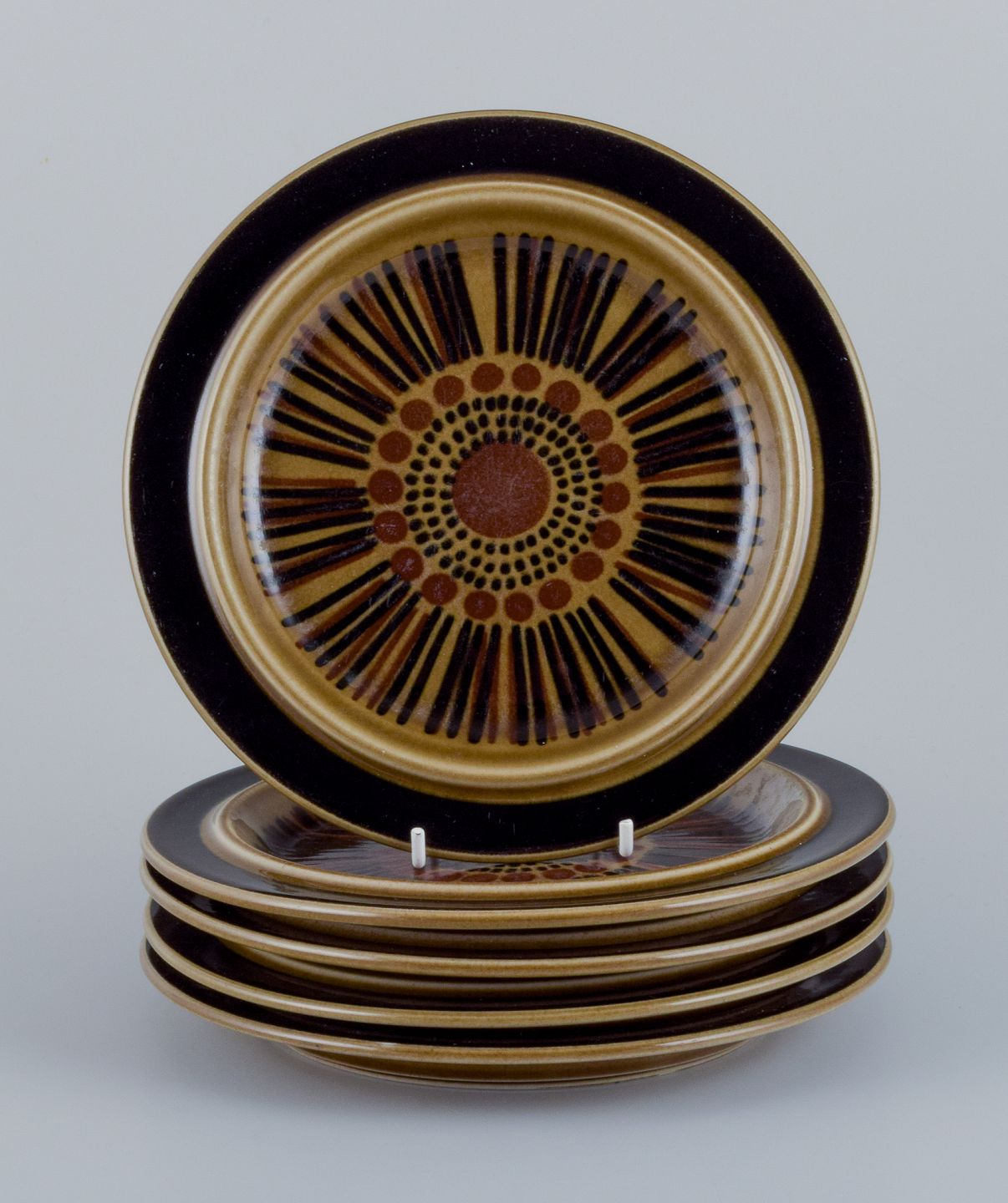 Gunvor Olin-Grönqvist for Arabia. ”Cosmos”, et sæt på fem frokosttallerkner i stentøj. Stentøj i retrostil. Glasur i grønbrune toner.