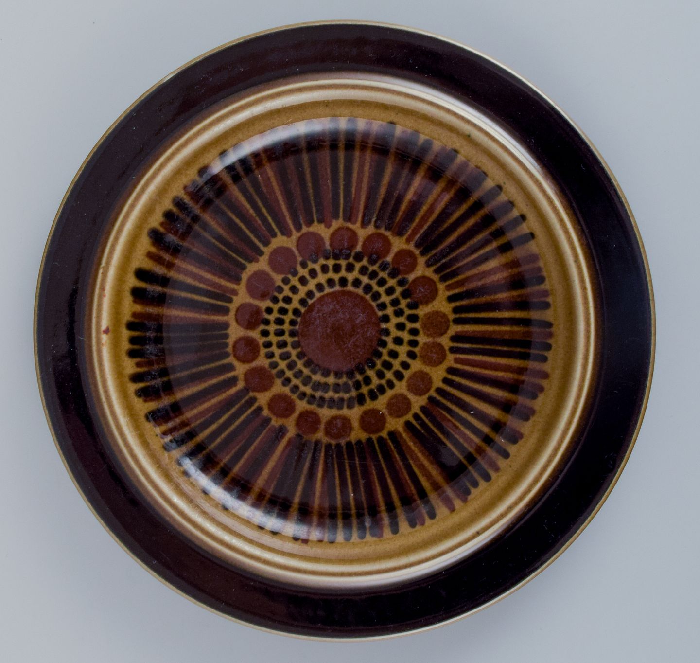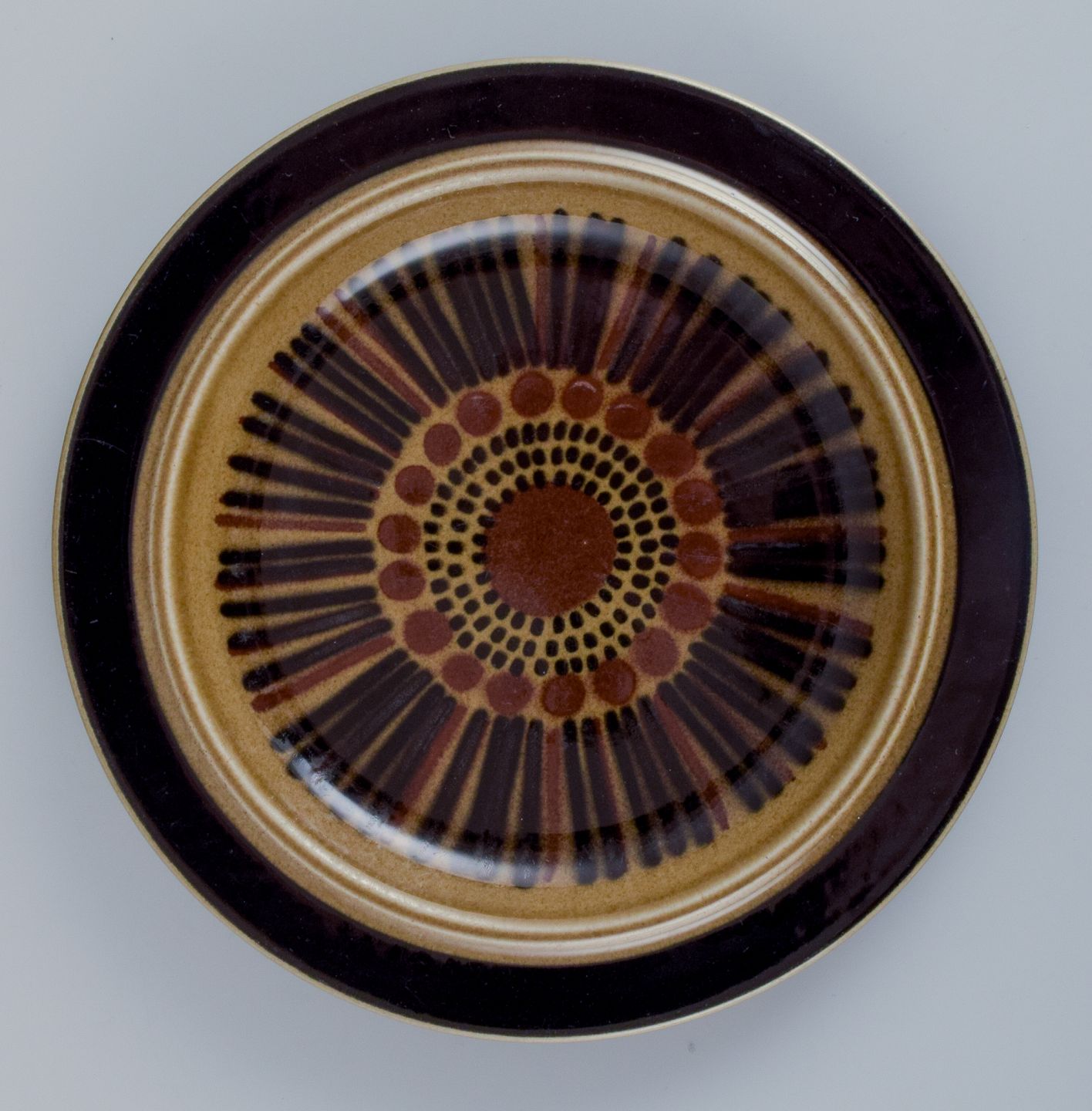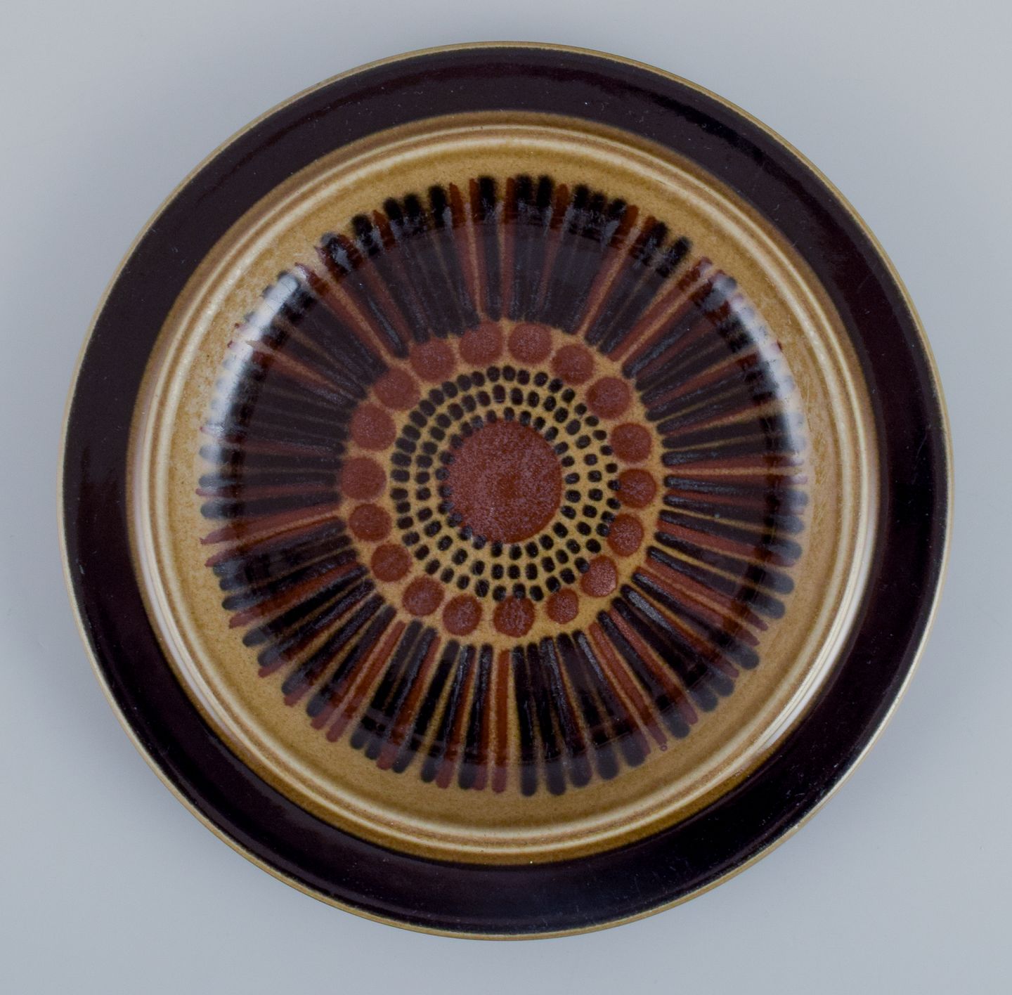 Gunvor Olin-Grönqvist for Arabia. ”Cosmos”, et sæt på fem frokosttallerkner i stentøj. Stentøj i retrostil. Glasur i grønbrune toner.