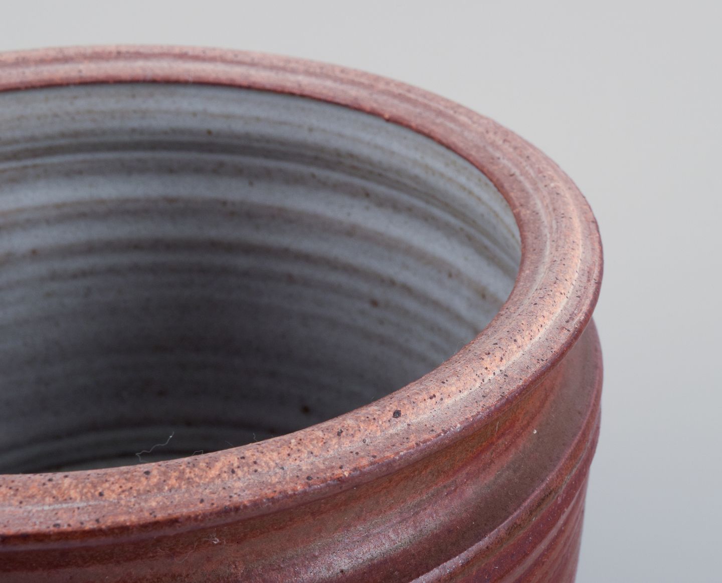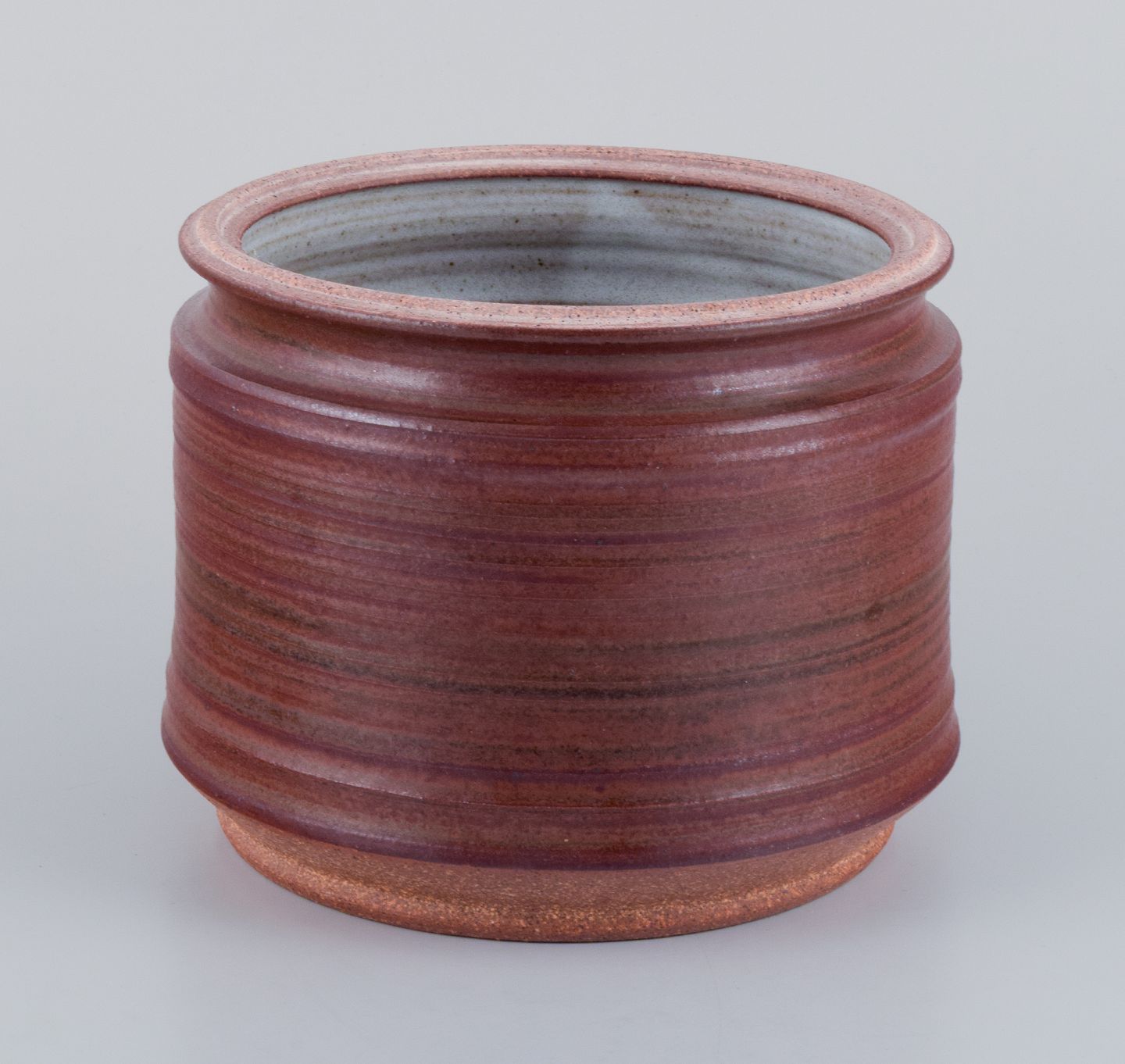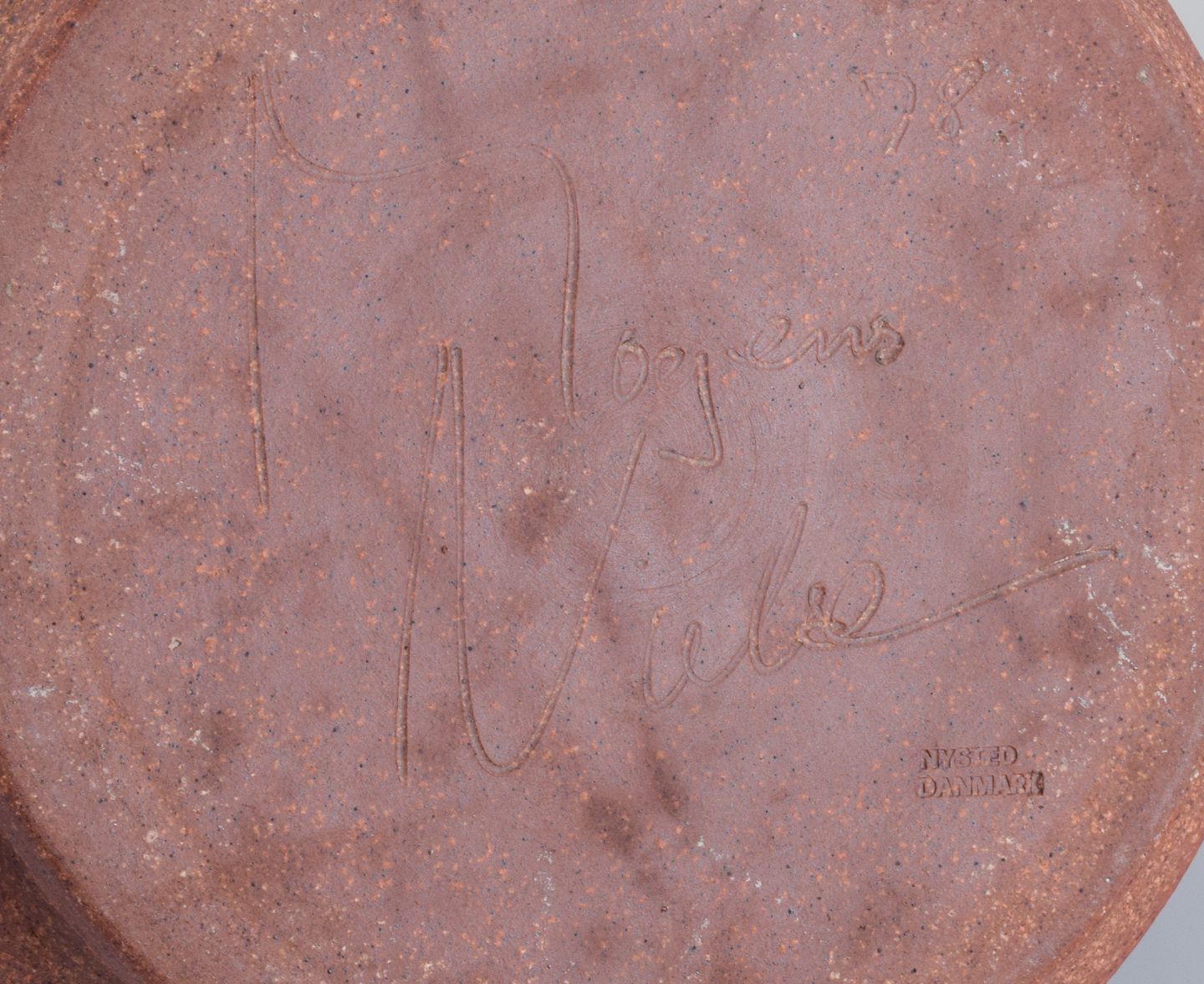 Mogens Nielsen, Nysted, stor håndlavet lågkrukke i keramik med glasur i brune toner. 1978. Signeret. Perfekt stand. Mål: H 19,7 cm. x D 21,0 cm.