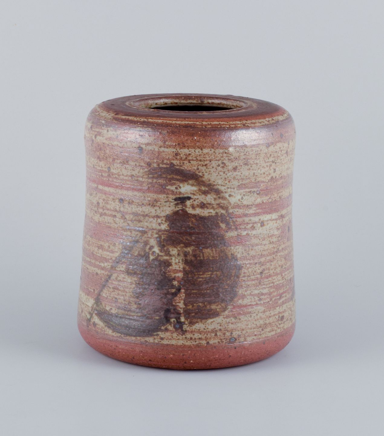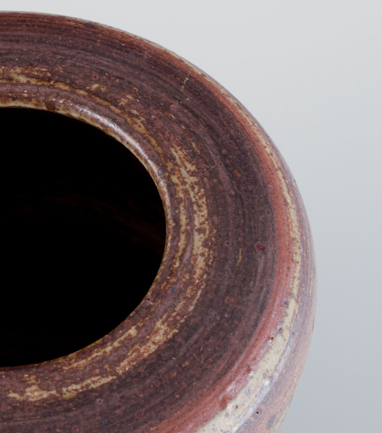 Mogens Nielsen, Nysted, stor håndlavet vase i keramik med glasur i brune toner. 1970’erne. Signeret. Perfekt stand. Mål: H 18,0 cm. x D 14,0 cm.