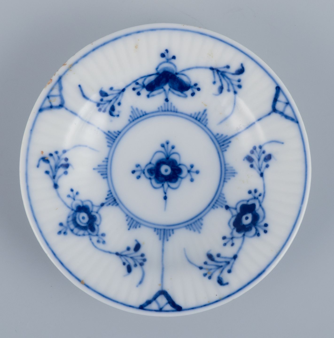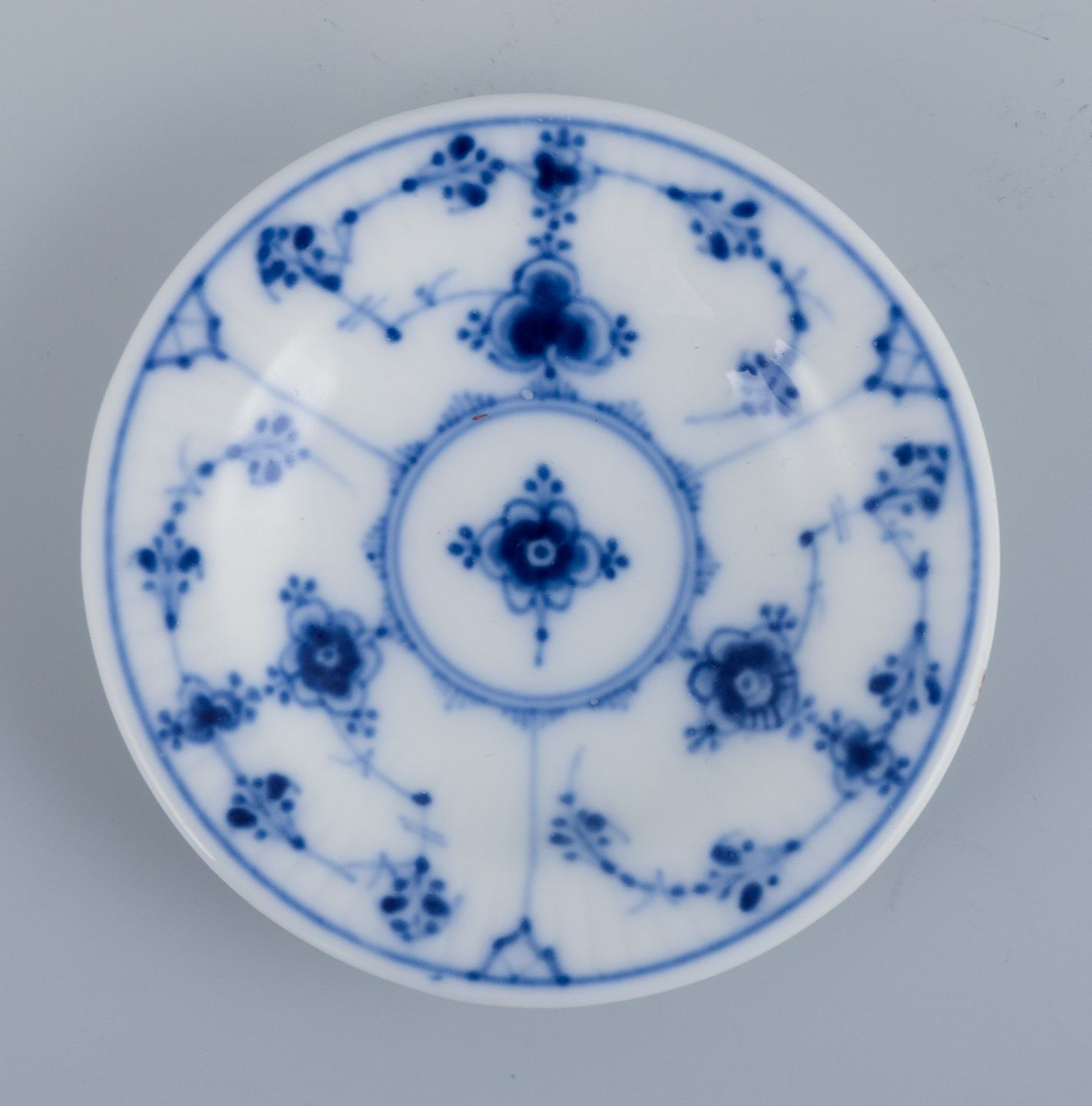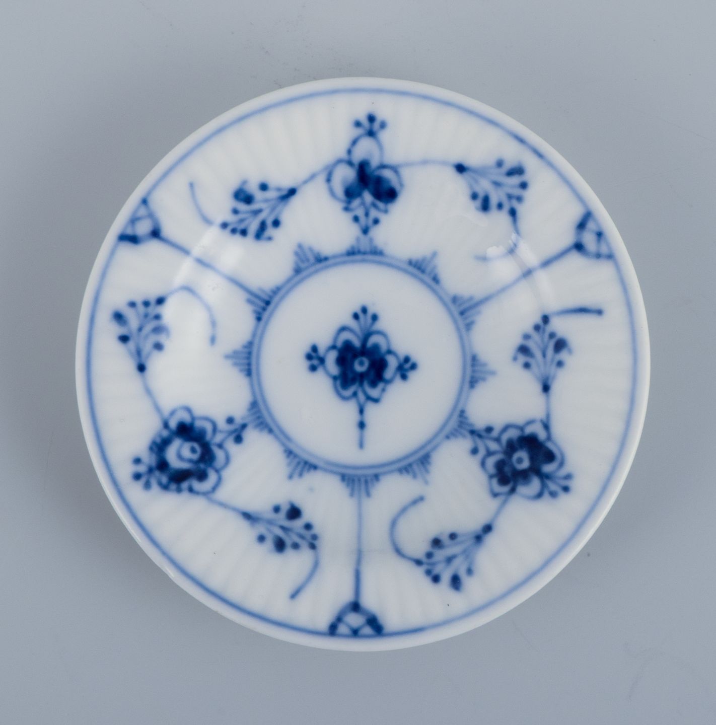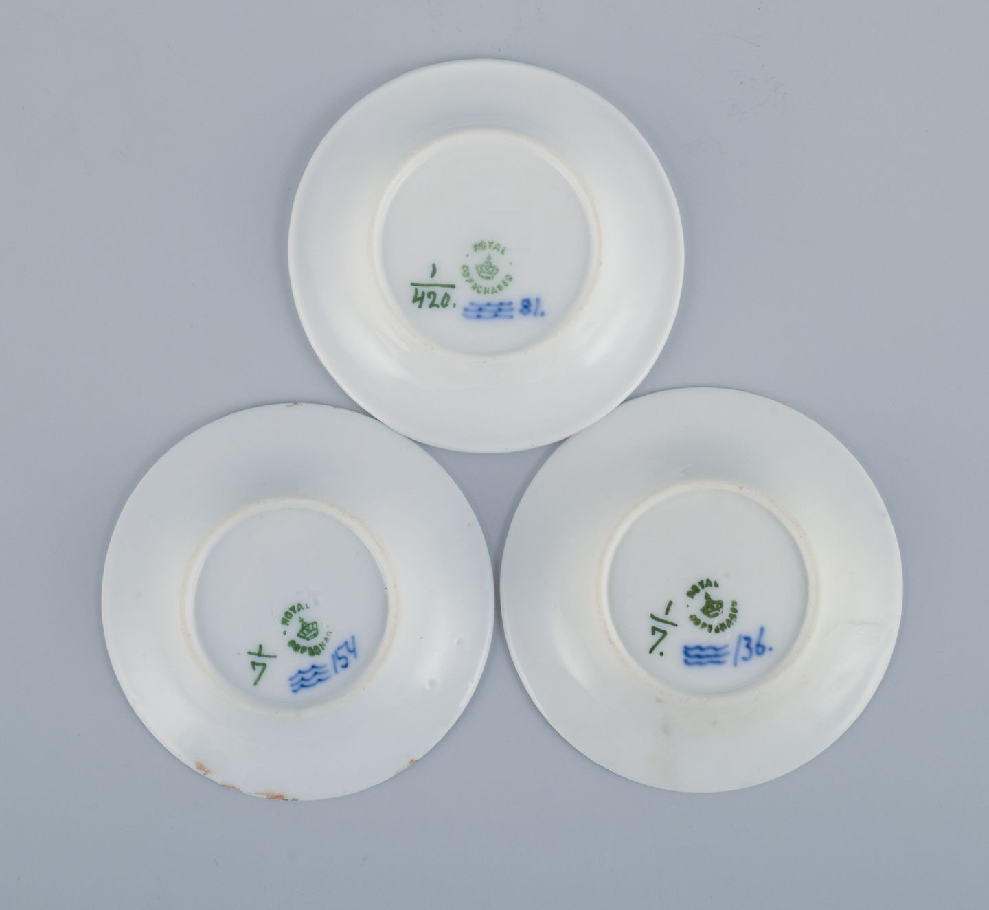 Royal Copenhagen Musselmalet Riflet, tre kaviarskåle. Modelnummer: 1/7 og 1/420 Ca. 1920. Stemplet. Første sortering. Perfekt stand. Mål: D 7,2 cm.
