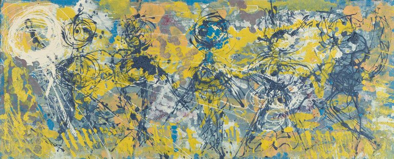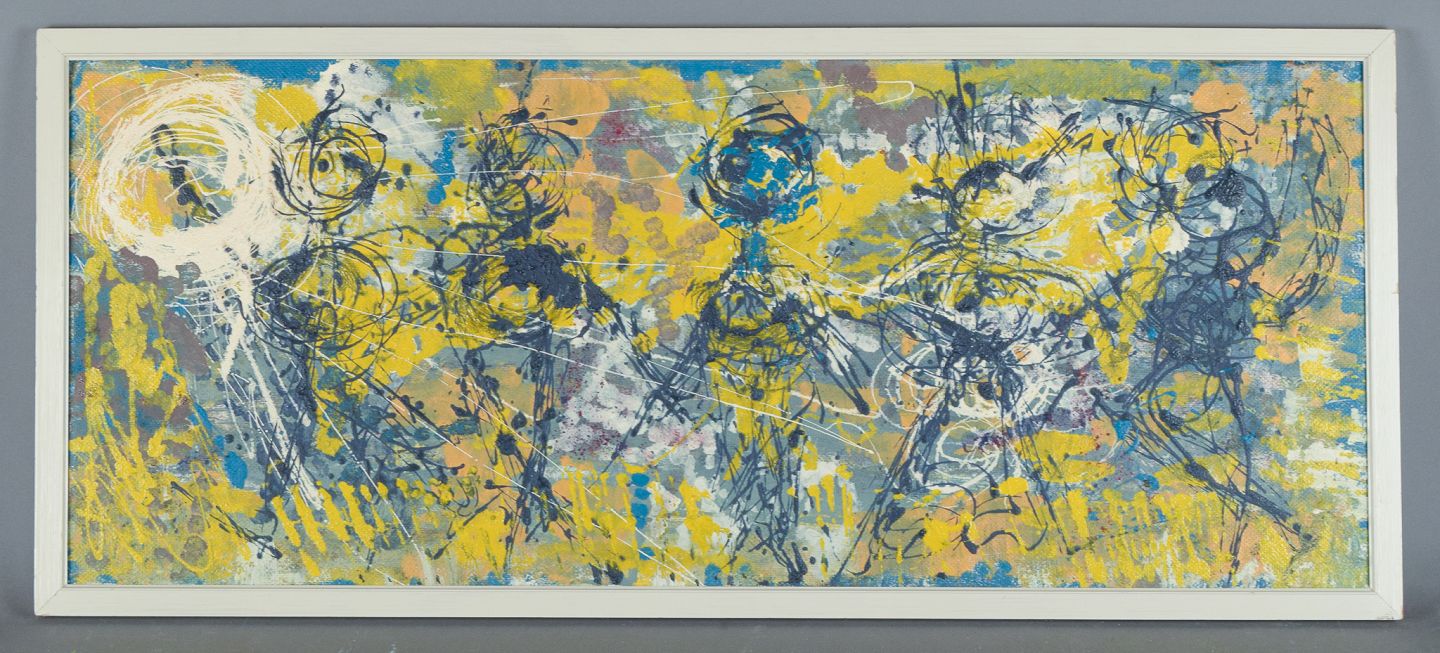 Skandinavisk kunstner, olie på plade, abstrakt komposition med farverig palette. Ca. 1960’erne. Perfekt stand. Totalmål: B 88,0 cm. x H 38,0 cm.