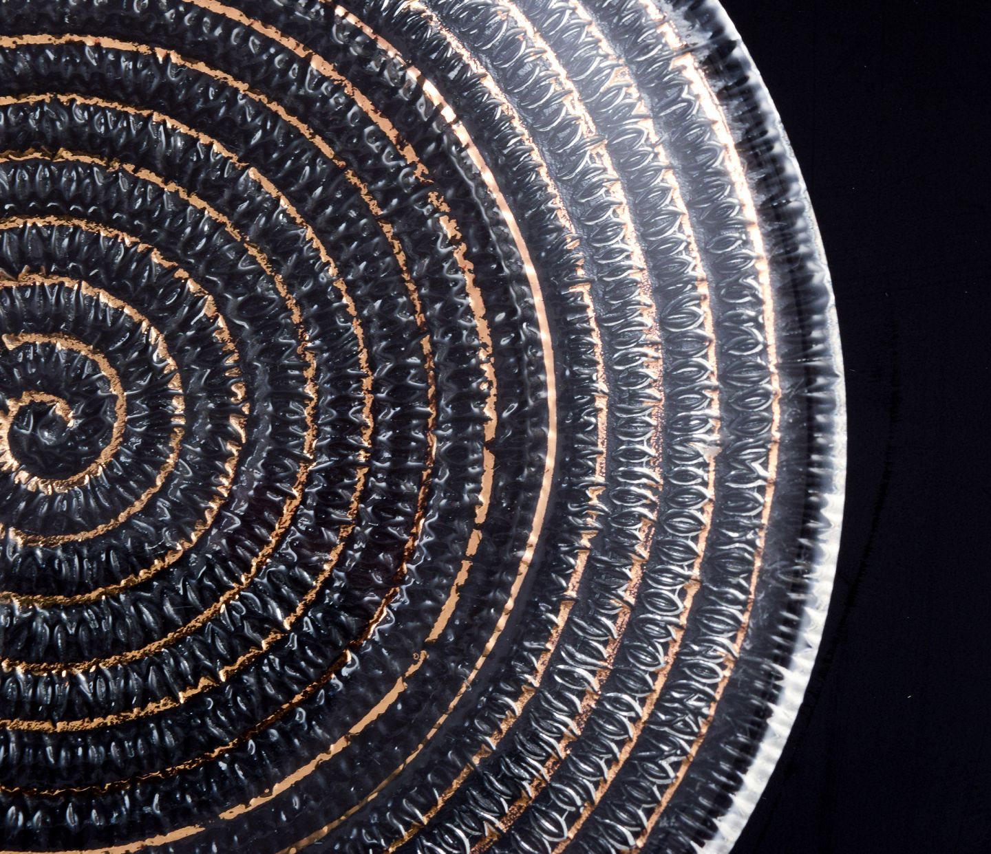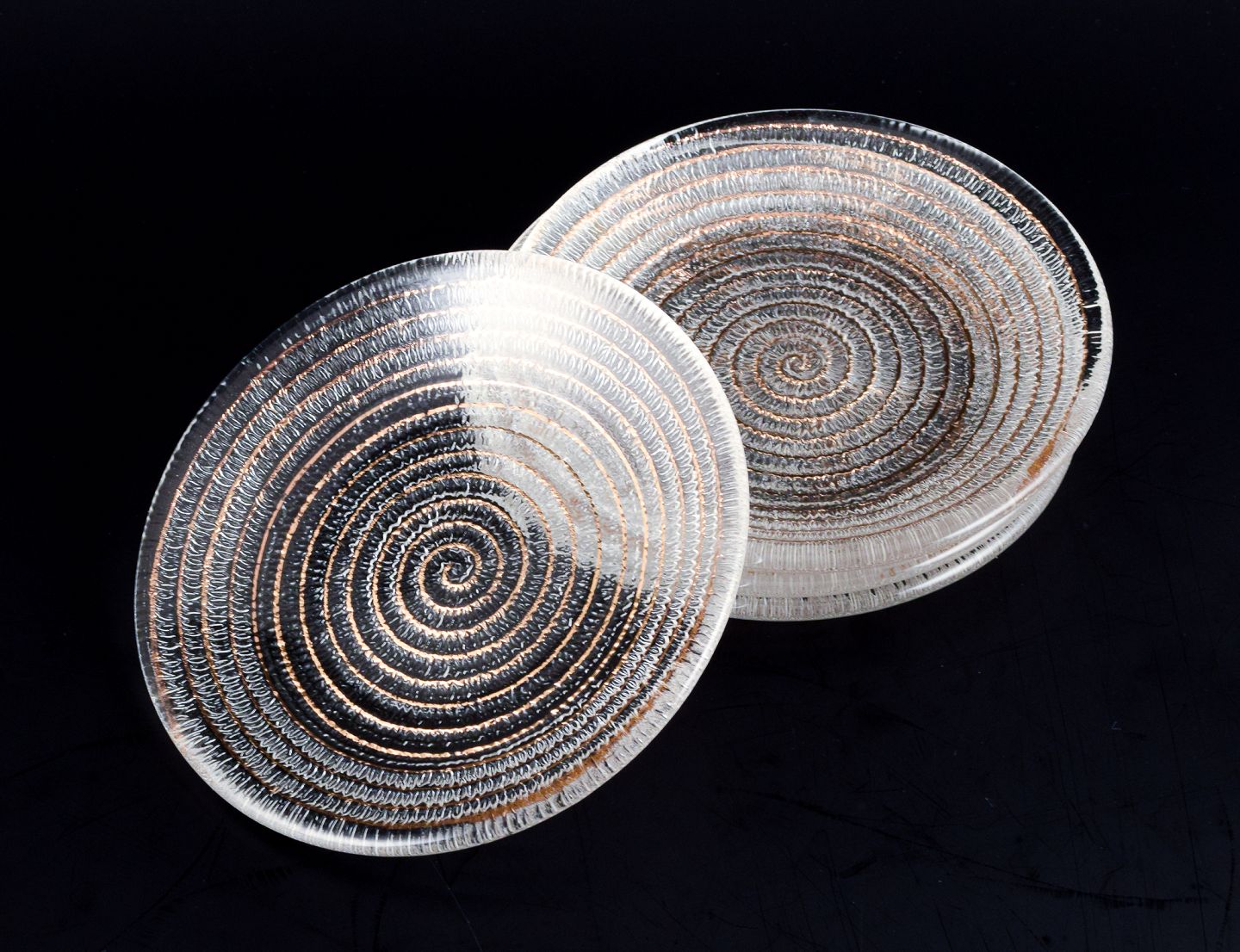 Murano, Italien, et sæt på fire små tallerkner i klart glas med spiralformet gulddekoration. Ca. 1980’erne. Perfekt stand. Mål: D 15,0 cm. x H 2,0 cm.