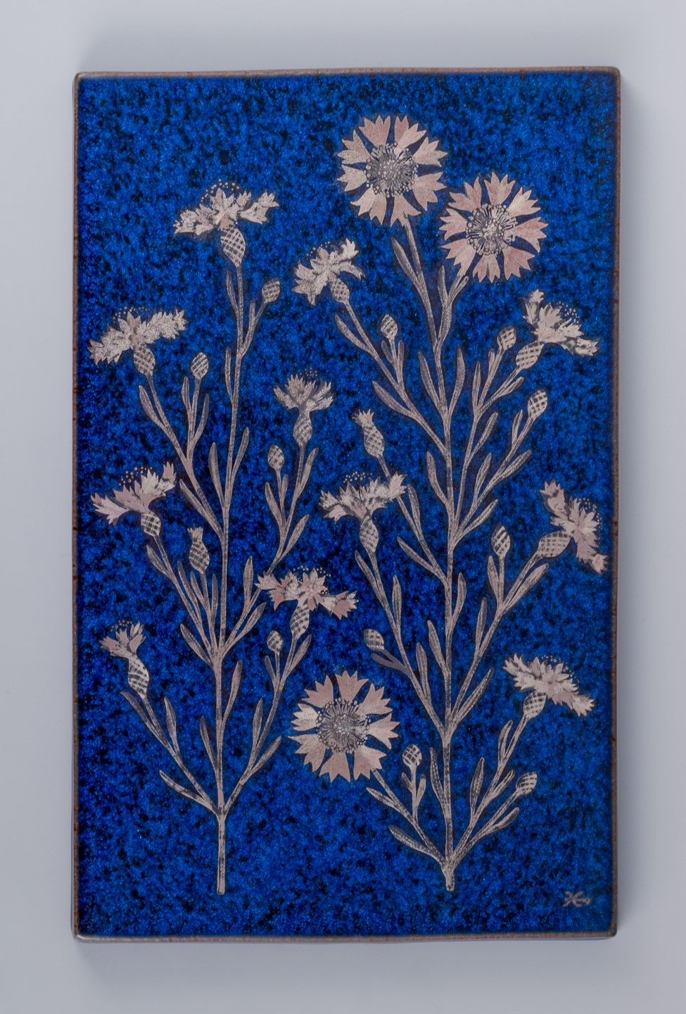 Stort vægrelief i stentøj dekoreret med blomster i sølv på mørkeblå baggrund.