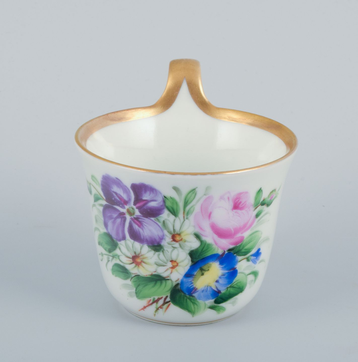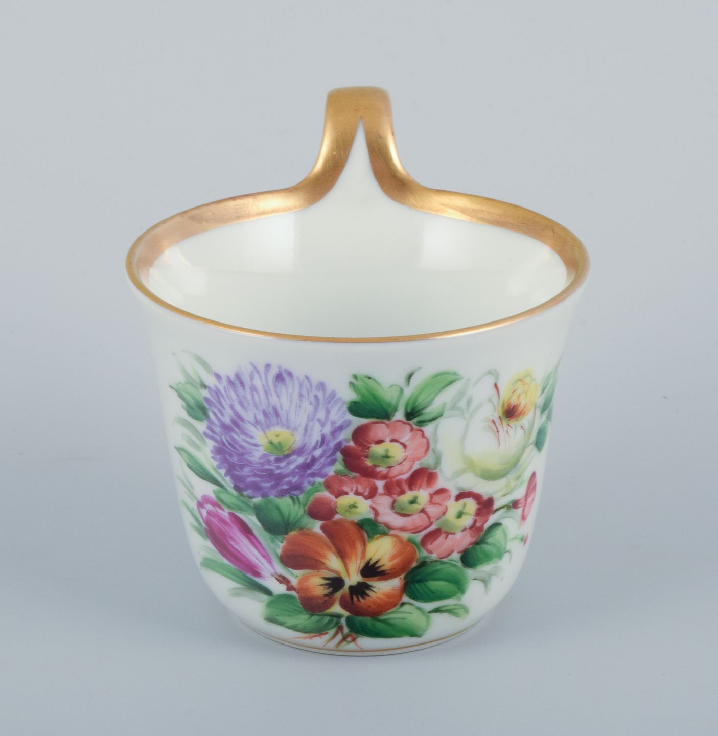 Bing og Grøndahl, et sæt på fire antikke kaffekopper med høj hank med tilhørende underkopper. Håndmalet med polykrome blomster i dekoration. Porcelæn i kraftig kvalitet.