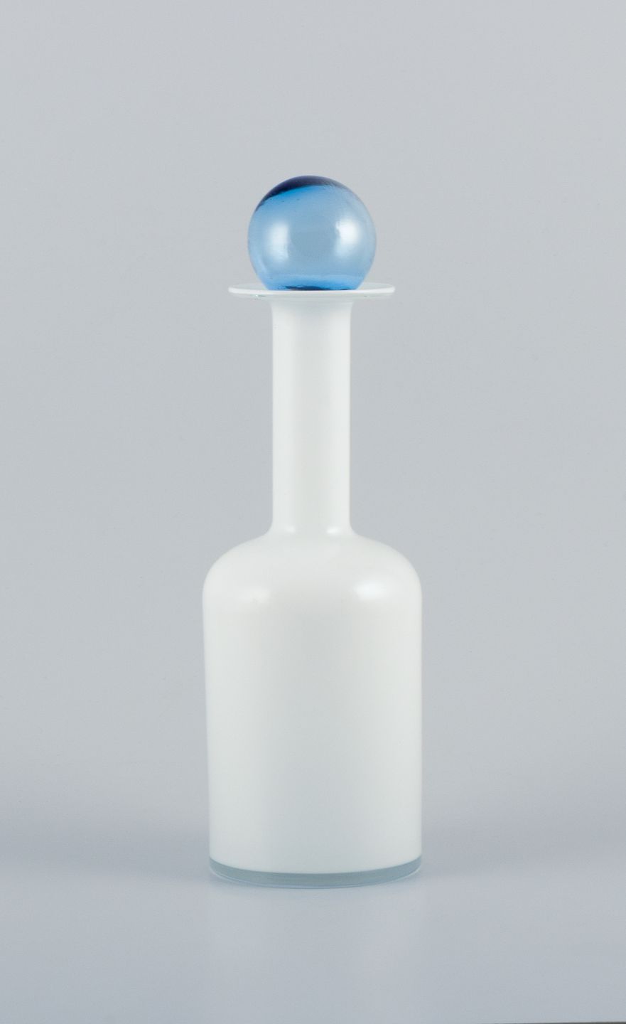 Otto Brauer for Holmegaard. Vase/flaske i hvidt mundblæst kunstglas med lyseblå kugle. 1960'erne. Rester af etiket. I perfekt stand. Mål: H 30,5 cm. (med kugle) x B 8,5 cm.