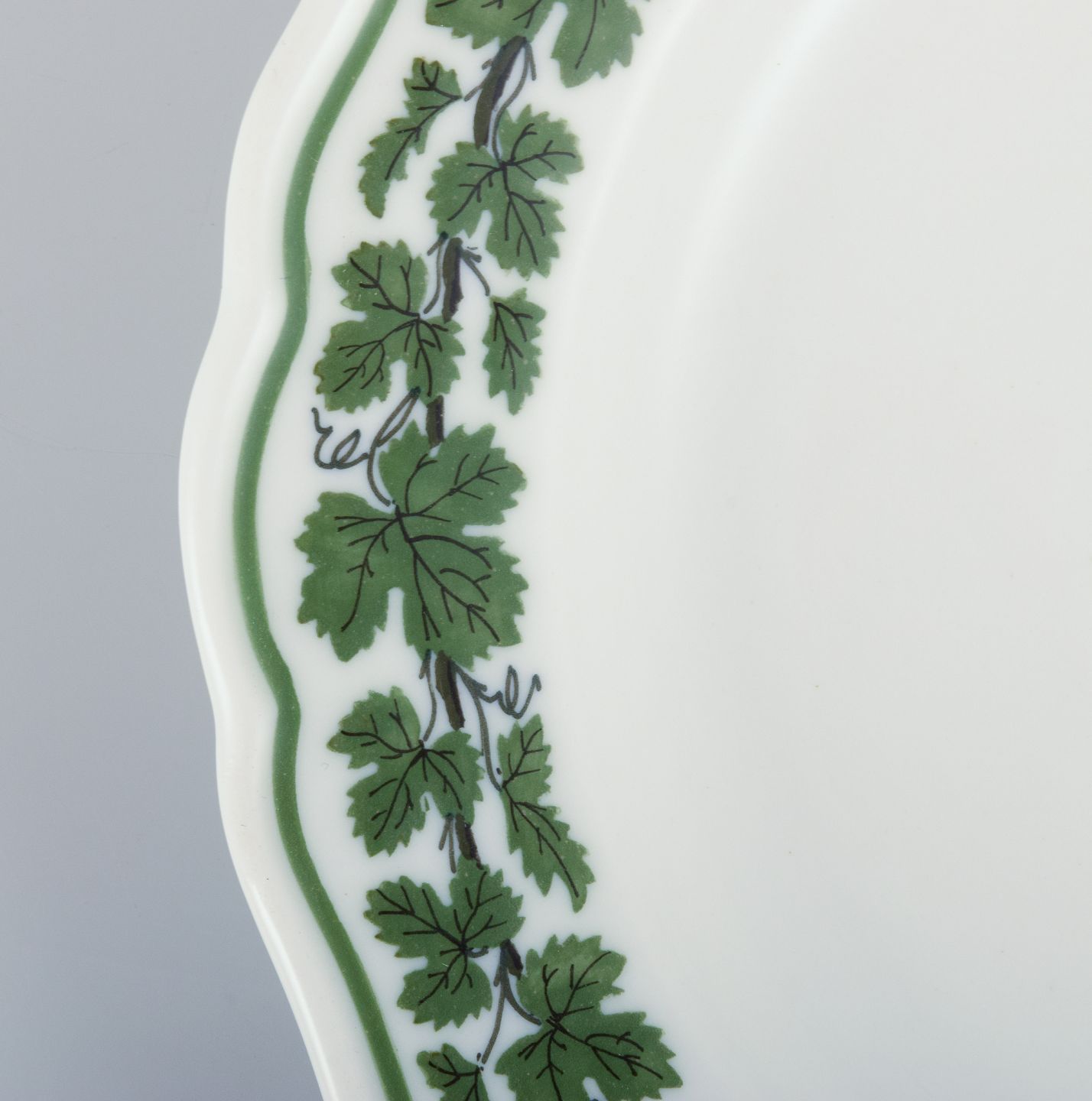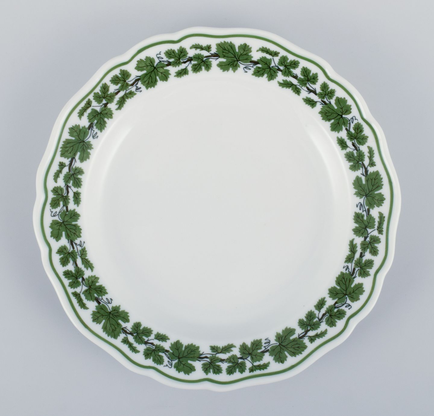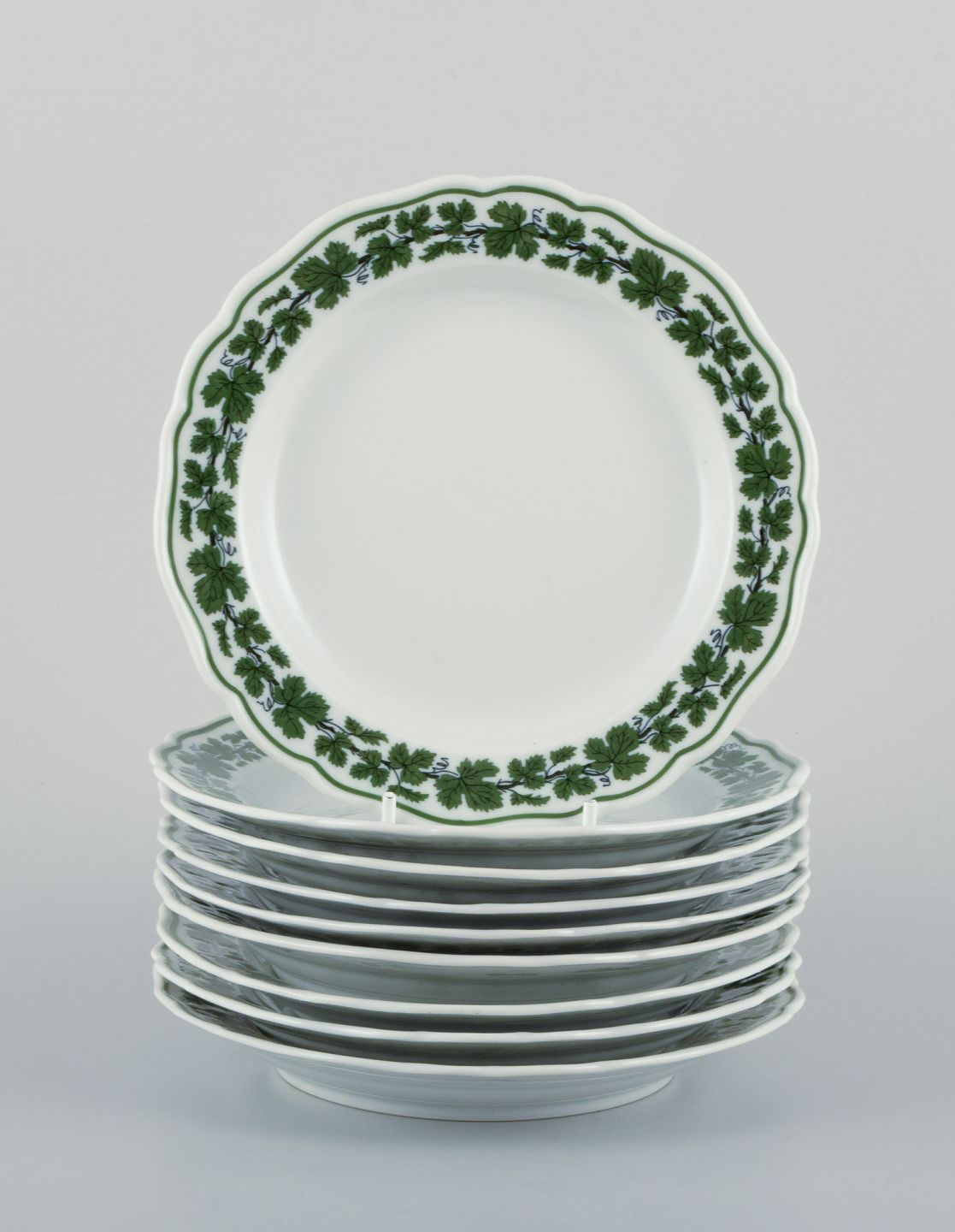 Meissen, Tyskland, Green Ivy Vine, ni tallerkner. Håndmalet. 1930/40’erne. Stemplet. Fem tallerkner i første sortering. Fire tallerkner i tredje sortering. I flot stand. Mål: D 17,6 cm.