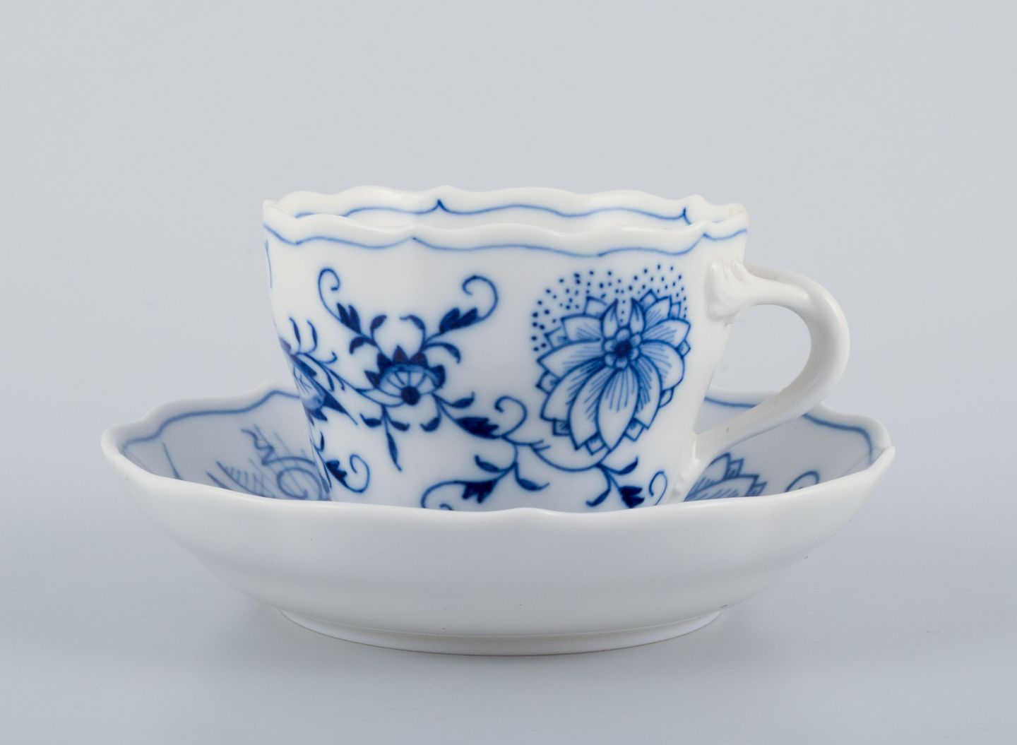 Meissen, Tyskland, et sæt på seks par løgmønstret kaffekopper med tilhørende underkopper. Håndmalet.
