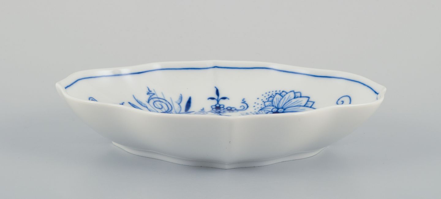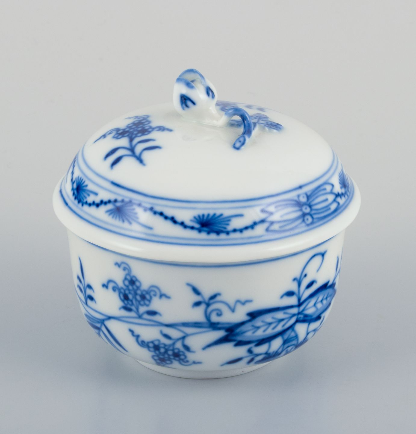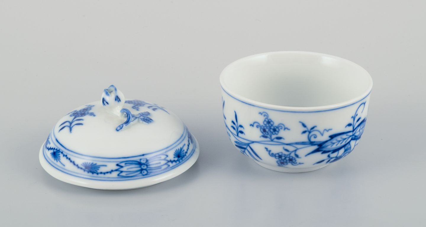 Meissen, Tyskland, løgmønstret sukkerskål og skål. Håndmalet. Midt 1900-tallet. Stemplet. Første sortering. I perfekt stand. Sukkerskål: D 8,0 cm. x H 7,5 cm. Skål: L 18,6 cm. x B 14,4 cm. x H 3,8 cm.