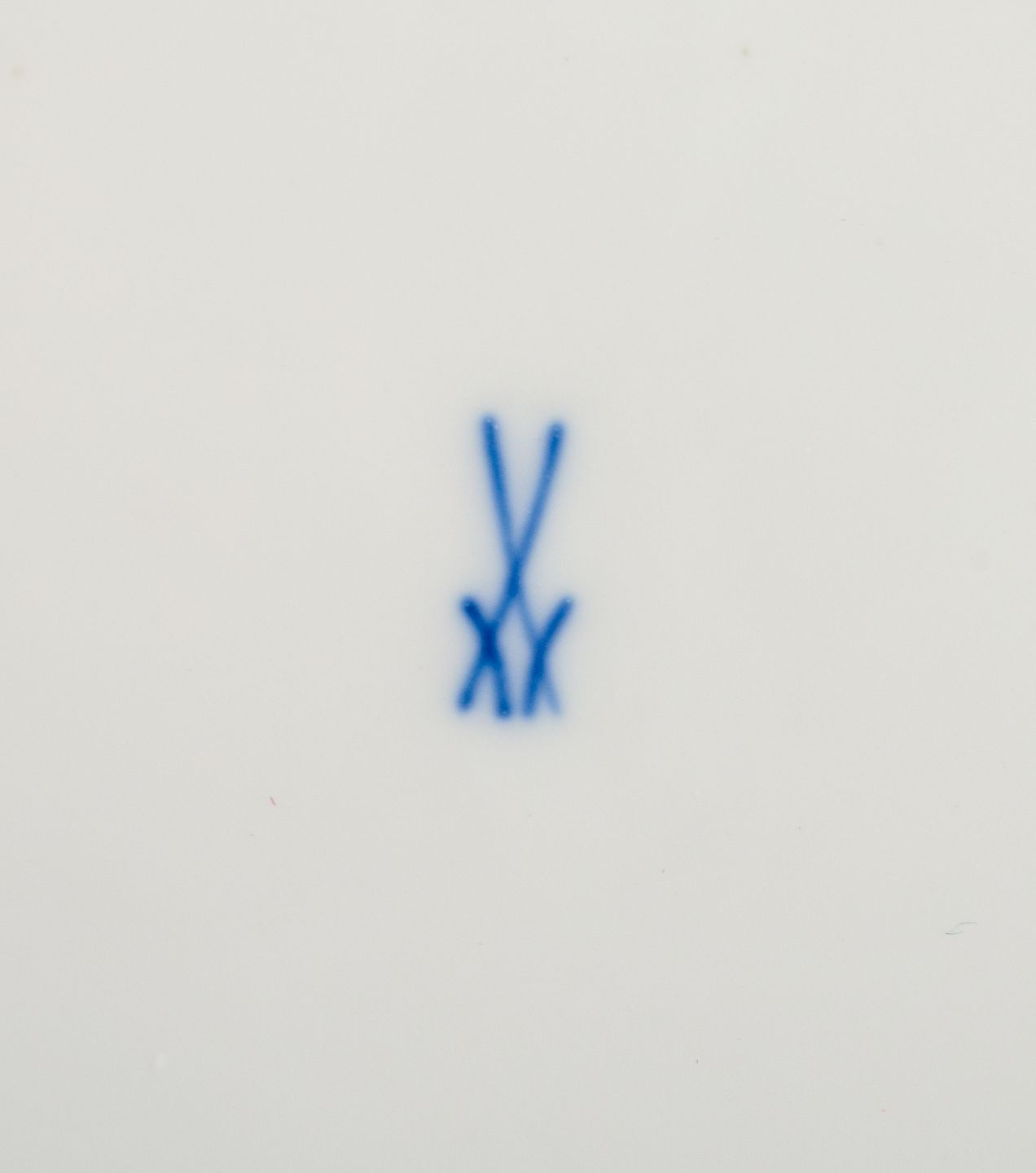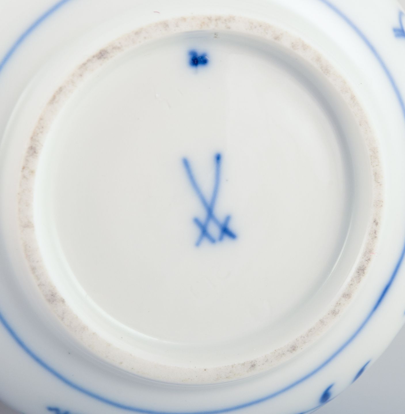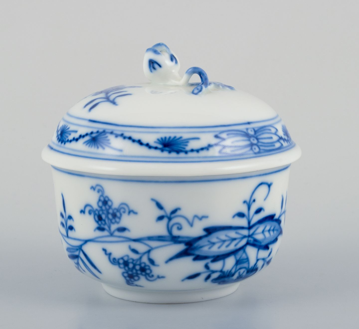 Meissen, Tyskland, løgmønstret sukkerskål og skål. Håndmalet. Midt 1900-tallet. Stemplet. Første sortering. I perfekt stand. Sukkerskål: D 8,0 cm. x H 7,5 cm. Skål: L 18,6 cm. x B 14,4 cm. x H 3,8 cm.