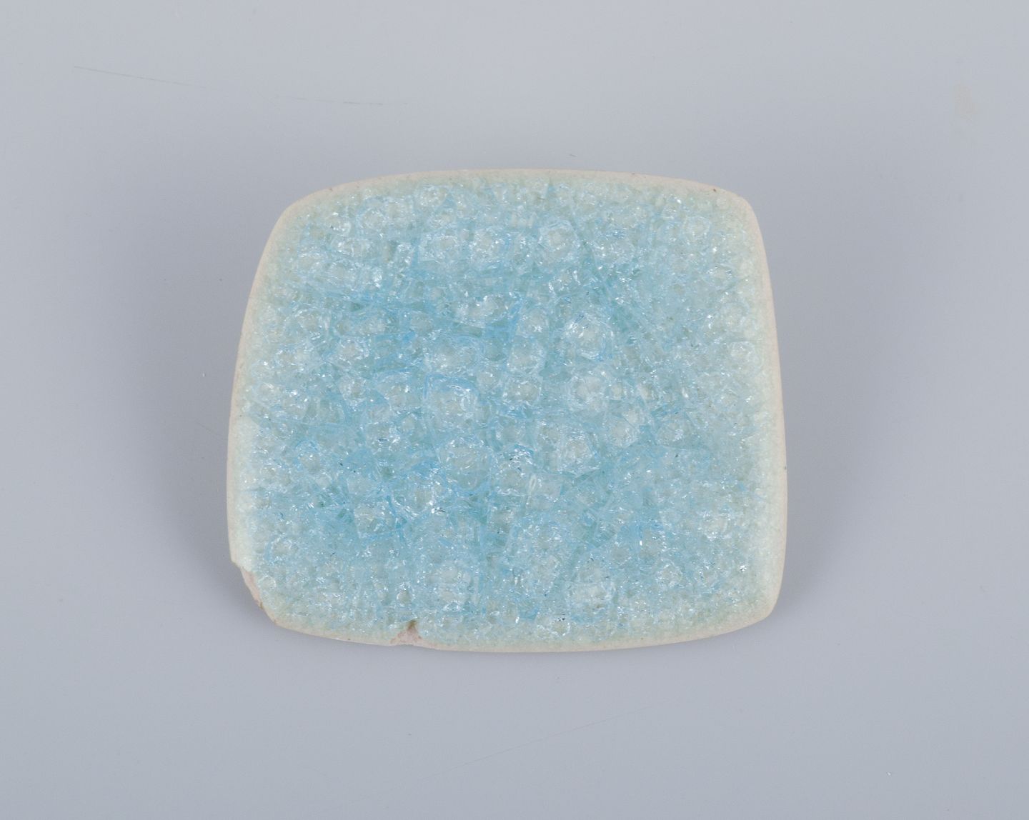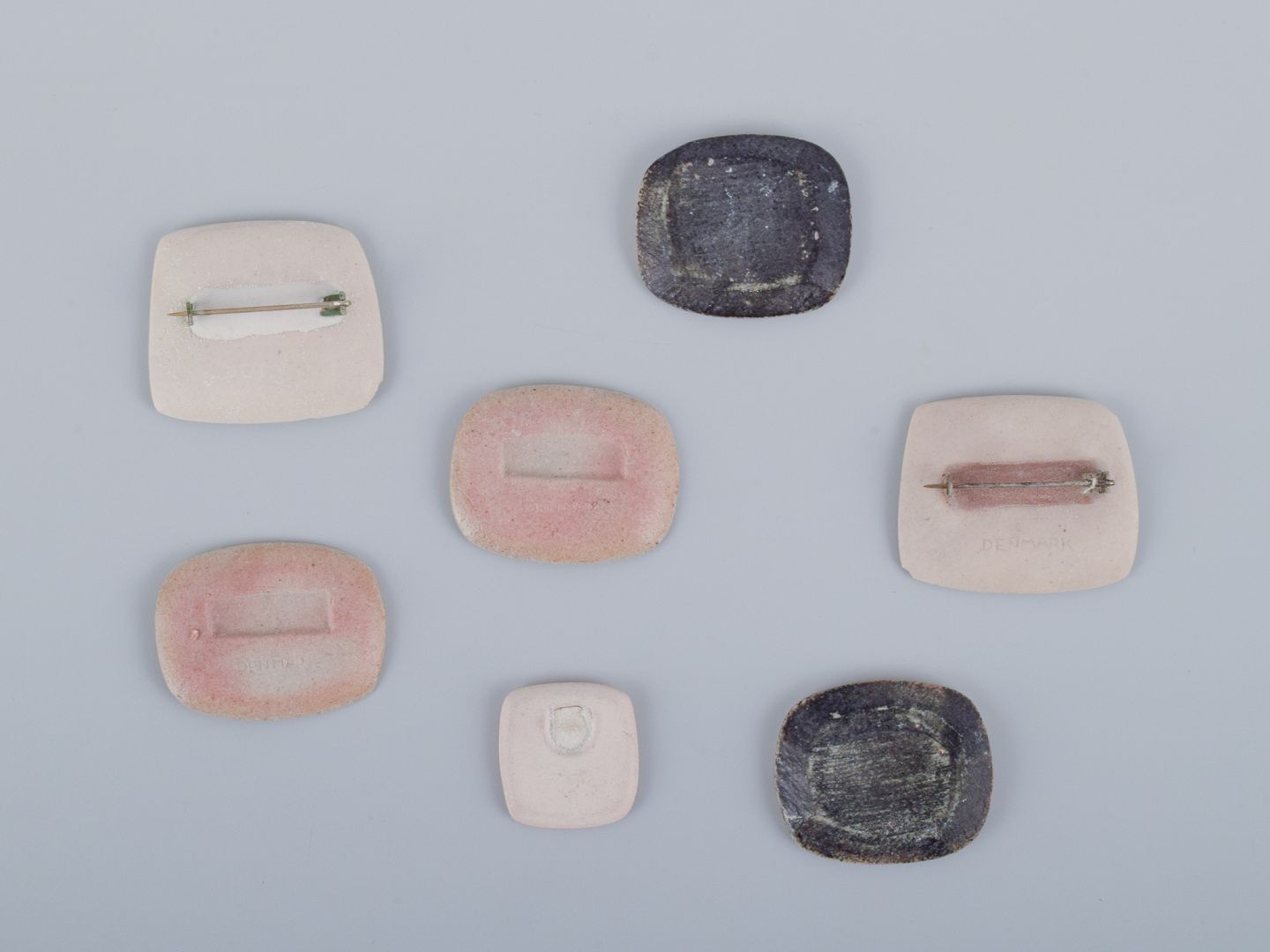 Ole Bjørn Krüger (1922-2007), dansk billedhugger og keramiker. Syv unika brocher i glaseret stentøj i blå og forskellige farver.