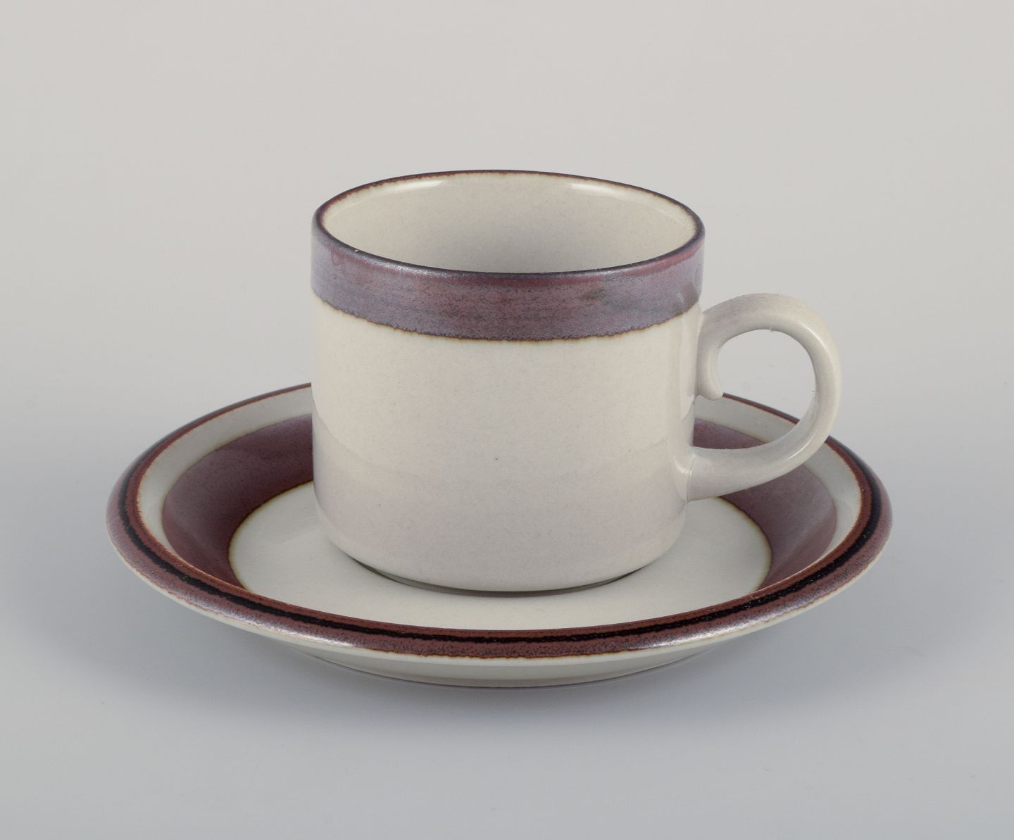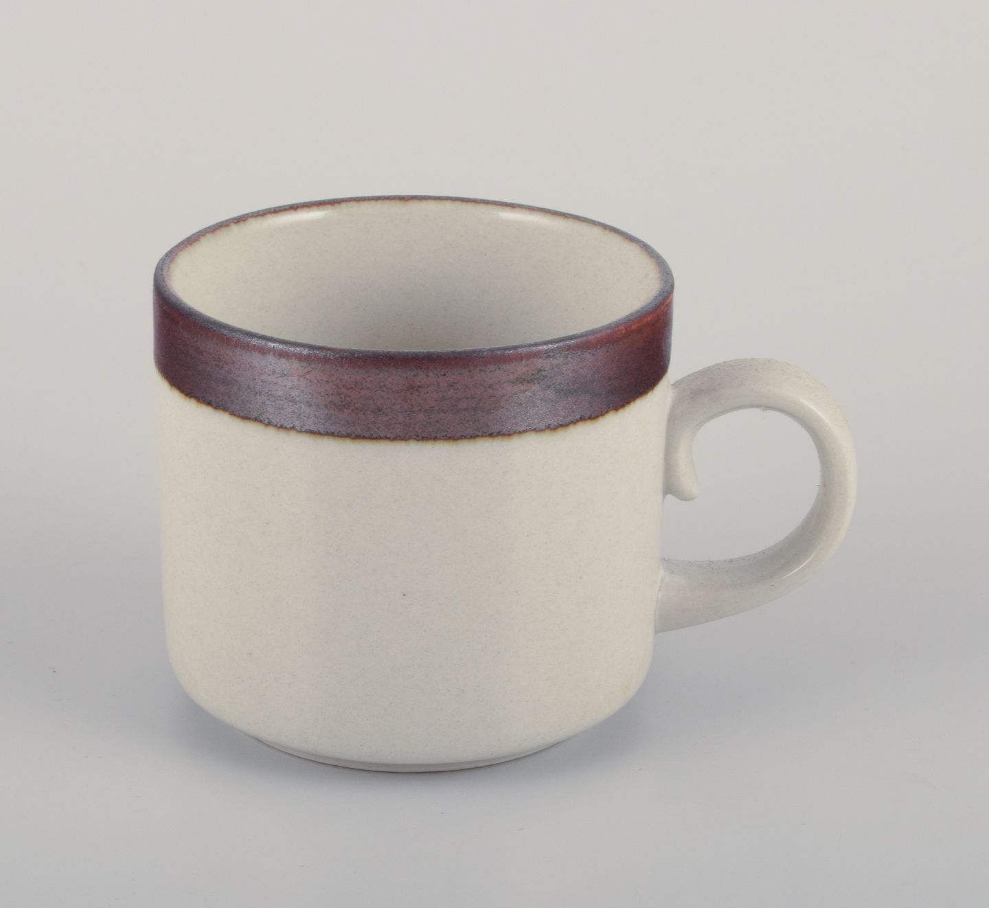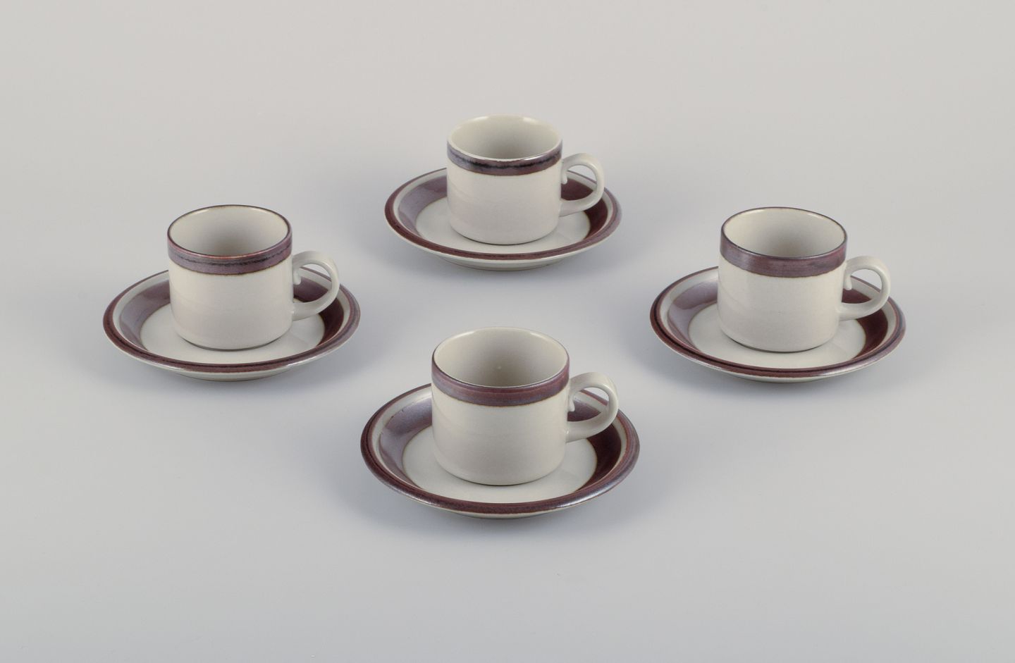 Arabia, Finland. Karelia. Fire sæt små kaffekopper og tilhørende underkopper i stentøj. 1970’erne. Stemplet. Perfekt stand. Kop: H 5,8 cm. x D 6,6 cm. uden hank. Underkop: 13,8 cm.
