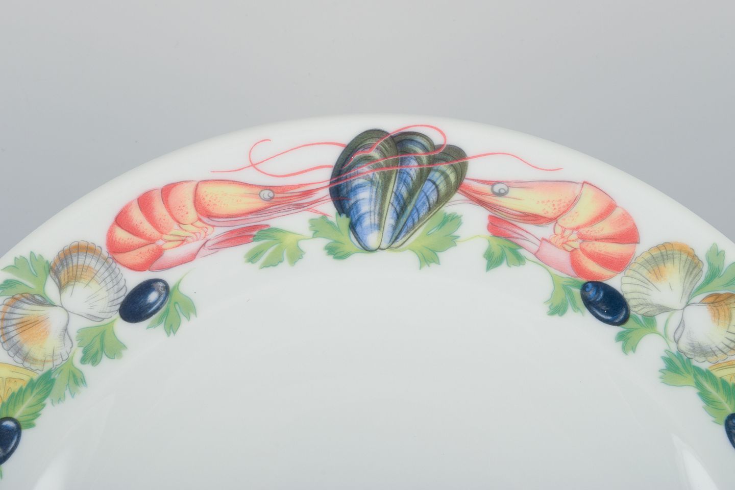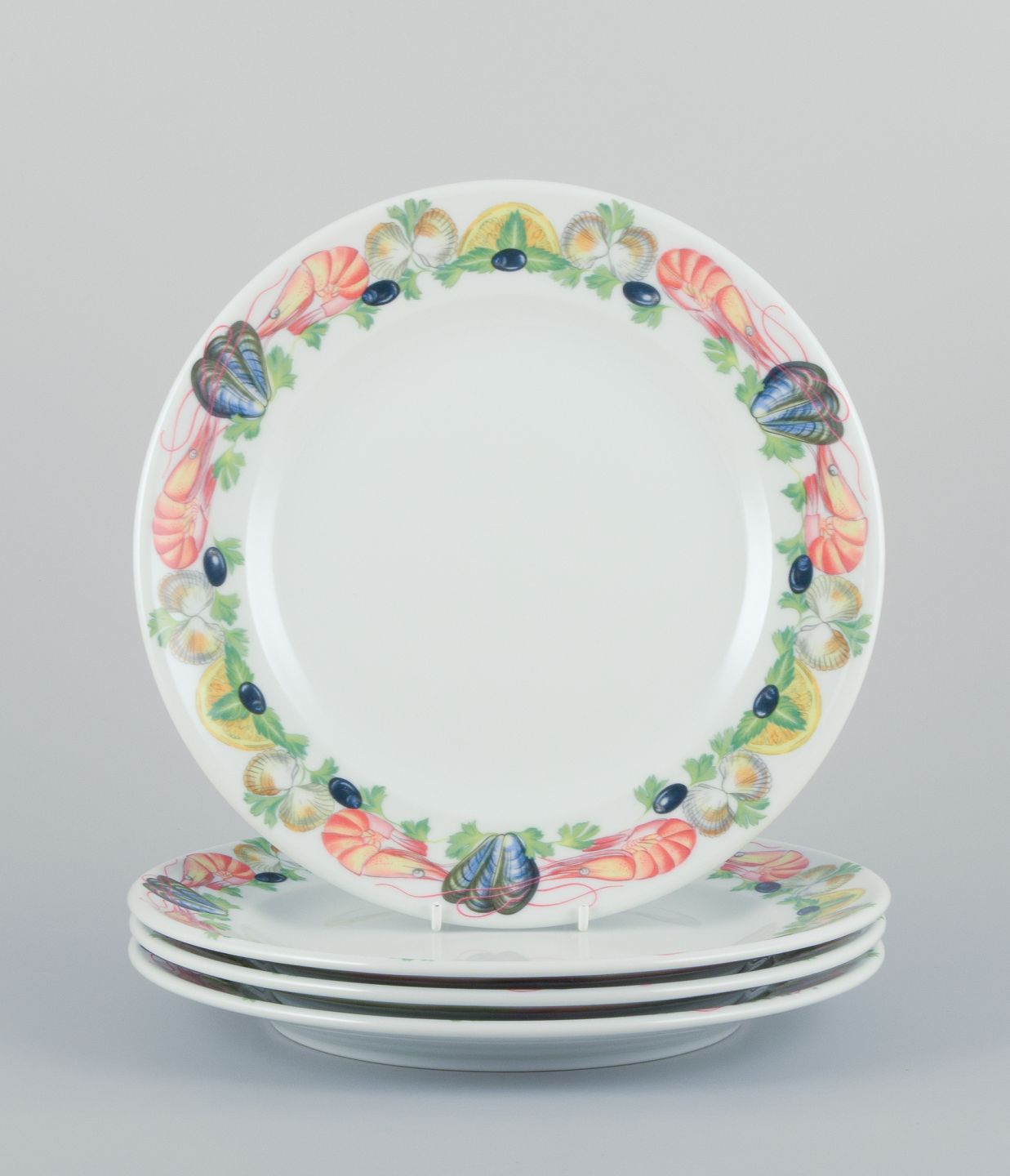Pillivuyt, Frankrig, et sæt på fire store middagstallerkner i porcelæn med motiv af skaldyr. Ca. 1970’erne. Stemplet. Perfekt stand. Mål: D 27,5 cm. x H 2,7 cm.