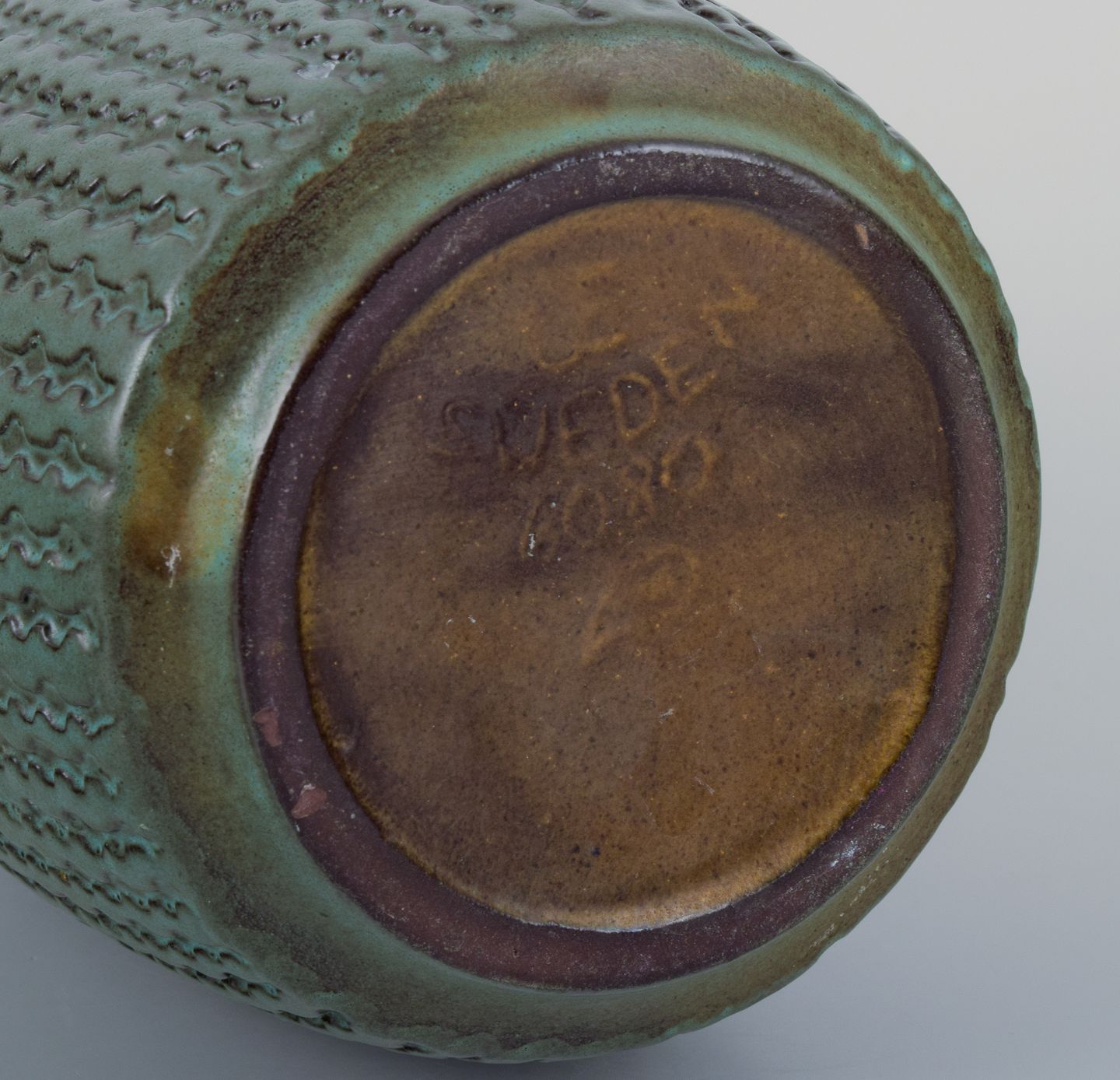 Mari Simmulson (1911-2000) for Upsala Ekeby, Sverige. Keramikvase med geometrisk mønster i grønlig glasur.